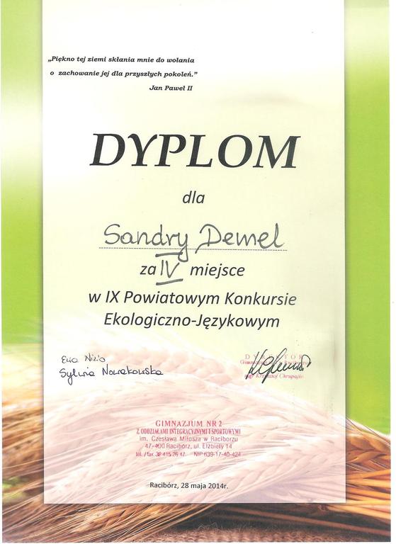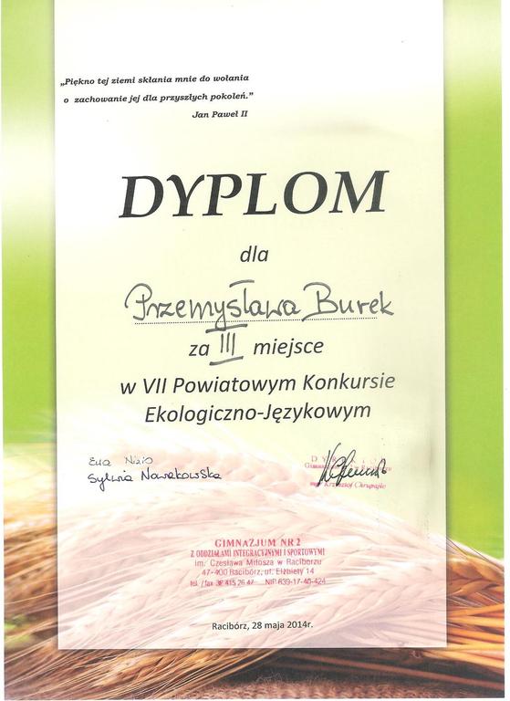 28 maja nasi uczniowie Sandra Demel, Oliwia Mentel i Przemek Burek reprezentowali gimnazjum w Kornowacu w IX Powiatowym Konkursie Ekologiczno – Językowym, którego organizatorem było Gimnazjum nr 2 w Raciborzu. Celem konkursu było zdobywanie i pogłębianie wiedzy dotyczącej ekologii i ochrony środowiska. Test składał się z 20 pytań z ekologii w języku polskim oraz 10 pytań w języku angielskim. Na jego rozwiązanie przeznaczono 45 min. Konkurs zakończył się sukcesem naszych gimnazjalistów – Przemek Burek zdobył III miejsce, a Sandra Demel - IV miejsce. Wszyscy uczestnicy konkursu otrzymali nagrody książkowe.