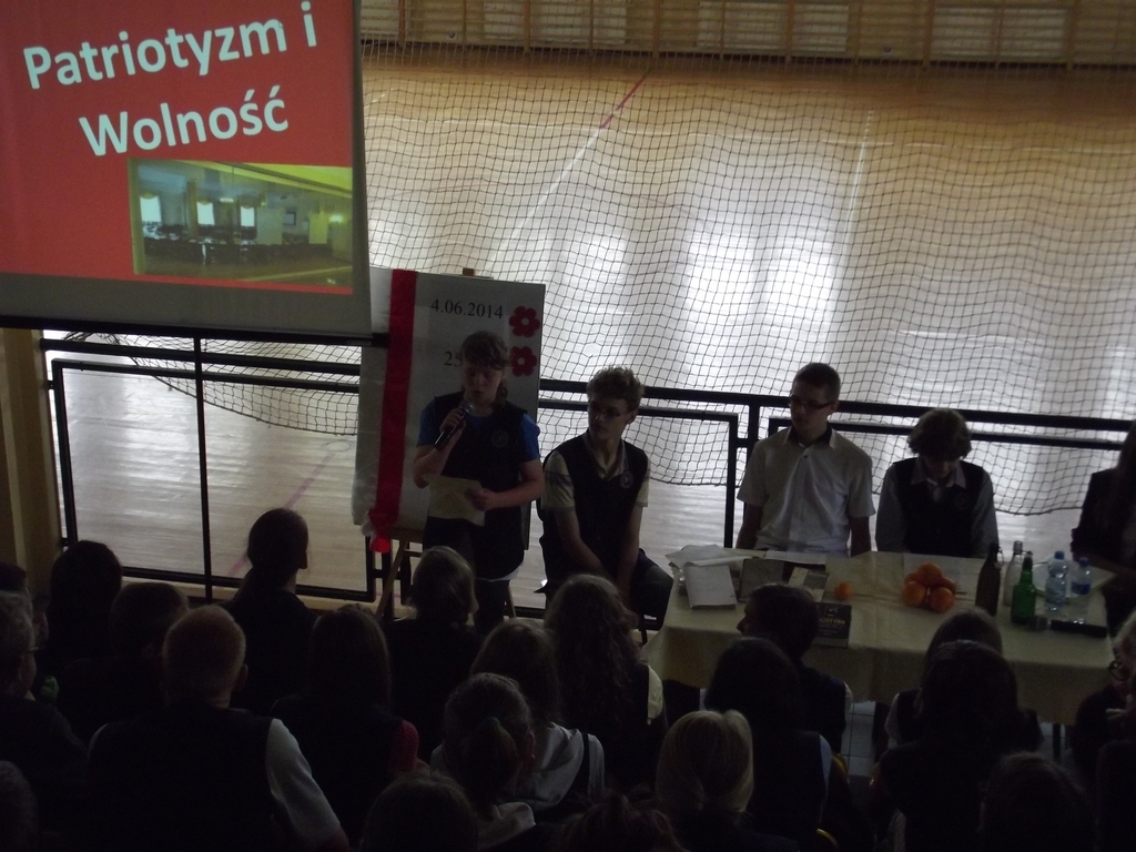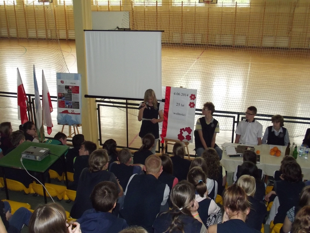 W środę, 4.06.14r. w gimnazjum odbył się apel z okazji 25-lecia Wolności Polski. Na wstępie wysłuchano patriotycznej piosenki zespołu „Golec Orkiestra” pt.” Młody Maj”. Później uczniowie wystawili krótką scenkę pt.”Przełom. Wersja podstawowa 1989”, która przedstawiała życie w czasach komunistycznych i radość ludzi z odzyskanej wolności. Do scenografii użyto rekwizytów z tamtych lat: szklanych butelek, „zakazanych książek”, deficytowych w tamtych czasach pomarańczy. Całość przeplatana była piosenkami i wierszami w wykonaniu gimnazjalistów. Uczniowie klas drugich opracowali prezentację multimedialną na temat Ojczyzny, patriotyzmu i wolności Polaków. Apel zakończono tradycyjnym Polonezem Wojciecha Kilara z filmu „Pan Tadeusz” i przemową pani dyrektor.