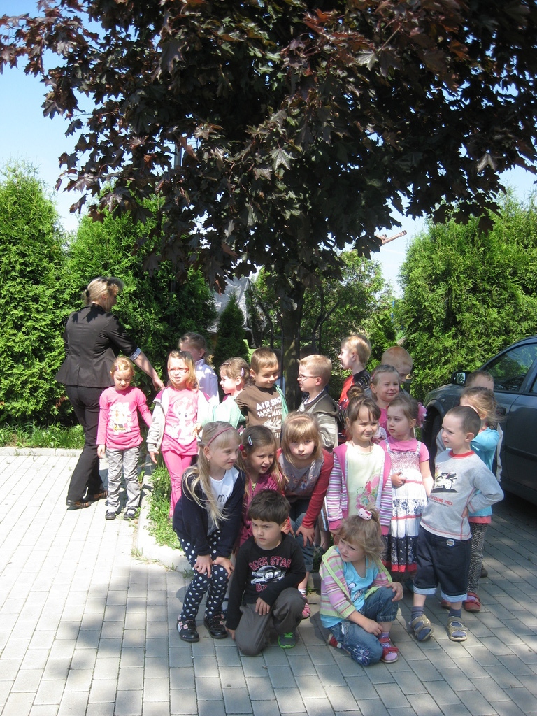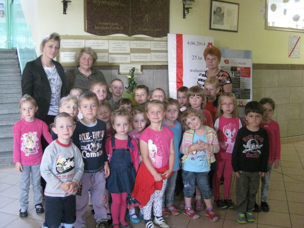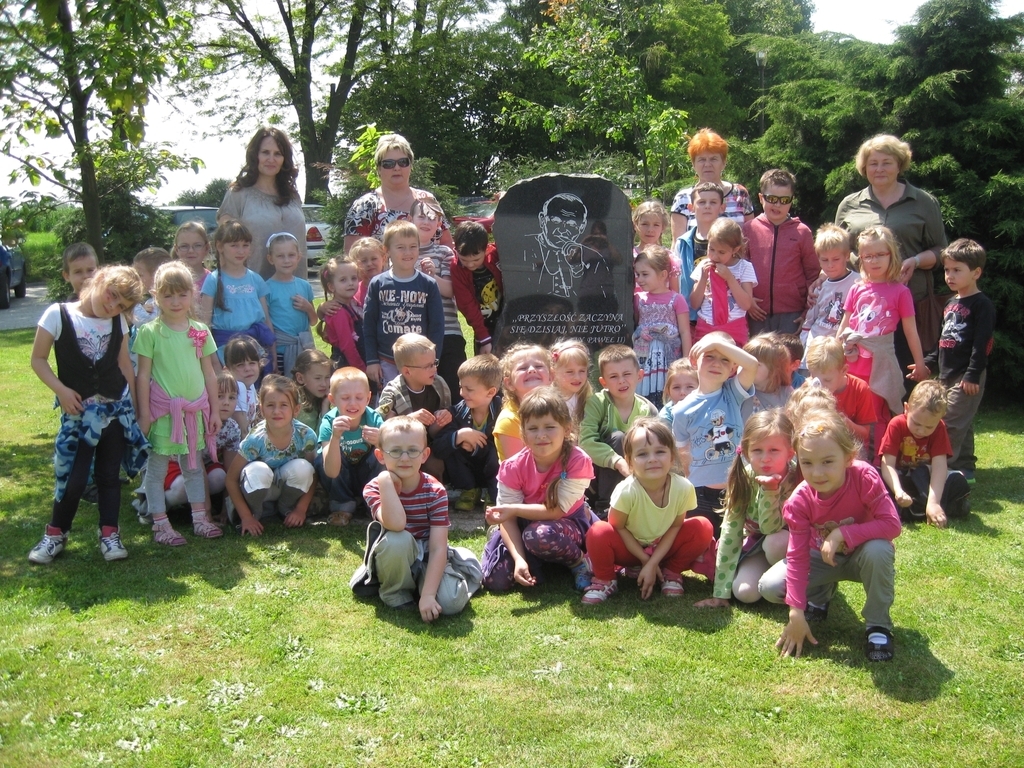 Jest to już druga wizyta w naszym gimnazjum przedszkolaków, którzy zwiedzili Izbę Tradycji poświęconą Patronowi oraz „mini” muzeum. Dzieci miały możliwość obejrzenia pamiątek papieskich zgromadzonych przez naszą szkołę, prac i plakatów uczniów. Najbardziej podobały im się złote róże papieskie przywiezione z Częstochowy. Zachwycali się maśniczką, wirówką do mleka, lampami naftowymi oraz mazelonkami. Jedna z dziewczynek zdobyła się na odwagę i pozwoliła nałożyć na siebie śląski strój razem z wiankiem. Goście oglądali tablicę pamiątkową poświęconą Św. Janowi Pawłowi II, obelisk przed szkołą i szukali drzewa – klonu papieskiego. Przy obelisku przedszkolaki zapalili znicz. W ramach przerwy pobiegali po boisku wielofunkcyjnym oraz sali gimnastycznej. Dzieci zwiedziły także bibliotekę szkolną, gdzie oglądały albumy i książki poświęcone naszemu Patronowi. Na koniec czekał na nich poczęstunek.