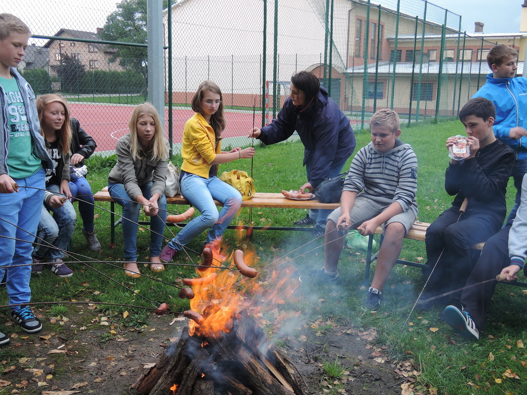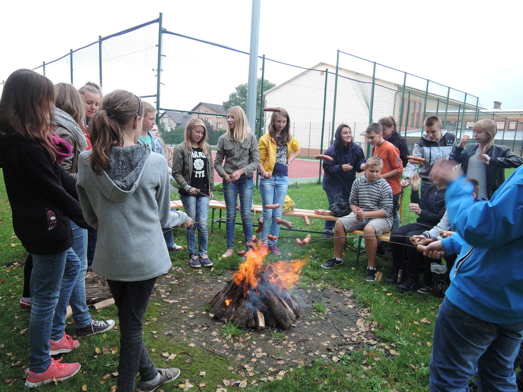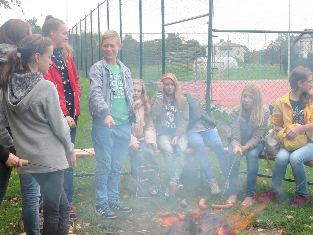 Dnia 23.09.14r. od 17.00 do 19.30 odbywało się ognisko integracyjne klasy IA. W programie było pieczenie kiełbasek, chleba i ziemniaków. Ziemniaki były wykopane ze szkolnego ogródka prowadzonego w ramach projektu Comenius, który znajduje się tuż za orlikiem. Paru osobom kiełbaski wpadły do ogniska. Ks. Roman Sikoń SDB, misjonarz i filmowiec grupy Art.43, który fascynował wszystkich nie tylko swoimi opowieściami, ale także i długą brodą, pomagał tego dnia w realizacji nagrań do projektu edukacyjnego przeprowadzanego przez ks. M. Śnieżyńskiego na kółku filmowym – filmu promującego naszą szkołę i skorzystał z naszego zaproszenia, dzięki czemu nasza klasa wystąpiła w kręconym materiale filmowym. Graliśmy także w piłkę nożną na orliku. Były składy mieszane chłopaków i dziewczyn. Chłopcy z „wielką chęcią” przyjęli dziewczyny do swoich drużyn, zachwyceni ich wielkim talentem piłkarskim po rozegraniu meczu pochwalili je. ;) Chłopcy obijali się na obronie, a dziewczyny atakowały. Dwie dziewczyny były bardzo sprytne i zagadywały bramkarza przeciwnej drużyny, aby ktoś w końcu strzelił bramkę. Po rozegranym meczu musieliśmy ochłonąć, więc udaliśmy się do szkoły na poczęstunek, czyli śmietankową roladę przygotowaną przez Madzię i jej tatę. Podczas spotkania panowała bardzo miła atmosfera. Pani Iwona Knura opowiedziała nam o projekcie Comenius i zachęciła do włączenia się w jego różne akcje. Pani Dyrektor J. Błaszczok i p. K. Szyra opowiadały o wyjazdach zagranicznych, w których uczestniczyły w ramach Comeniusa. Nad sprawnym i bezpiecznym przebiegiem wieczoru czuwała nasza wychowawczyni p. K. Franica. Chcemy podziękować wszystkim nauczycielom, którzy zorganizowali nasze ognisko i byli razem z nami.