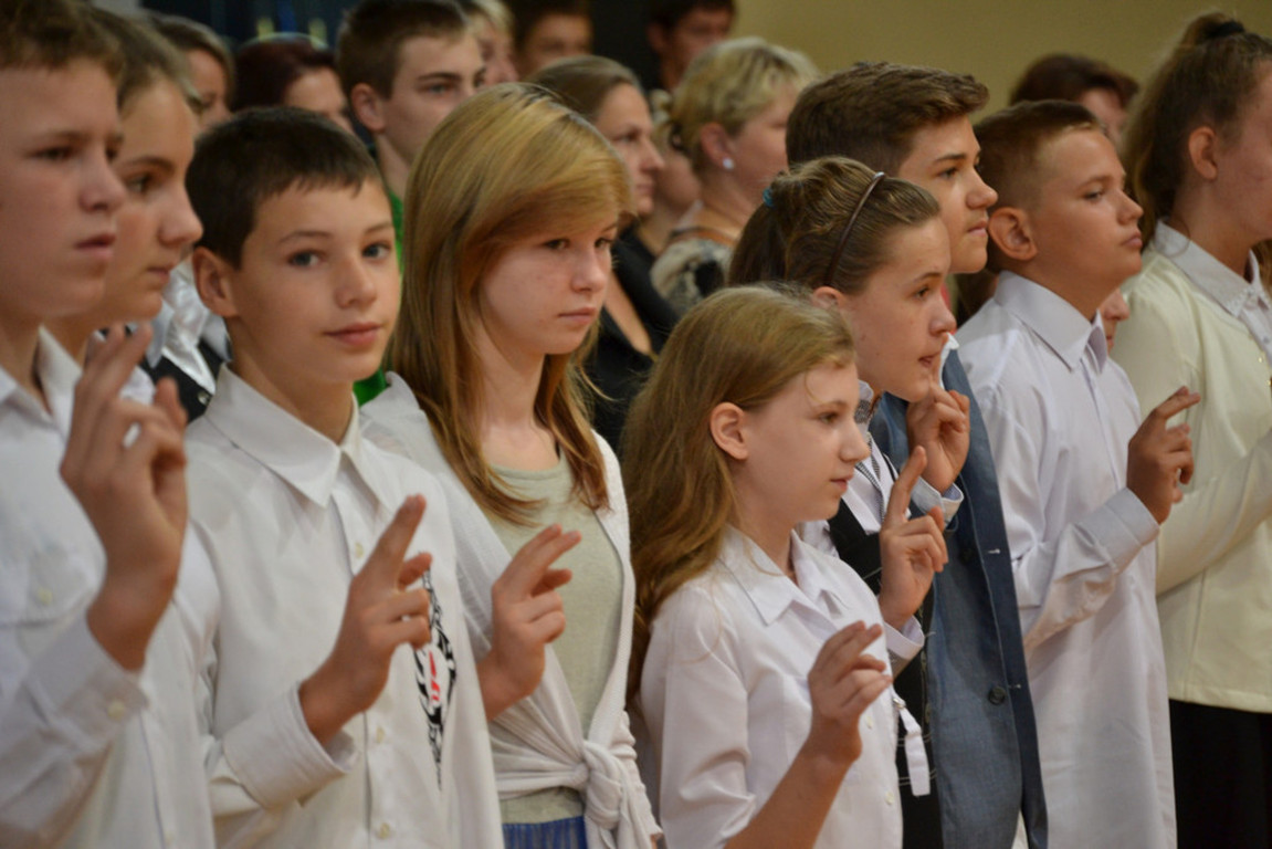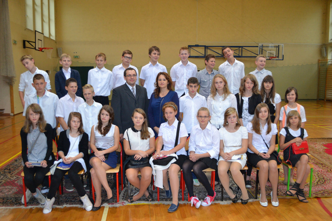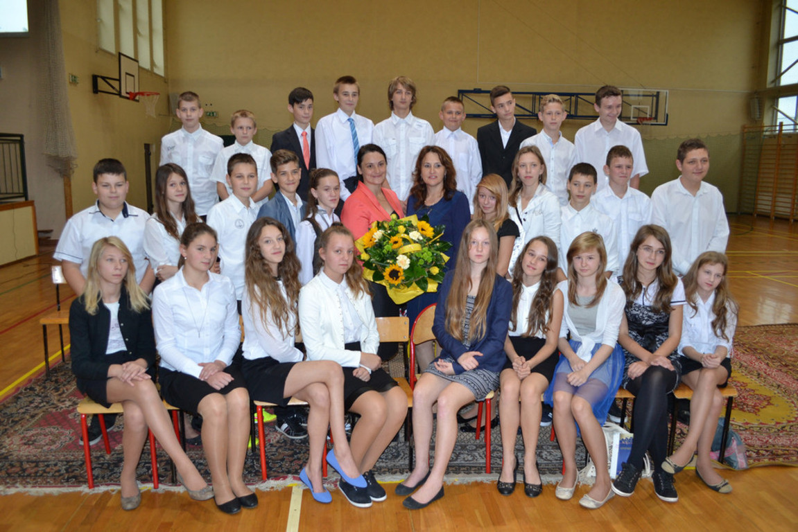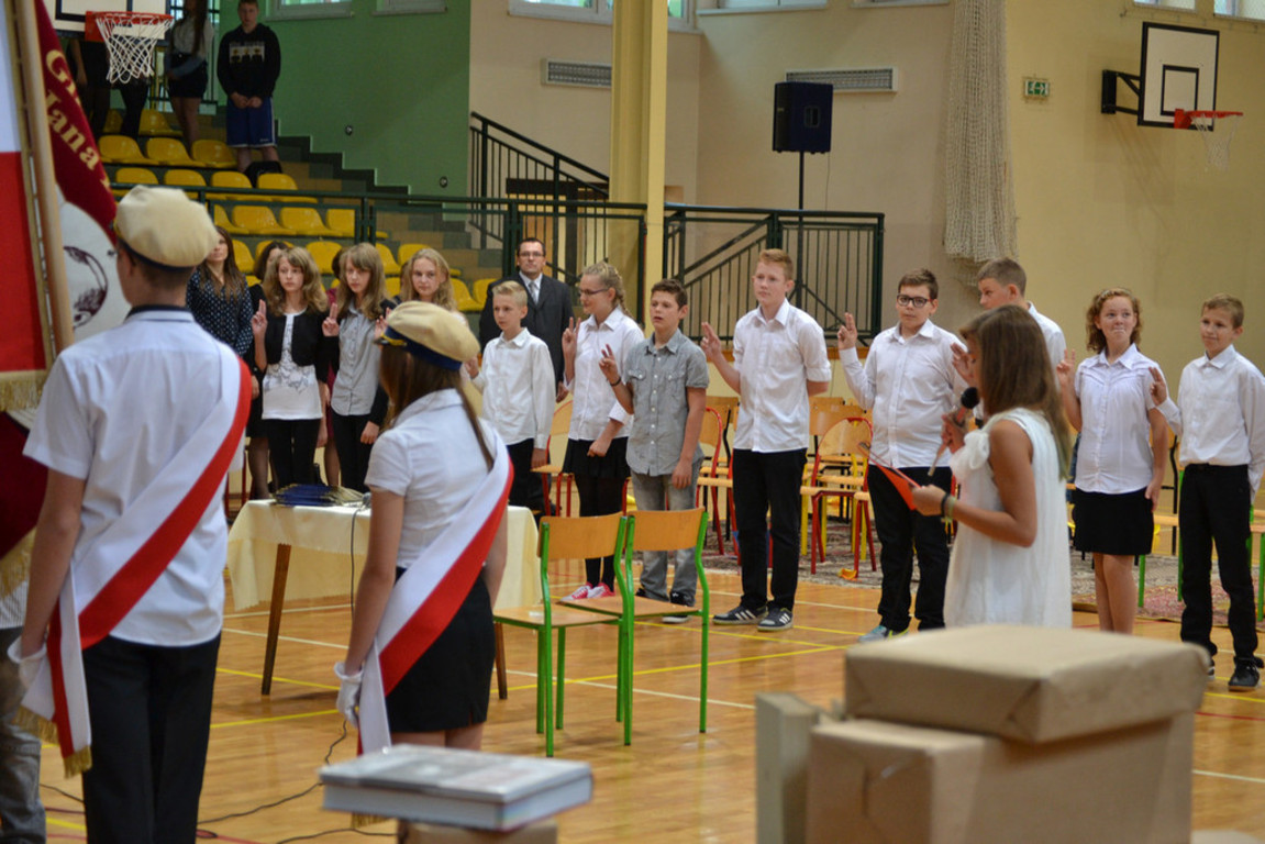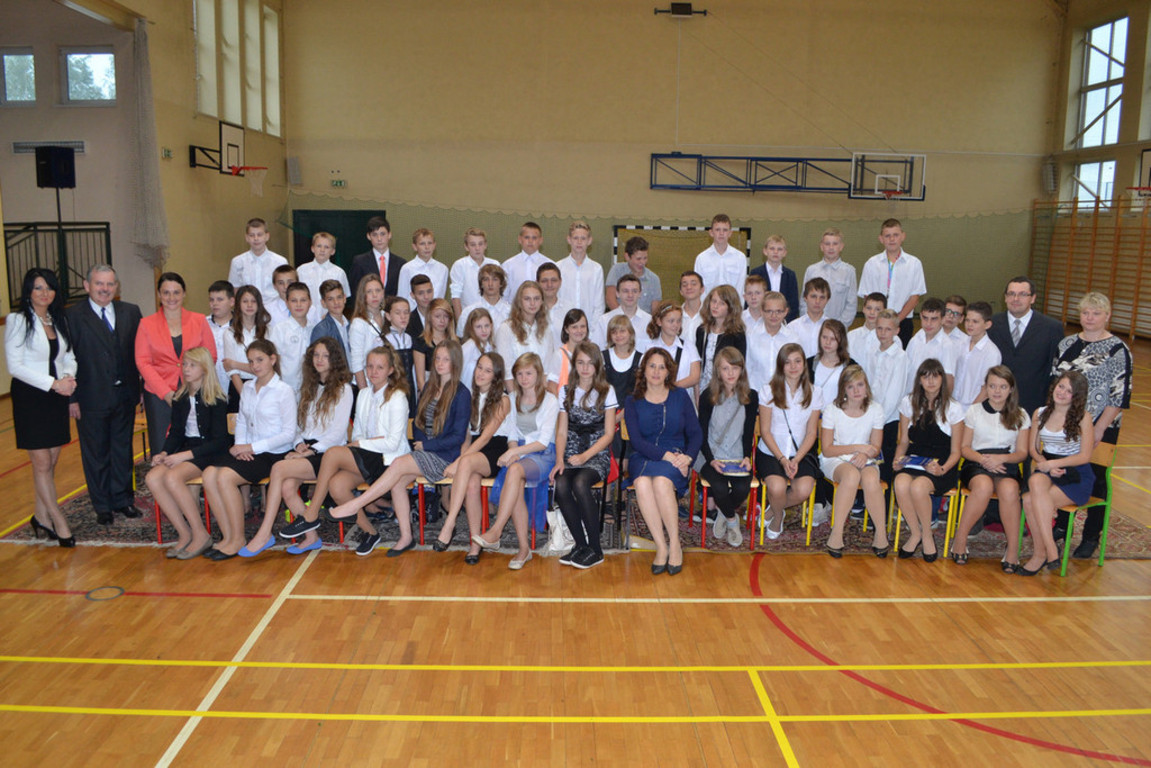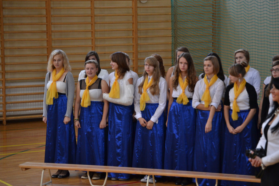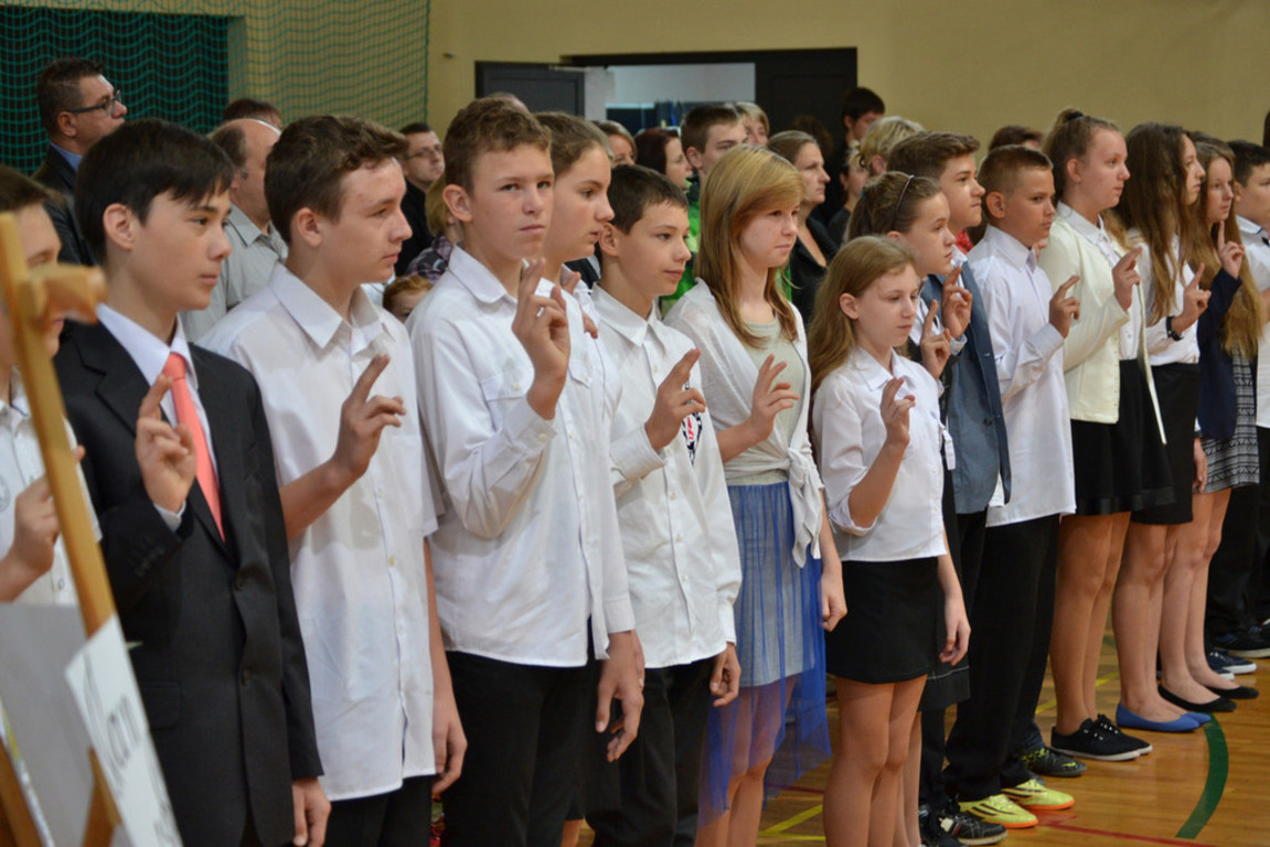 Minęły 44 dni odkąd pierwszy raz wstąpili w mury naszej szkoły jako jej uczniowie. W tym czasie mieli możliwość poznać zwyczaje i prawa tu panujące, nowych kolegów, wymagania nauczycieli i na aklimatyzację. Nawiązały się nowe przyjaźnie, a stare umocniły. Kl. Ia i kl. Ib wraz z wychowawcami p. Katarzyną Franicą i p. Tomaszem Kozielskim w ostatnich dniach intensywnie przygotowywali się do tego jakże ważnego wydarzenia – do ślubowania, jakie dziś zostało złożone. 14. października to najlepsza data – święto edukacji, a zarazem święto szkoły upamiętniające patrona św. Jana Pawła II. Uroczystość swoją obecnością uświetnili rodzice i opiekunowie większości pierwszoklasistów, wśród nich p. Dyrektor naszego gimnazjum i przedstawiciel gminy p. Michał Krasek, a także ks. Proboszcz Tadeusz Augustyn SDB oraz delegacja Rady Rodziców. Pierwszoklasiści wzięli udział w programie wprowadzającym do ślubowania wykazując się sporą dozą poczucia humoru. Część z nich miała możliwość pokazania swoich talentów estradowych. Najważniejsza chwila miała miejsce w obecności sztandaru. Wszyscy zgromadzeni odśpiewali hymn państwowy, następnie z wielką powagą pierwszoklasiści powtórzyli słowa przyrzeczenia, podpisano akt ślubowania, a na koniec wykonano pamiątkowe zdjęcia. Po uroczystościach zaproszeni goście oraz wszyscy ślubujący wzięli udział w słodkim poczęstunku.