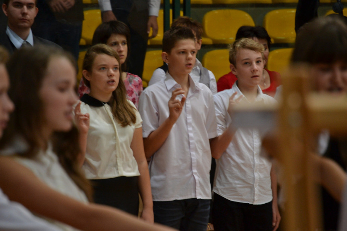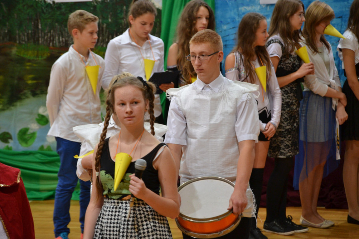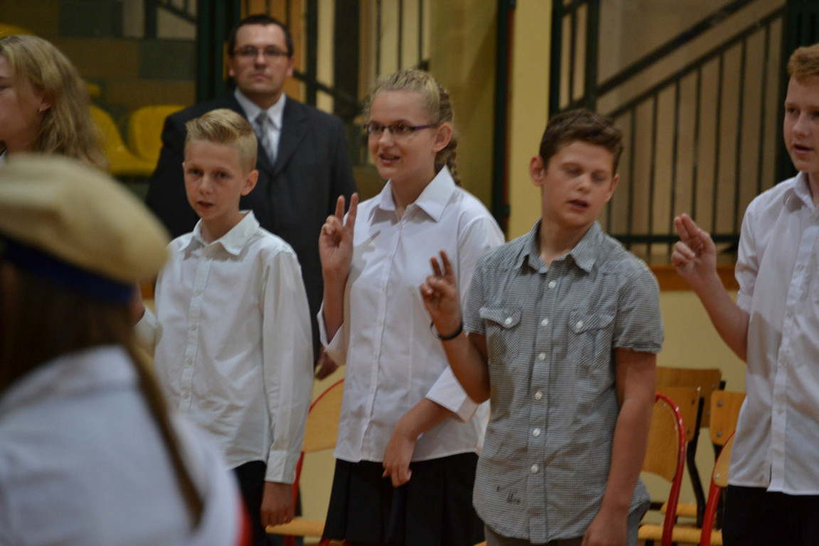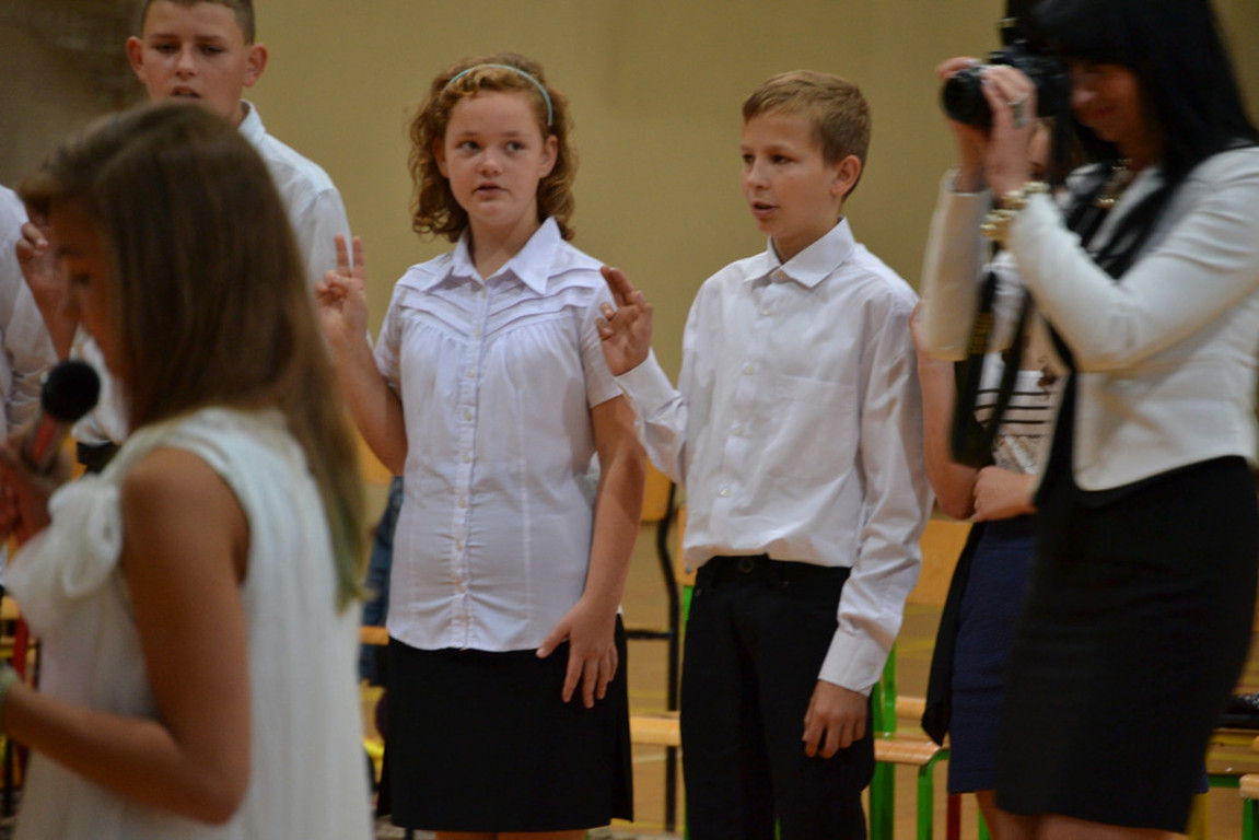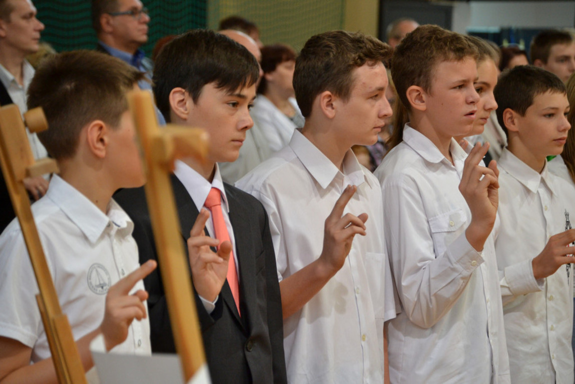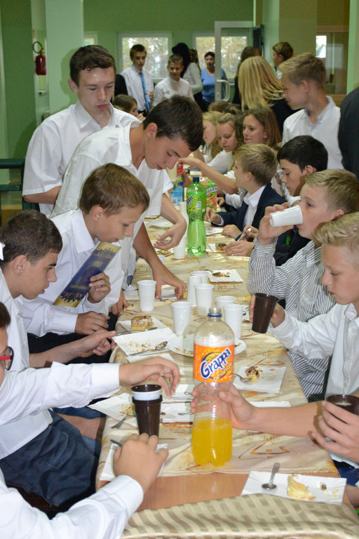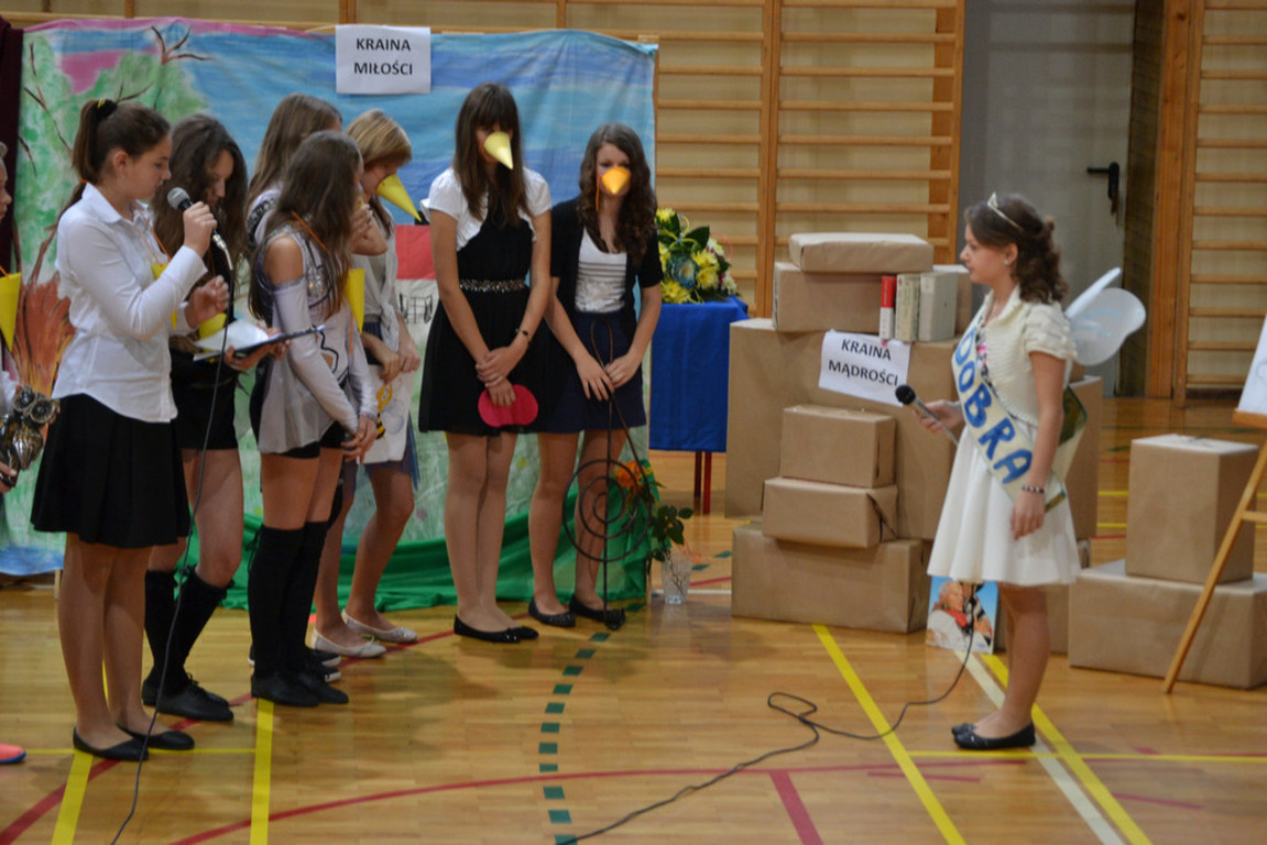Minęły 44 dni odkąd pierwszy raz wstąpili w mury naszej szkoły jako jej uczniowie. W tym czasie mieli możliwość poznać zwyczaje i prawa tu panujące, nowych kolegów, wymagania nauczycieli i na aklimatyzację. Nawiązały się nowe przyjaźnie, a stare umocniły. Kl. Ia i kl. Ib wraz z wychowawcami p. Katarzyną Franicą i p. Tomaszem Kozielskim w ostatnich dniach intensywnie przygotowywali się do tego jakże ważnego wydarzenia – do ślubowania, jakie dziś zostało złożone. 14. października to najlepsza data – święto edukacji, a zarazem święto szkoły upamiętniające patrona św. Jana Pawła II. Uroczystość swoją obecnością uświetnili rodzice i opiekunowie większości pierwszoklasistów, wśród nich p. Dyrektor naszego gimnazjum i przedstawiciel gminy p. Michał Krasek, a także ks. Proboszcz Tadeusz Augustyn SDB oraz delegacja Rady Rodziców. Pierwszoklasiści wzięli udział w programie wprowadzającym do ślubowania wykazując się sporą dozą poczucia humoru. Część z nich miała możliwość pokazania swoich talentów estradowych. Najważniejsza chwila miała miejsce w obecności sztandaru. Wszyscy zgromadzeni odśpiewali hymn państwowy, następnie z wielką powagą pierwszoklasiści powtórzyli słowa przyrzeczenia, podpisano akt ślubowania, a na koniec wykonano pamiątkowe zdjęcia. Po uroczystościach zaproszeni goście oraz wszyscy ślubujący wzięli udział w słodkim poczęstunku.