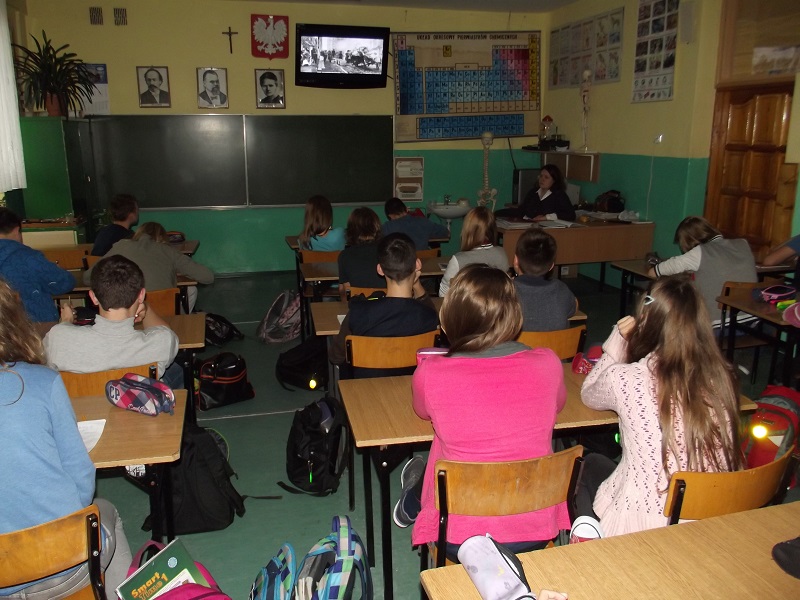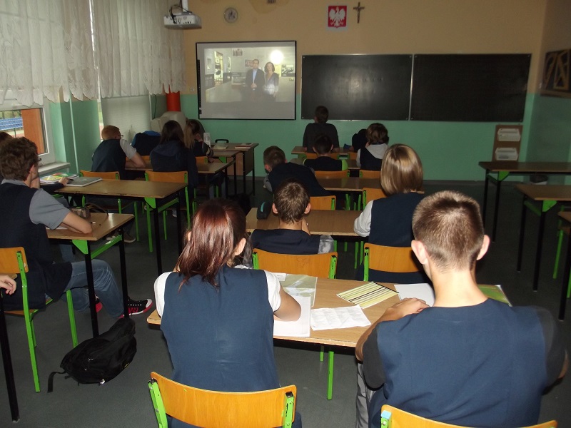 W czwartek, tj. 23.10.2014 roku wszyscy gimnazjaliści brali udział, przez Internet, w transmisji „Opowieści o Żydach polskich. Lekcja na żywo”. Patronami przedsięwzięcia są TVP Historia i Program 1 Polskiego Radia. Podczas tej nowoczesnej lekcji historii Maria Seweryn i Maciej Orłoś oprowadzali uczniów i nauczycieli po wystawie stałej Muzeum Historii Żydów Polskich POLIN. Wystawa stała ma charakter narracyjny. Oglądający mogli zanurzyć się w historii opowiadanej przez zabytkowe przedmioty, malowidła, instalacje interaktywne, rekonstrukcje i makiety, projekcje video, dźwięki i teksty. Uczniowie zapoznali się z kolejnymi etapami Żydów polskich od legend o przybyciu na nasze ziemie, przez pierwsze ich osadnictwo, rozwój kultury, różnorodności społecznej, religijnej i politycznej, burzliwe wydarzenia sprzed wieków i czas zagłady, aż do współczesności. Oficjalne otwarcie tego nowoczesnego muzeum odbędzie się 28 października br.