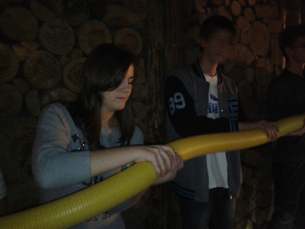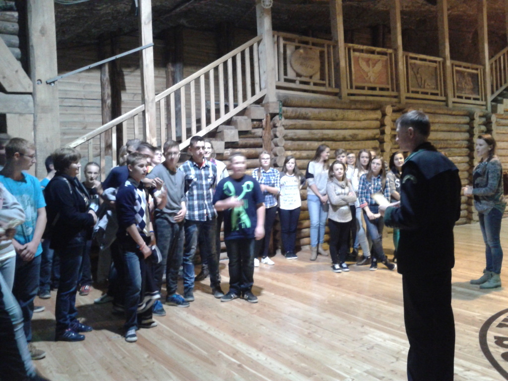 Przed zjazdem szybem Campi na głębokość 230 metrów, uczniowie mieli okazję zobaczyć maszynę parową, dzięki której kiedyś wprowadzano powietrze do kopalni. Następnie zjechali górniczą szolą pod ziemię. Po tej niebywałej atrakcji rozpoczęła się część właściwa wycieczki, czyli zwiedzanie kopalni połączone z zajęciami sportowymi – „Przygoda w solnych górach” oraz pobyt nocny. Szczególną atrakcją bocheńskiej kopalni była ekspozycja multimedialna, dzięki której poznaliśmy historię wydobycia soli, trud górniczej pracy a także historię Polski. Zwiedzanie kopalni urozmaicone było zmaganiami poszczególnych grup, gdyż gimnazjaliści musieli wykonać zadania, które polegały na: budowie kaszty, piłowaniu drewnianej belki, budowie wodociągu, skręcaniu liny ze sznurka, odmierzaniu 20 g soli oraz najważniejszej, w czasie której oceniana była w skali od 1- 10 grzeczność grupy. W tej konkurencji wszyscy otrzymali maksymalną liczbę punktów co potwierdza, że nasi uczniowie potrafią się odpowiednio zachować! Tutaj także uczniowie mieli możliwość przejechania się podziemną kolejką oraz zjazdu 150 m zjeżdżalnią na specjalnych poduszkach, łączącą dwa poziomy kopalni. Podczas pobytu pod ziemią uczniowie zjedli kolację i śniadanie, grali w piłkę na sali gimnastycznej oraz bawili się do północy na dyskotece. Dużą atrakcją dla młodzieży był zdrowotny na drogi oddechowe nocleg na piętrowych łóżkach w Komorze Ważyn.