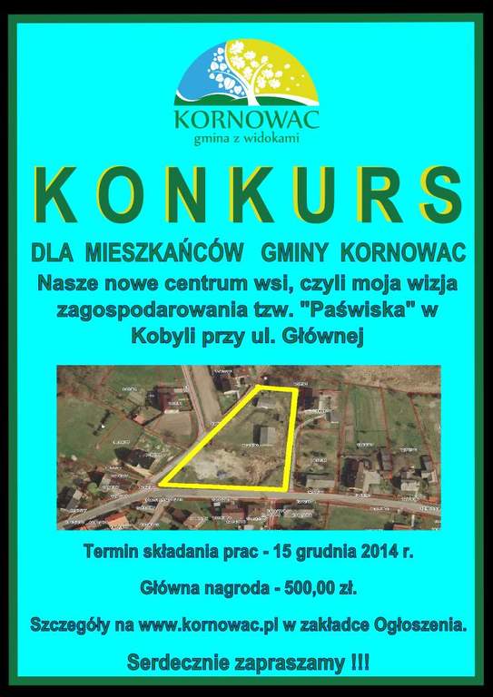 Gmina Kornowac ogłasza konkurs „Nasze nowe centrum wsi, czyli moja wizja zagospodarowania tzw. „Paświska” w Kobyli przy ul. Głównej”.