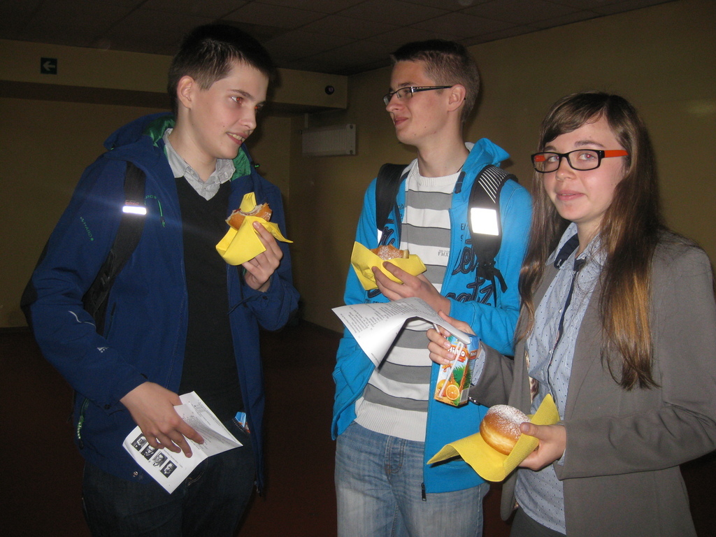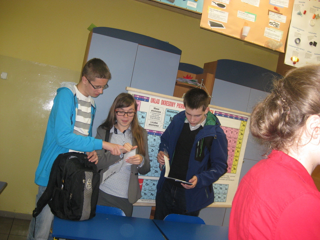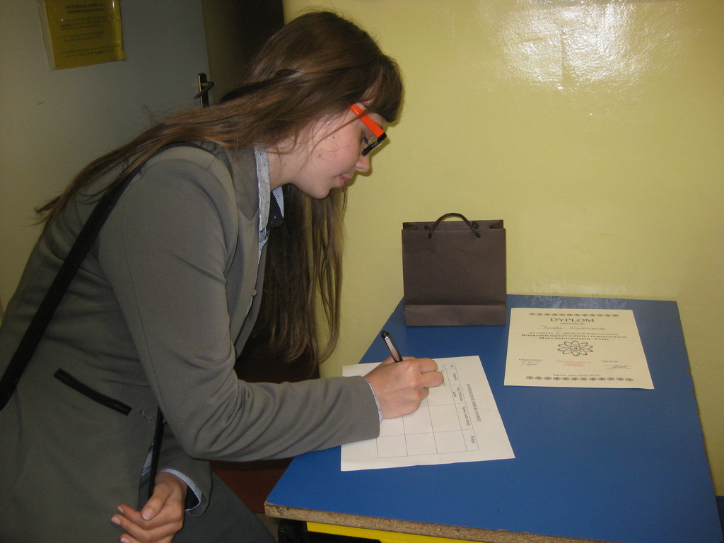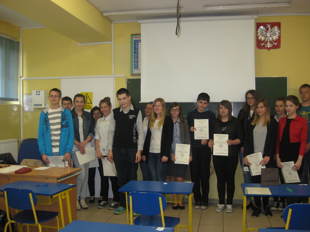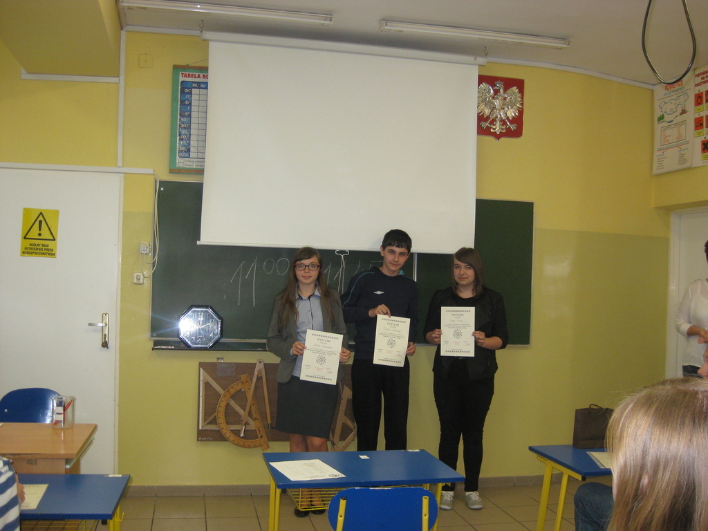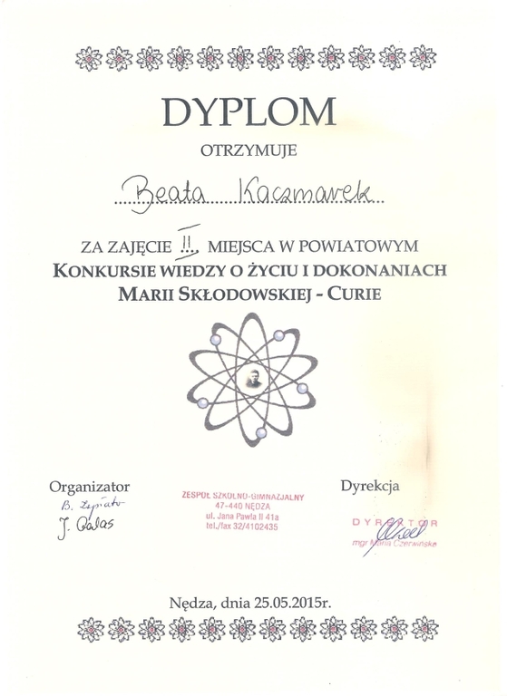 W poniedziałek 25 maja gimnazjaliści – Beata Kaczmarek, Jakub Iksal i Piotr Krolik wzięli udział w powiatowym „Konkursie o życiu i dokonaniach Marii Skłodowskiej – Curie” organizowanym przez Zespół Szkolno - Gimnazjalny w Nędzy. W pierwszej części uczestnicy zmagali się z testem dotyczącym życia i pracy Noblistki. W drugim etapie, zakwalifikowani uczniowie, rozwiązywali zadania z promieniotwórczości. Konkurs zakończył się sukcesem dla naszej uczennicy – Beata Kaczmarek (Kl. IIIB, która zajęła drugie miejsce. Warto przypomnieć, że w ubiegłym roku Beata uzyskała miejsce pierwsze. Serdecznie gratulujemy i życzymy dalszych sukcesów!!! Uczniów do konkursu przygotowała A. Kowalska.