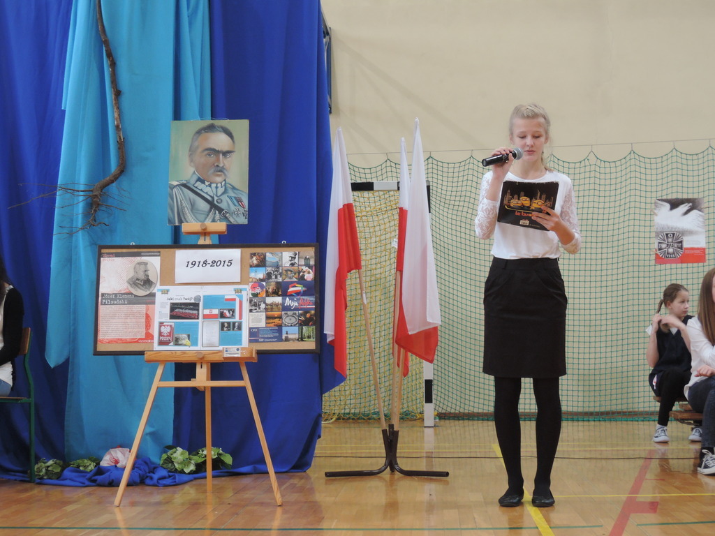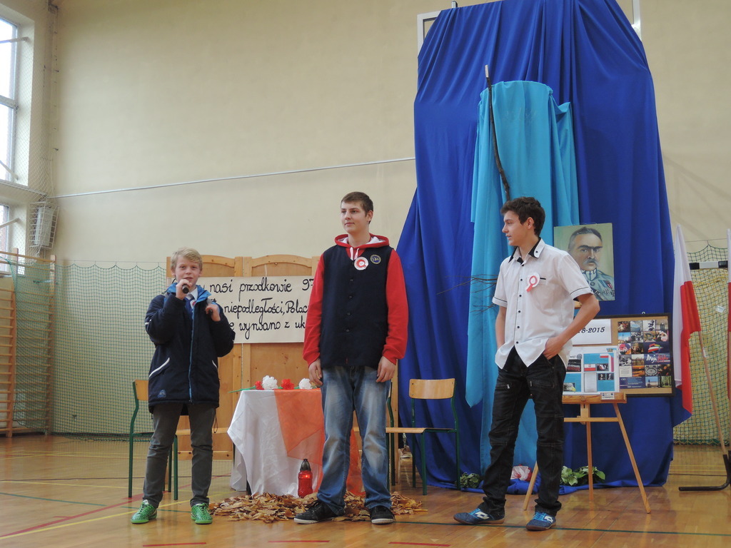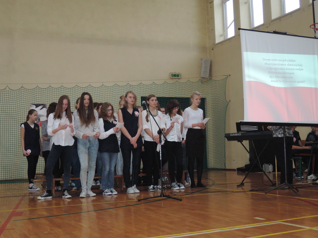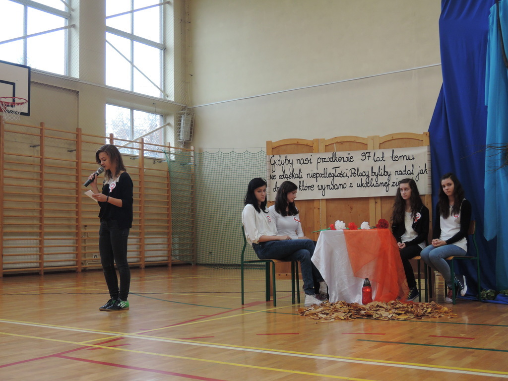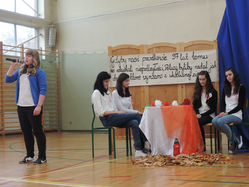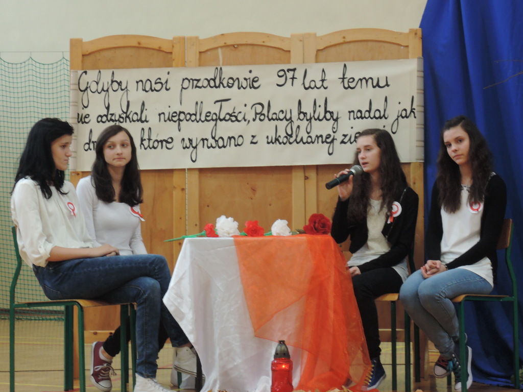 „Gdyby nasi przodkowie 97 lat temu nie odzyskali niepodległości, Polacy byliby jak drzewa, które wyrwano z korzeniami”- to motto apelu, jaki odbył się w naszym gimnazjum 10 listopada dla upamiętnienia 97 rocznicy odzyskania przez Polskę niepodległości.