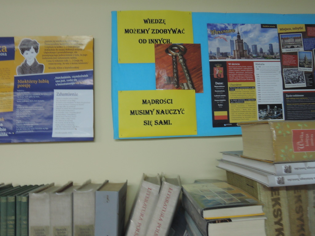 -Biblioteka systematycznie eksponuje wystawy tematyczne, rocznicowe oraz interesujące wystawki książek, zachęcając jednocześnie do zakupu ciekawych pozycji na szkolnych kiermaszach tanich książek.