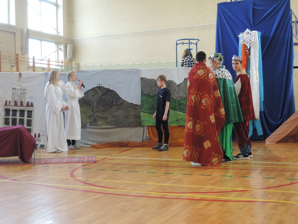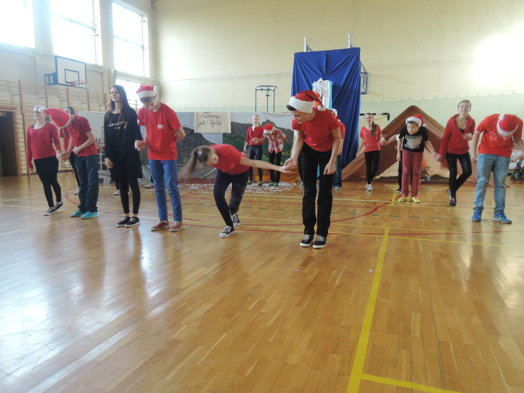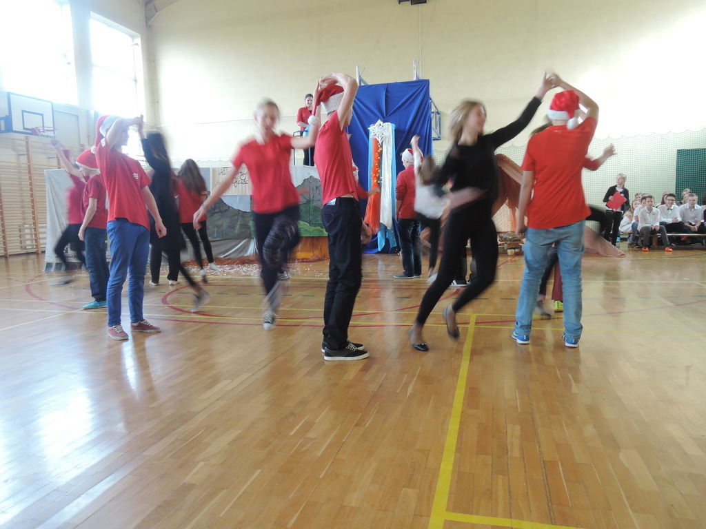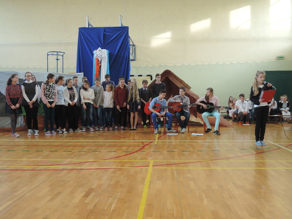 Od początku nasi uczniowie wraz z opiekunami: ks. Tomaszem Pańczyszynem SDB i p. Katarzyną Franicą przygotowywali to wyjątkowe przedstawienie, które swoją premierę miało w poranek 22 grudnia, gdy w gimnazjum obchodziliśmy wigilię szkolną i wigilie klasowe. Uroczystość ta jak zwykle zakończyła się wspólnym kolędowaniem. Wykonane zostały utwory tradycyjne i współczesne. Nad całością czuwała p. Barbara Stawinoga.