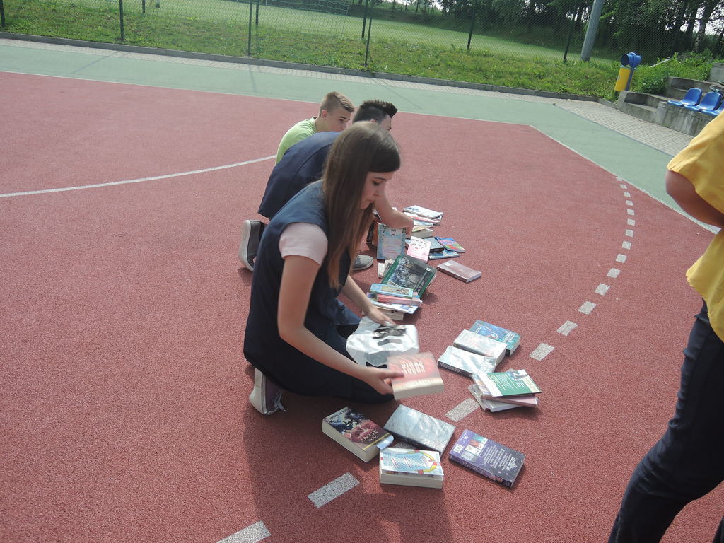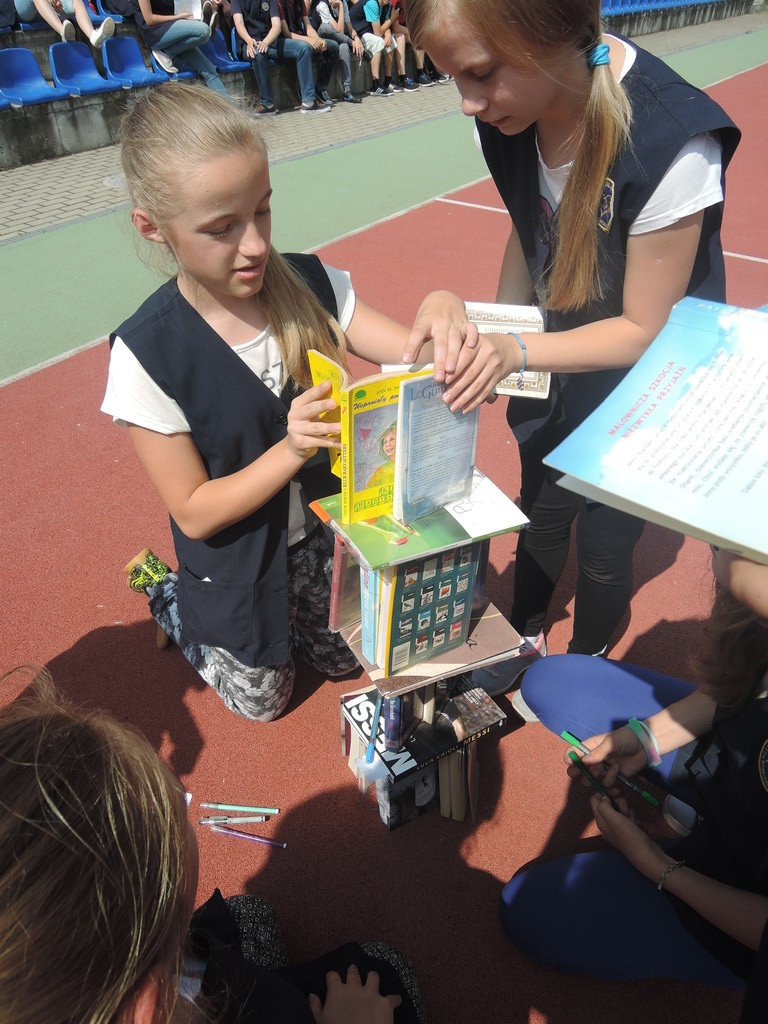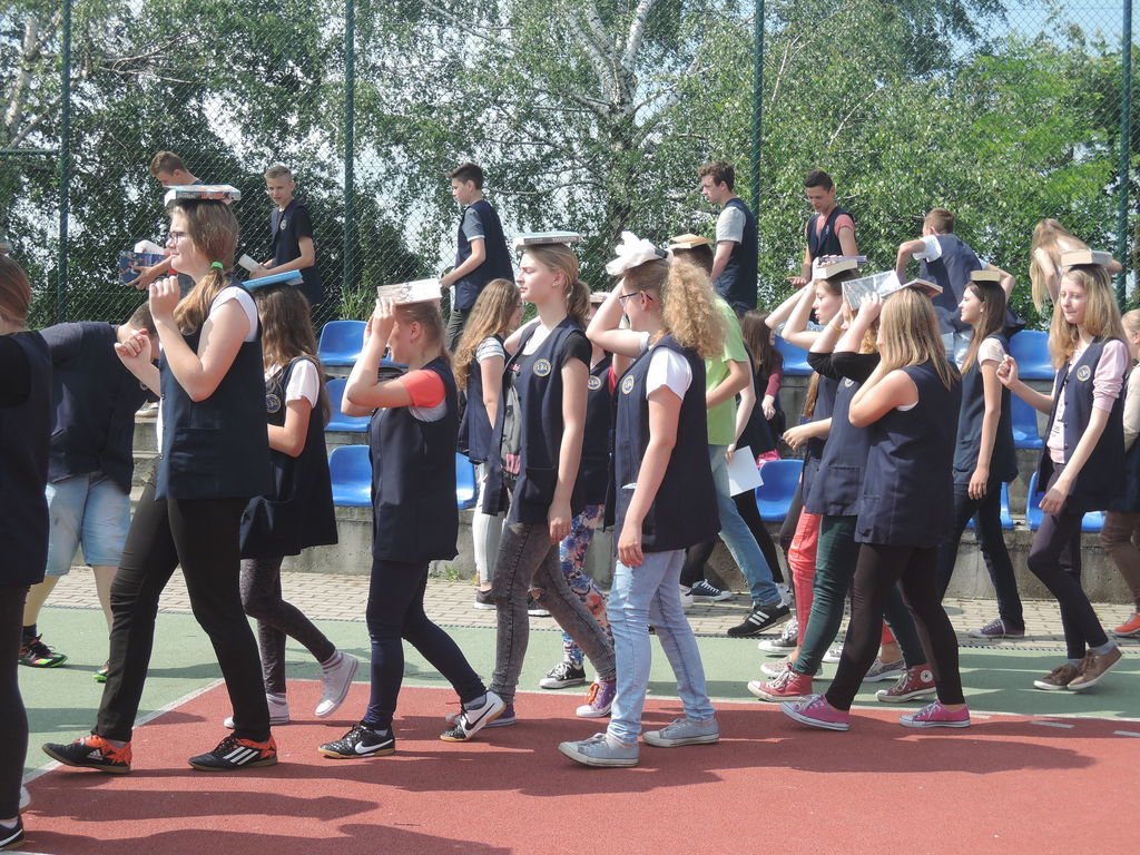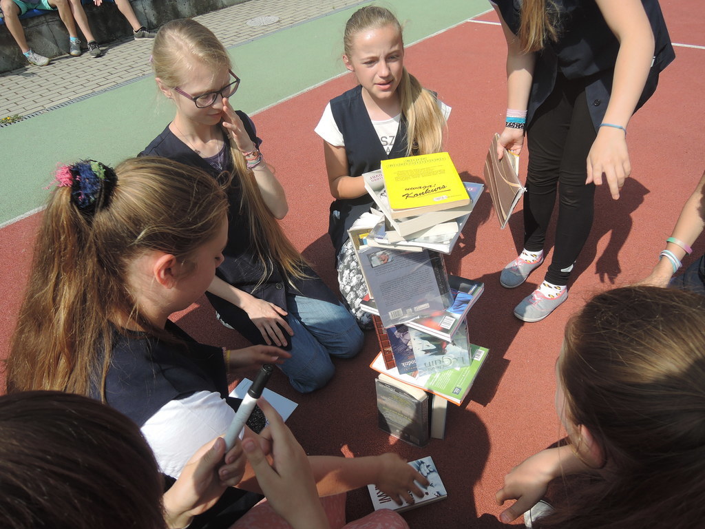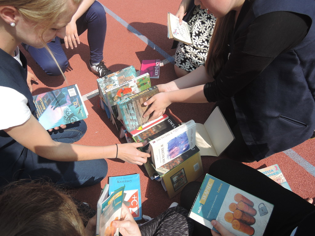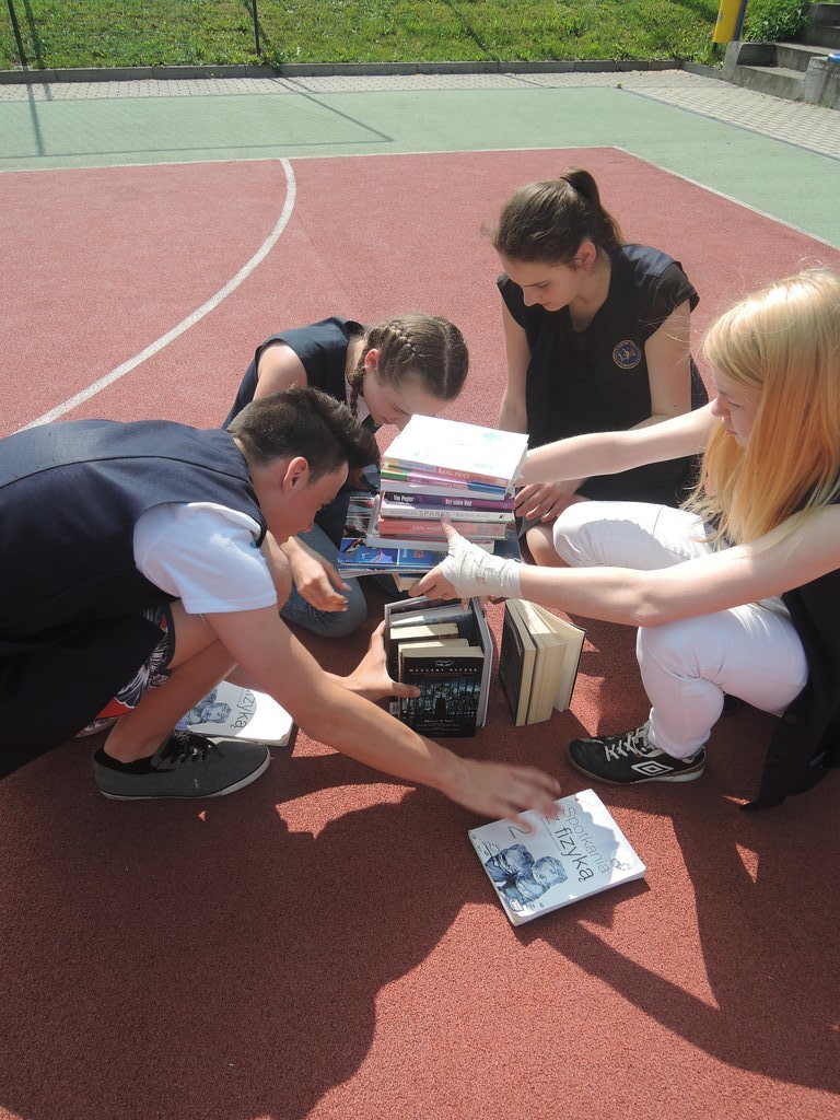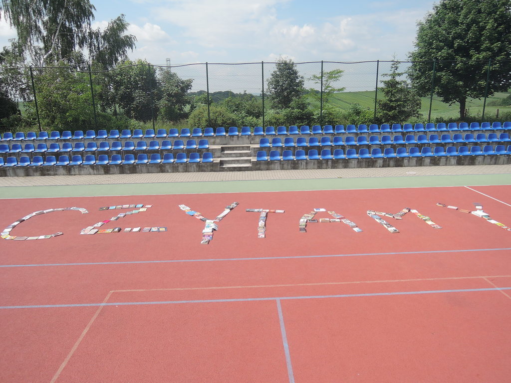 Następnie na kartce każdy uczestnik akcji zapisał tytuł i autora utworu, który zabrał z domu. W ten sposób powstało na siatce boiska książkowe graffiti. Kolejnym zadaniem było odszukanie 10 słowa z dziesiątej strony. Każdy zapisał to słowo na kartce. Z tych wyrazów ułożyliśmy tekst bez sensu, który następnie odczytała zaproszona specjalnie na tę okazję, jako gość honorowy, pani Krystyna Kura - była wieloletnia bibliotekarka. Odbył się również marsz z książkami na głowie dookoła boiska. Najbardziej uczniom podobało się zadanie, które musieli wykonać nauczyciele. Polegało ono na odczytaniu dziesiątego zdania z dziesiątej strony. Na koniec każda klasa ułożyła jeszcze wieżę z książek i wyraz „czytamy”, po czym wszyscy uczniowie z zadowoleniem wrócili na lekcje. Akcję w szkole zorganizowały i przeprowadziły bibliotekarki B. Stawinoga i C. Szafraniec.