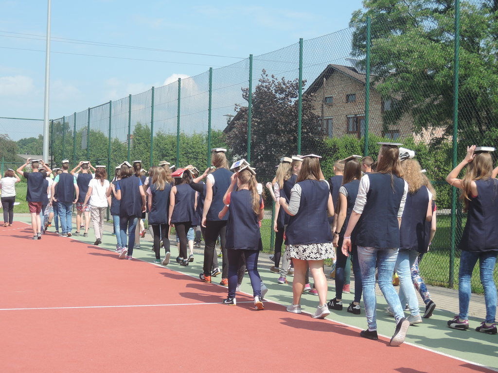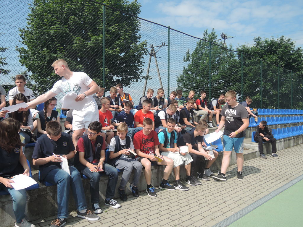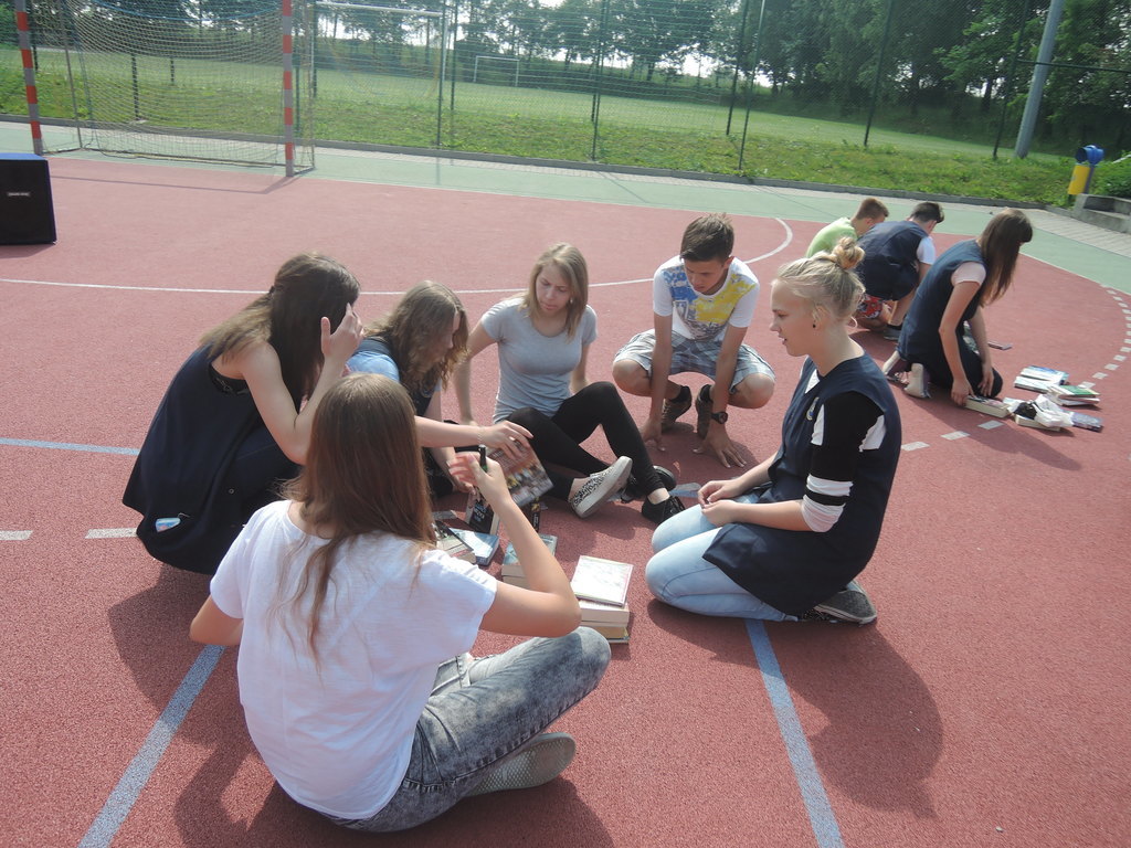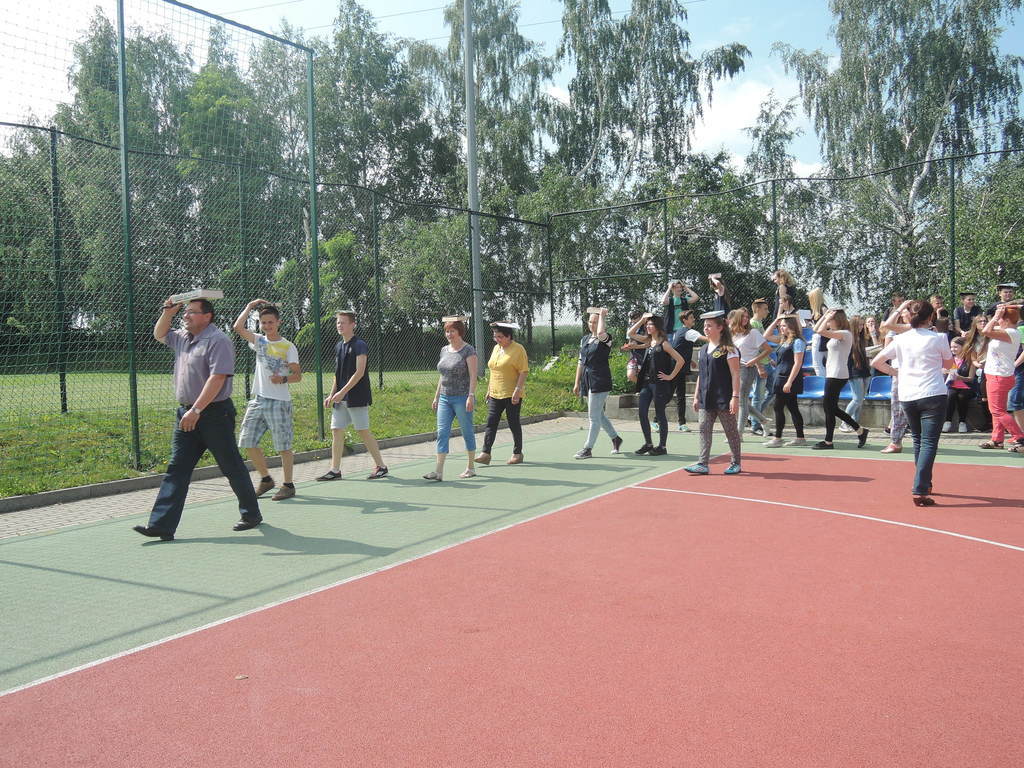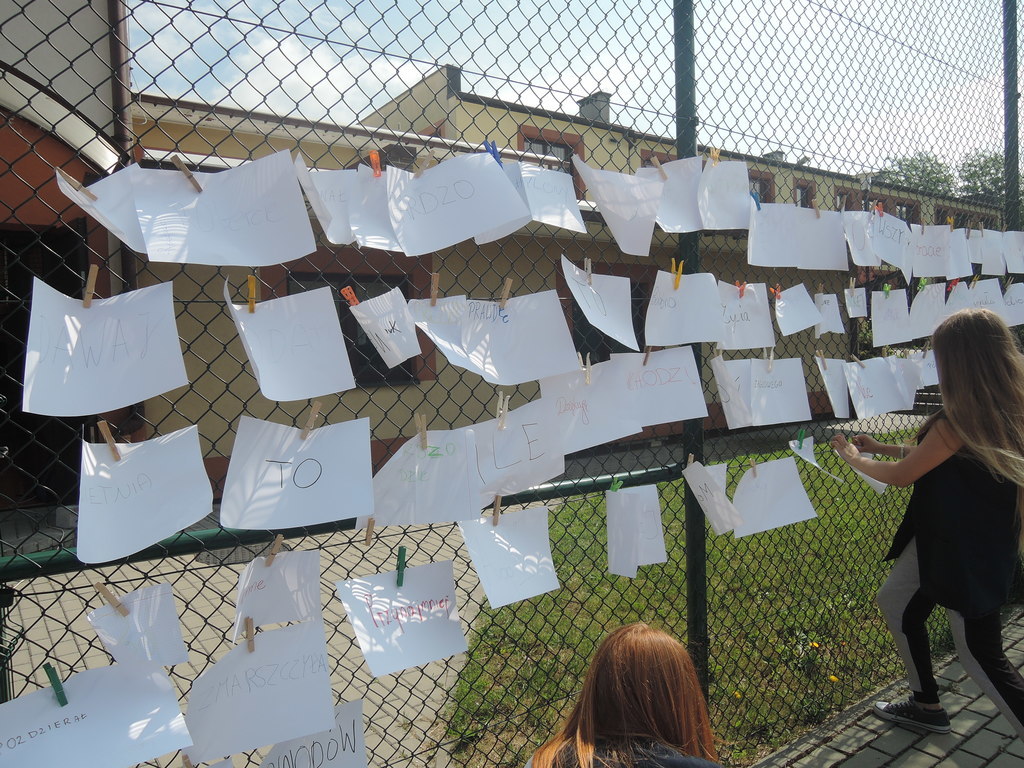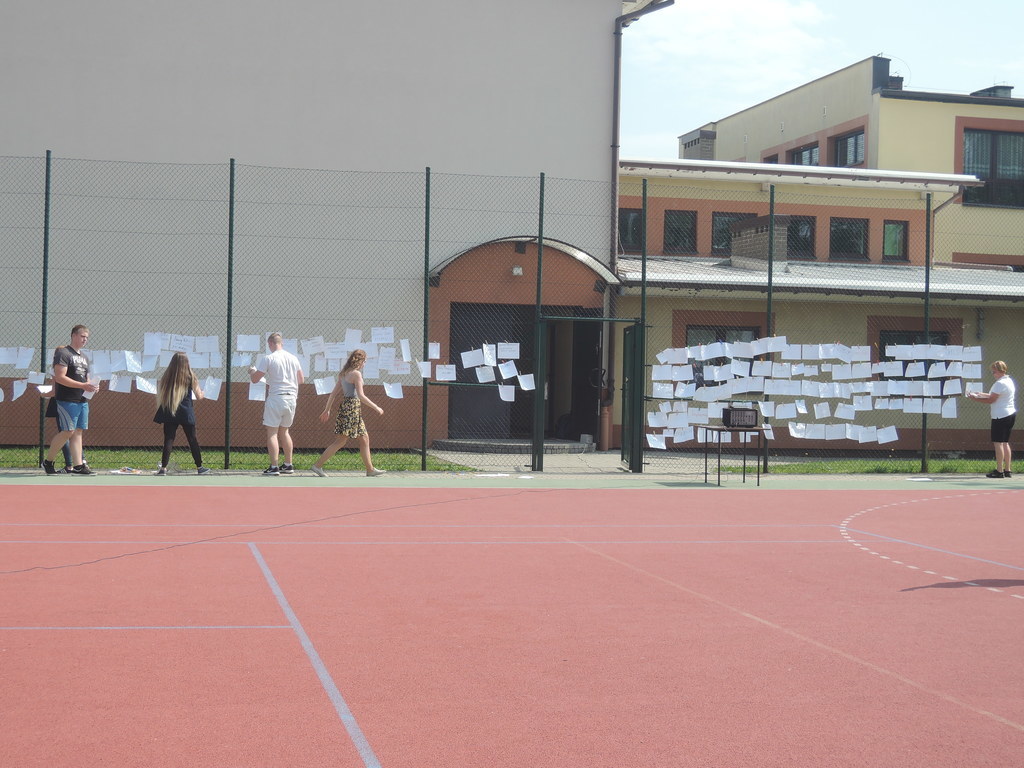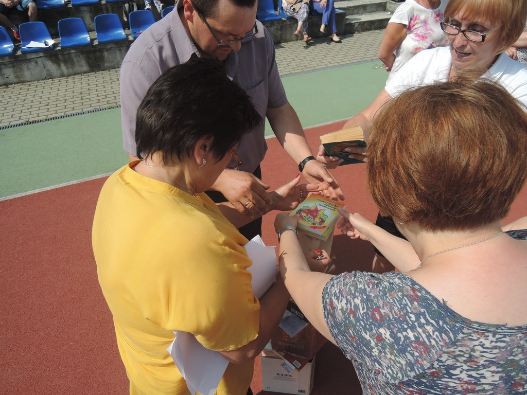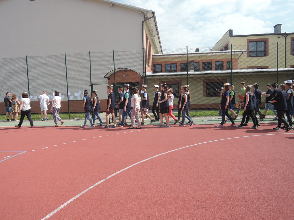 Następnie na kartce każdy uczestnik akcji zapisał tytuł i autora utworu, który zabrał z domu. W ten sposób powstało na siatce boiska książkowe graffiti. Kolejnym zadaniem było odszukanie 10 słowa z dziesiątej strony. Każdy zapisał to słowo na kartce. Z tych wyrazów ułożyliśmy tekst bez sensu, który następnie odczytała zaproszona specjalnie na tę okazję, jako gość honorowy, pani Krystyna Kura - była wieloletnia bibliotekarka. Odbył się również marsz z książkami na głowie dookoła boiska. Najbardziej uczniom podobało się zadanie, które musieli wykonać nauczyciele. Polegało ono na odczytaniu dziesiątego zdania z dziesiątej strony. Na koniec każda klasa ułożyła jeszcze wieżę z książek i wyraz „czytamy”, po czym wszyscy uczniowie z zadowoleniem wrócili na lekcje. Akcję w szkole zorganizowały i przeprowadziły bibliotekarki B. Stawinoga i C. Szafraniec.