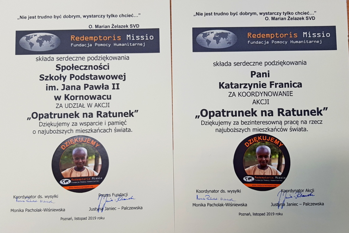 W minionym tygodniu otrzymaliśmy podziękowanie za zebrane przez nas materiały opatrunkowe w ramach akcji Fundacji Redemptoris Missio „Opatrunek na ratunek.” Przypomnijmy, zebraliśmy wielkie pudło, ważące ponad 2 kg. Lekkich przecież opatrunków. Nasze szkolne koło wolontariatu jest otwarte i wrażliwe na potrzeby drugiego człowieka i nie czeka na specjalne podziękowania, ale mimo tego z wielką radością dzielimy się tą korespondencją.