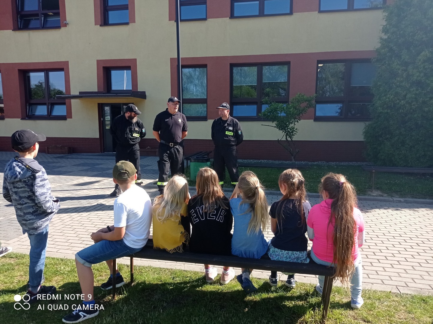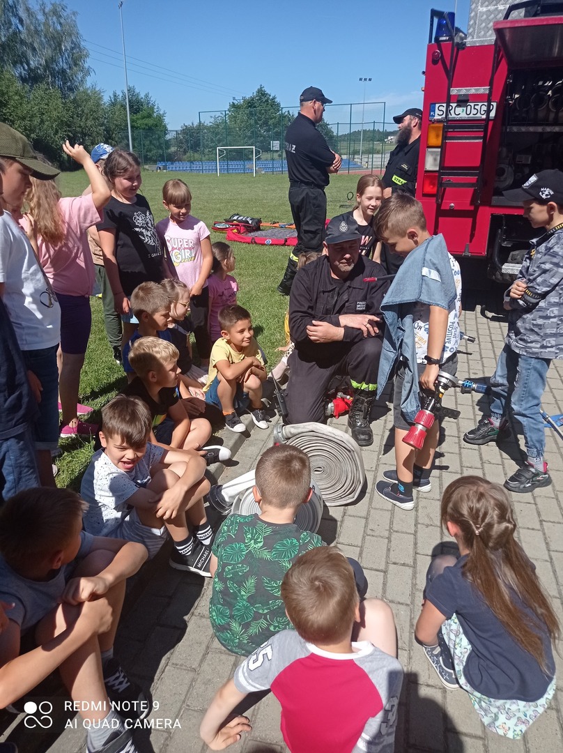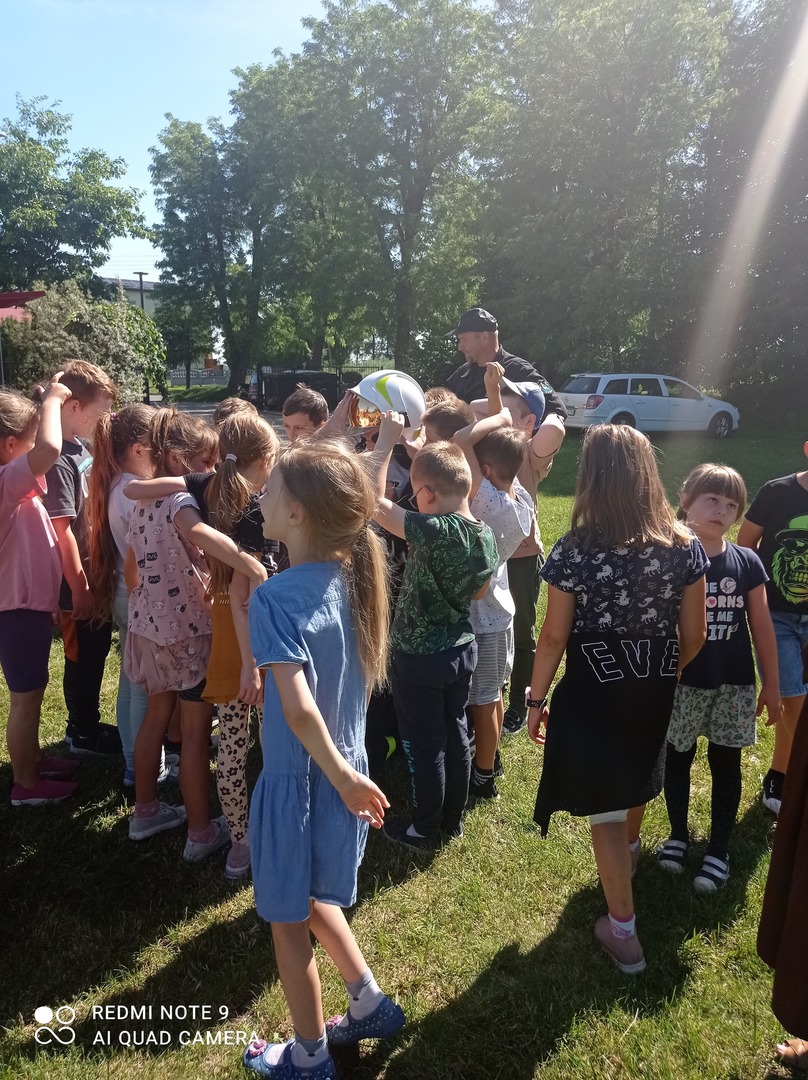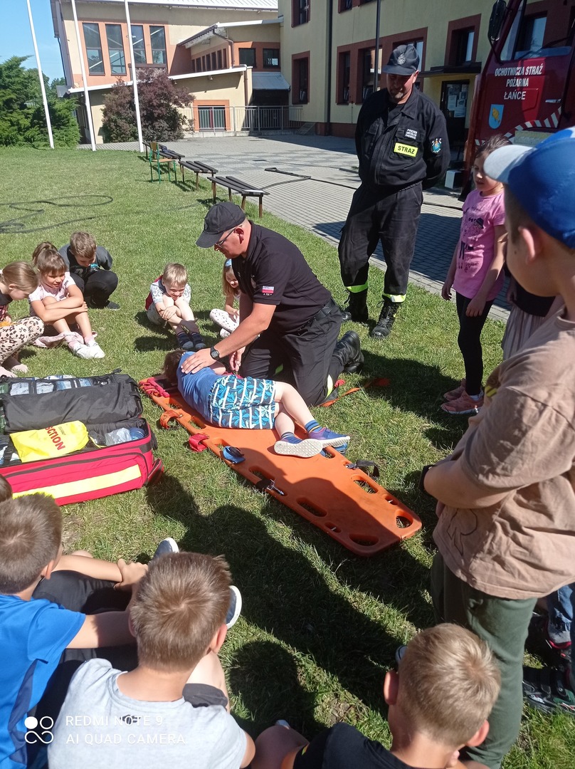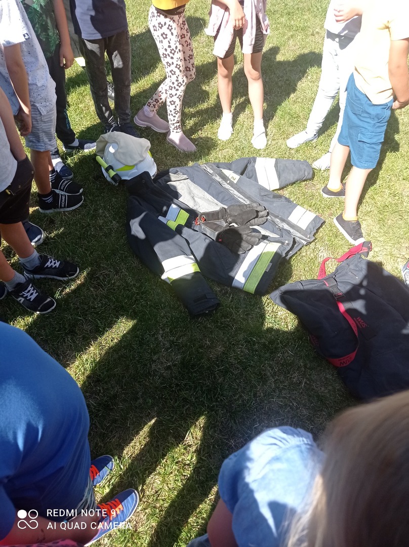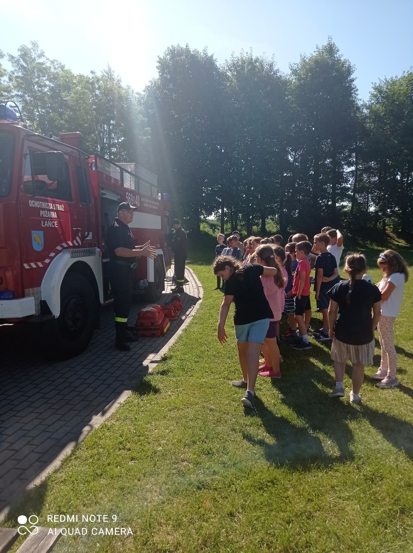W dniu dzisiejszym uczniowie klas młodszych mieli okazję wziąć udział w niecodziennej lekcji. Wszystko dzięki przedstawicielom Ochotniczej Straży Pożarnej w Łańcach, którzy sprawili, że ten dzień był dla wszystkich naprawdę wyjątkowy. Podczas spotkania dzieci miały okazje poznać m.in. specyfikę pracy strażaka oraz dowiedzieć się wielu cennych wskazówek na temat bezpieczeństwa przeciwpożarowego. Cenną lekcją dla wszystkich uczestników okazała się pogadanka oraz praktyczne ćwiczenia z zakresu pierwszej pomocy. Panowie zaprezentowali również swój roboczy strój, który zakładają idąc do akcji, a chętni uczniowie mieli okazję do przymiarki elementów ekwipunku. Ciekawą częścią pokazu była również prezentacja wyposażenia wozu strażackiego w niezbędne sprzęty oraz narzędzia. Uczniowie mieli okazję zobaczyć na własne oczy, jak one wszystkie działają i do czego służą. Na zakończenie przyszła pora na prawdziwy gwóźdź programu, czyli naukę posługiwania się wężem strażackim i możliwość polania boiska wodą. Ale była zabawa! Dzisiaj każdy uczeń mógł wcielić się w rolę strażaka i przekonać się, że panowie wykonują naprawdę ciężką i niebezpieczną pracę. Jeszcze raz bardzo serdecznie dziękujemy za poświęcony czas, niezapomniane przeżycia oraz słodki podarunek!