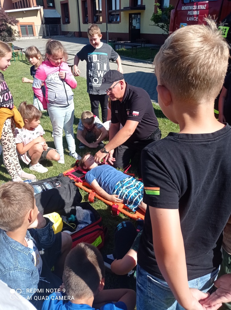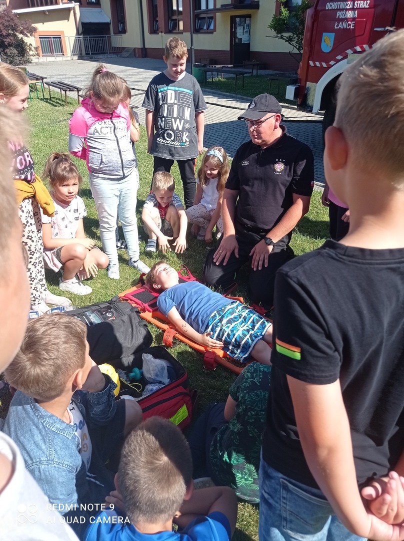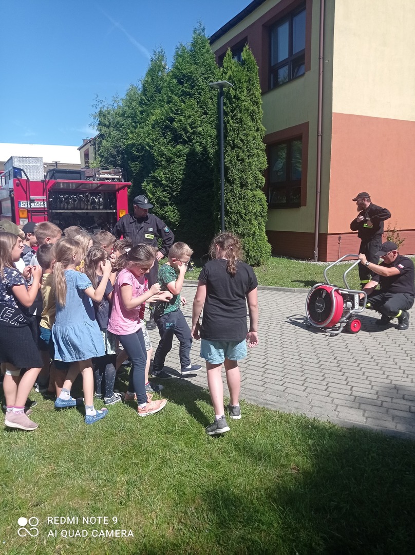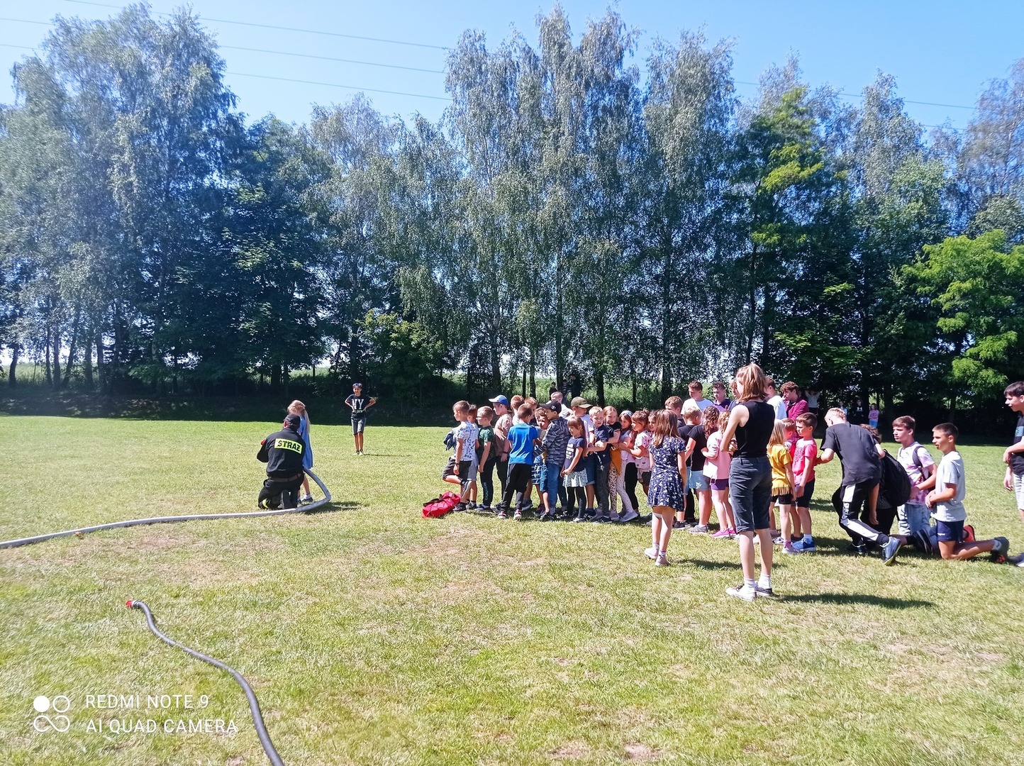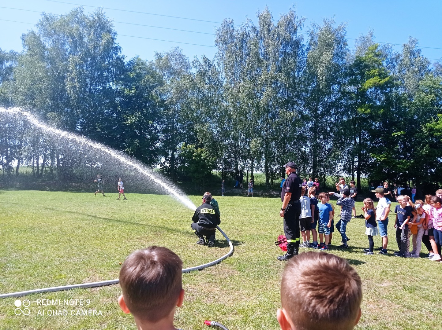 W dniu dzisiejszym uczniowie klas młodszych mieli okazję wziąć udział w niecodziennej lekcji. Wszystko dzięki przedstawicielom Ochotniczej Straży Pożarnej w Łańcach, którzy sprawili, że ten dzień był dla wszystkich naprawdę wyjątkowy. Podczas spotkania dzieci miały okazje poznać m.in. specyfikę pracy strażaka oraz dowiedzieć się wielu cennych wskazówek na temat bezpieczeństwa przeciwpożarowego. Cenną lekcją dla wszystkich uczestników okazała się pogadanka oraz praktyczne ćwiczenia z zakresu pierwszej pomocy. Panowie zaprezentowali również swój roboczy strój, który zakładają idąc do akcji, a chętni uczniowie mieli okazję do przymiarki elementów ekwipunku. Ciekawą częścią pokazu była również prezentacja wyposażenia wozu strażackiego w niezbędne sprzęty oraz narzędzia. Uczniowie mieli okazję zobaczyć na własne oczy, jak one wszystkie działają i do czego służą. Na zakończenie przyszła pora na prawdziwy gwóźdź programu, czyli naukę posługiwania się wężem strażackim i możliwość polania boiska wodą. Ale była zabawa! Dzisiaj każdy uczeń mógł wcielić się w rolę strażaka i przekonać się, że panowie wykonują naprawdę ciężką i niebezpieczną pracę. Jeszcze raz bardzo serdecznie dziękujemy za poświęcony czas, niezapomniane przeżycia oraz słodki podarunek!