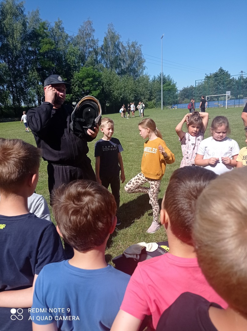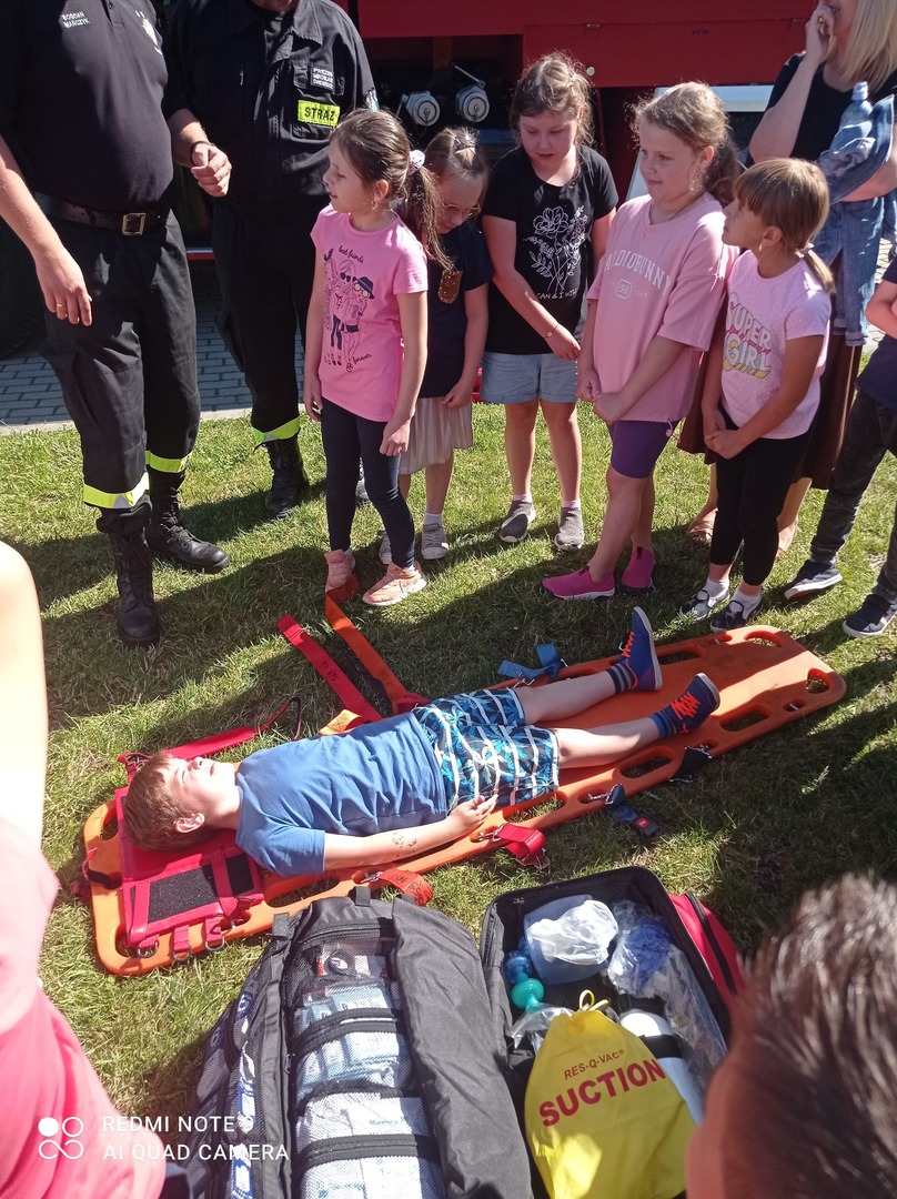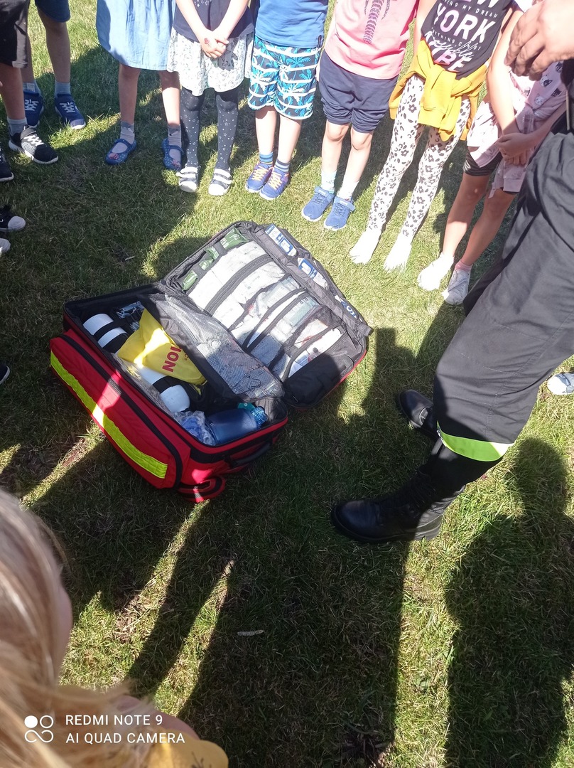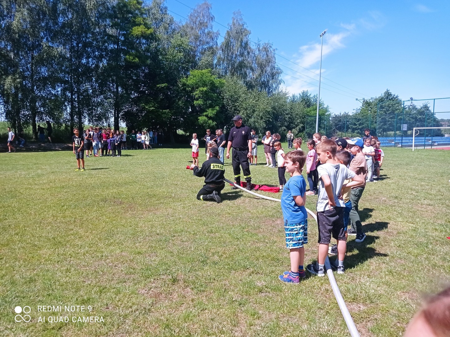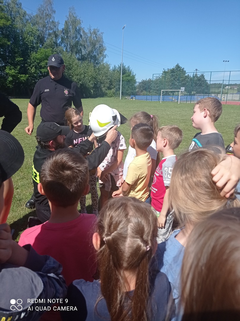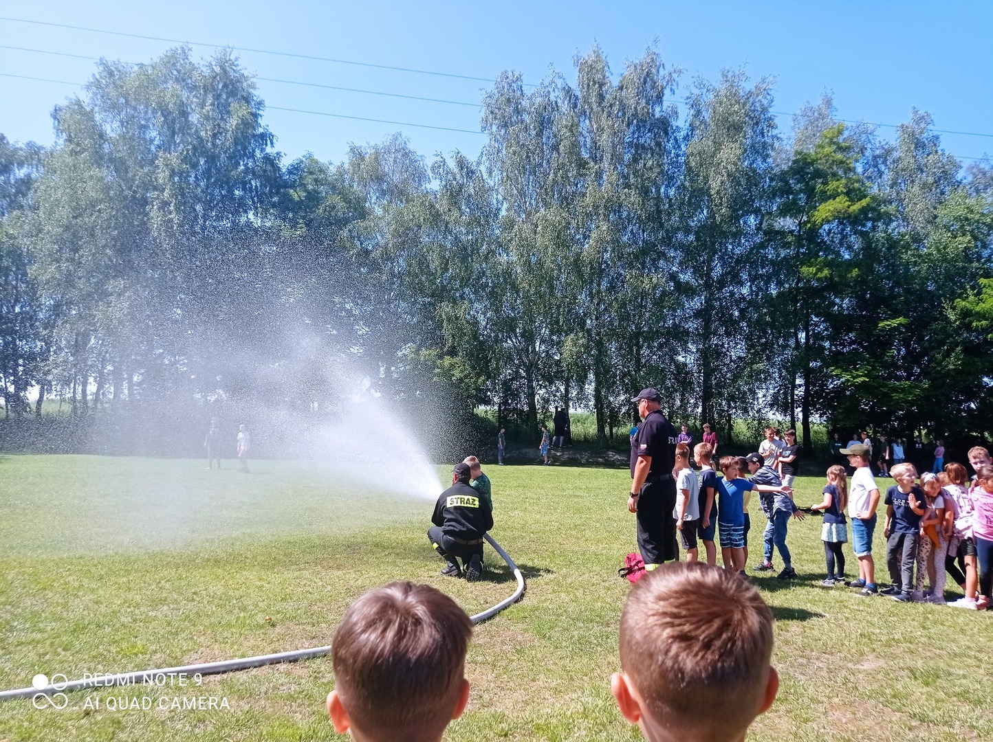 W dniu dzisiejszym uczniowie klas młodszych mieli okazję wziąć udział w niecodziennej lekcji. Wszystko dzięki przedstawicielom Ochotniczej Straży Pożarnej w Łańcach, którzy sprawili, że ten dzień był dla wszystkich naprawdę wyjątkowy. Podczas spotkania dzieci miały okazje poznać m.in. specyfikę pracy strażaka oraz dowiedzieć się wielu cennych wskazówek na temat bezpieczeństwa przeciwpożarowego. Cenną lekcją dla wszystkich uczestników okazała się pogadanka oraz praktyczne ćwiczenia z zakresu pierwszej pomocy. Panowie zaprezentowali również swój roboczy strój, który zakładają idąc do akcji, a chętni uczniowie mieli okazję do przymiarki elementów ekwipunku. Ciekawą częścią pokazu była również prezentacja wyposażenia wozu strażackiego w niezbędne sprzęty oraz narzędzia. Uczniowie mieli okazję zobaczyć na własne oczy, jak one wszystkie działają i do czego służą. Na zakończenie przyszła pora na prawdziwy gwóźdź programu, czyli naukę posługiwania się wężem strażackim i możliwość polania boiska wodą. Ale była zabawa! Dzisiaj każdy uczeń mógł wcielić się w rolę strażaka i przekonać się, że panowie wykonują naprawdę ciężką i niebezpieczną pracę. Jeszcze raz bardzo serdecznie dziękujemy za poświęcony czas, niezapomniane przeżycia oraz słodki podarunek!