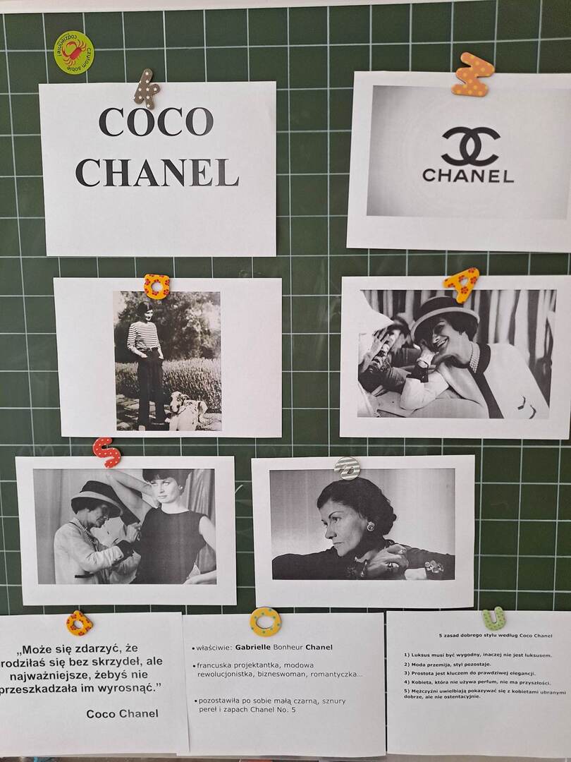 Myśląc o francuskiej modzie, do głowy przychodzi od razu jedno skojarzenie – Coco Chanel – modowa rewolucjonistka i bizneswoman. Trzecioklasiści poznali biografię sławnej projektantki dzięki lekturze książki pt. „Coco Chanel” z serii MALI WIELCY. Jednogłośnie stwierdzili, że Gabrielle Chanel miała ciężkie życie. Nie można jednak zapominać, że pomimo różnych przeciwności stała się znawczynią mody – kobietą znaną na całym świecie. To dzięki Coco Chanel w kobiecych garderobach można znaleźć: sznur pereł, małą czarną i Chanel No. 5😊