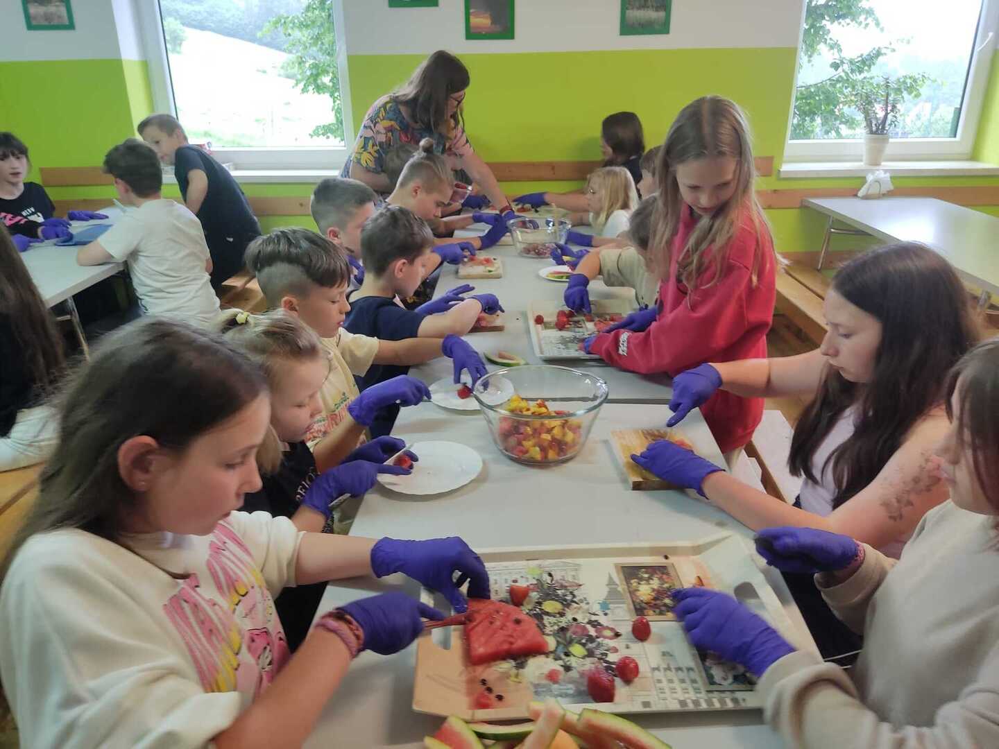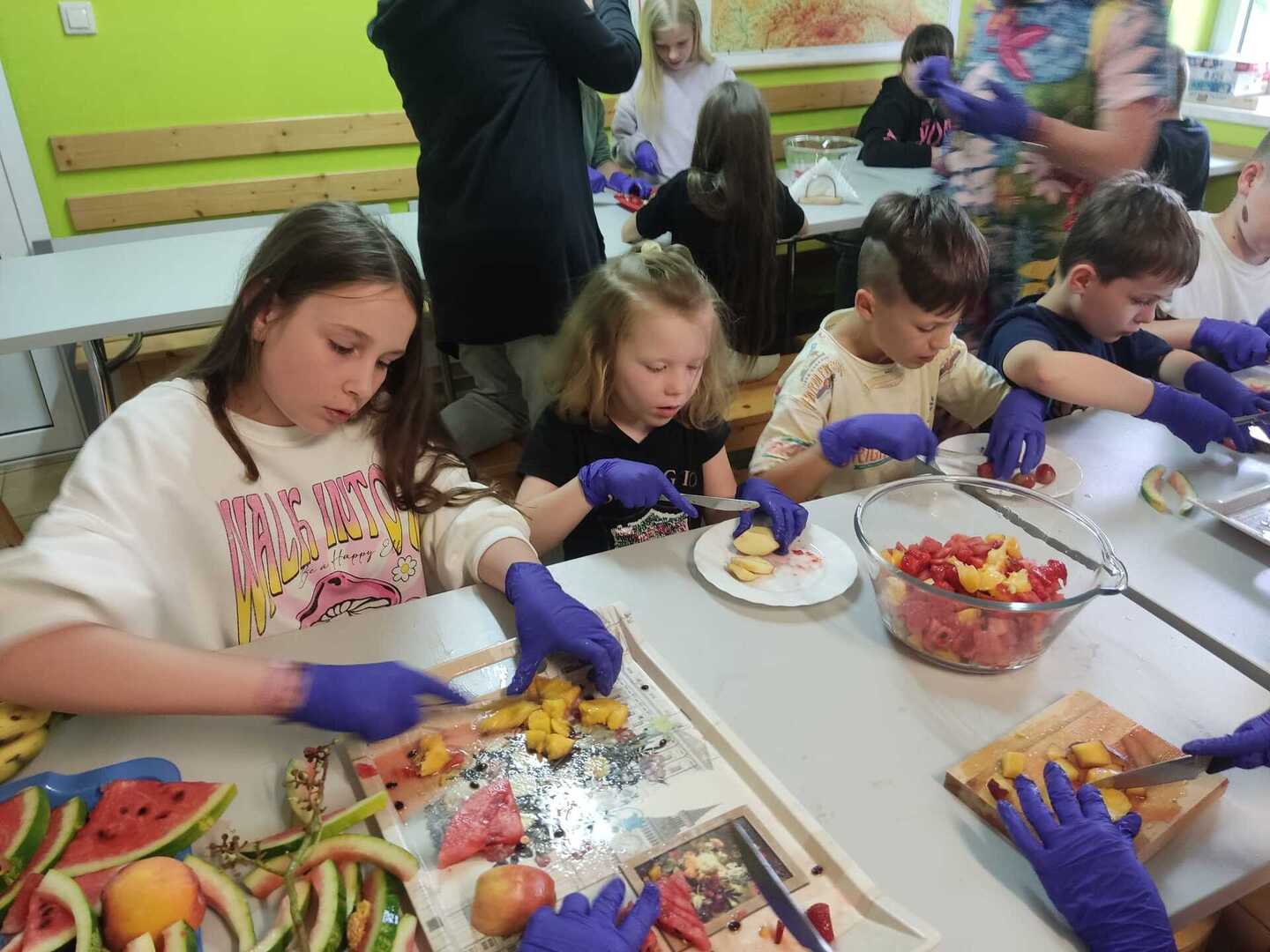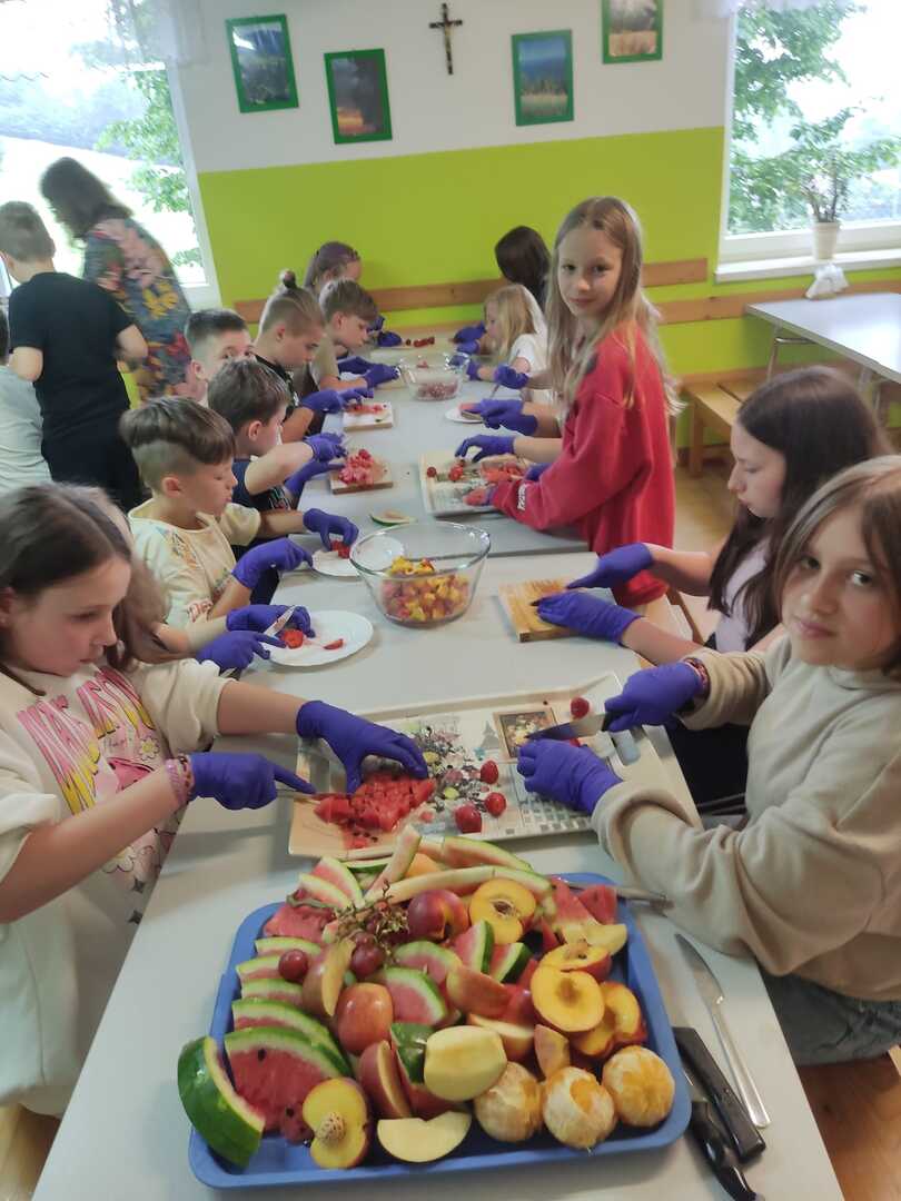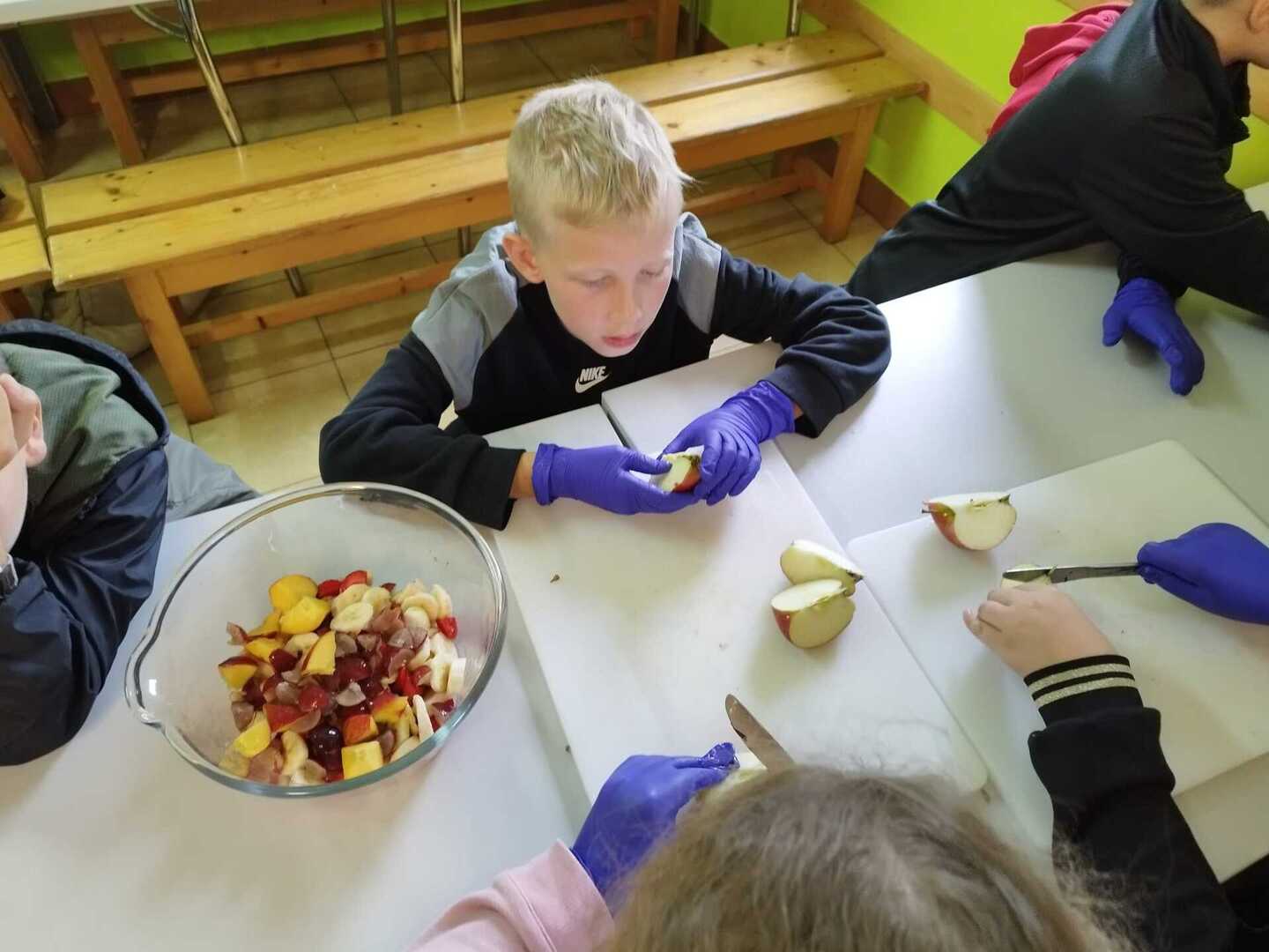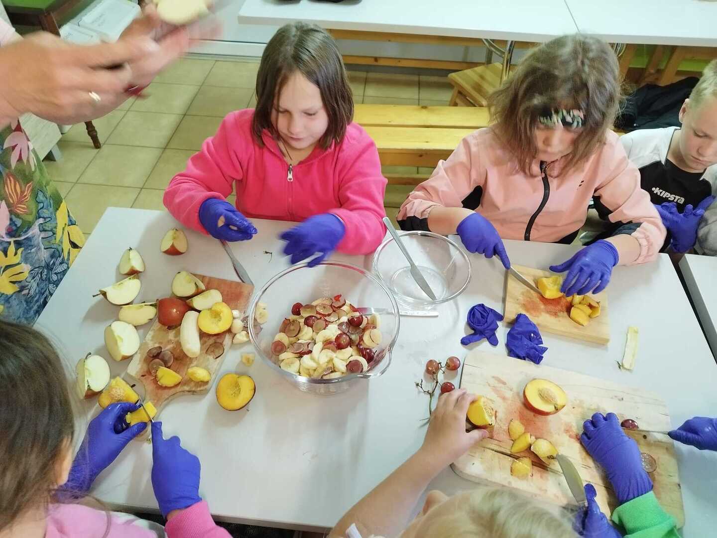 Po obiedzie był czas na kolejne zabawy integrujące o "owocowej" tematyce. Najpierw uczniowie brali udział w zabawie ruchowej "sałatka owocowa", następnie rozwiązywali zagadki o owocach, a na koniec wspólnymi siłami przygotowali sałatkę owocową na podwieczorek. Była to kolejna możliwość do integracji zespołu poprzez wspólne działanie, okazja do promowania zdrowego stylu życia i wprowadzania do diety większej ilości świeżych owoców.