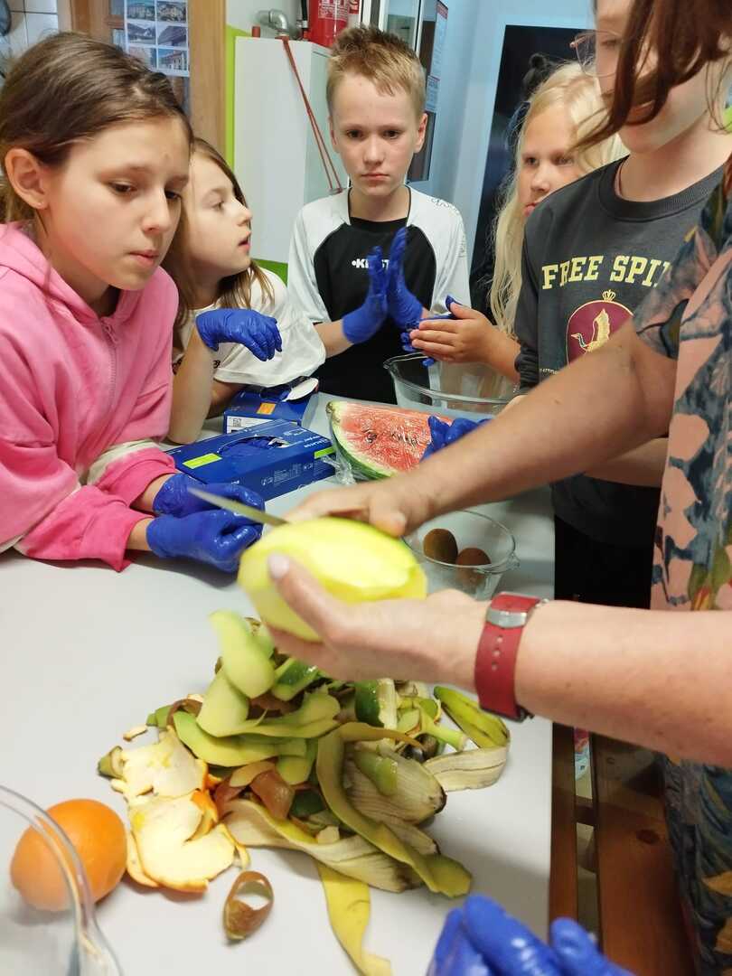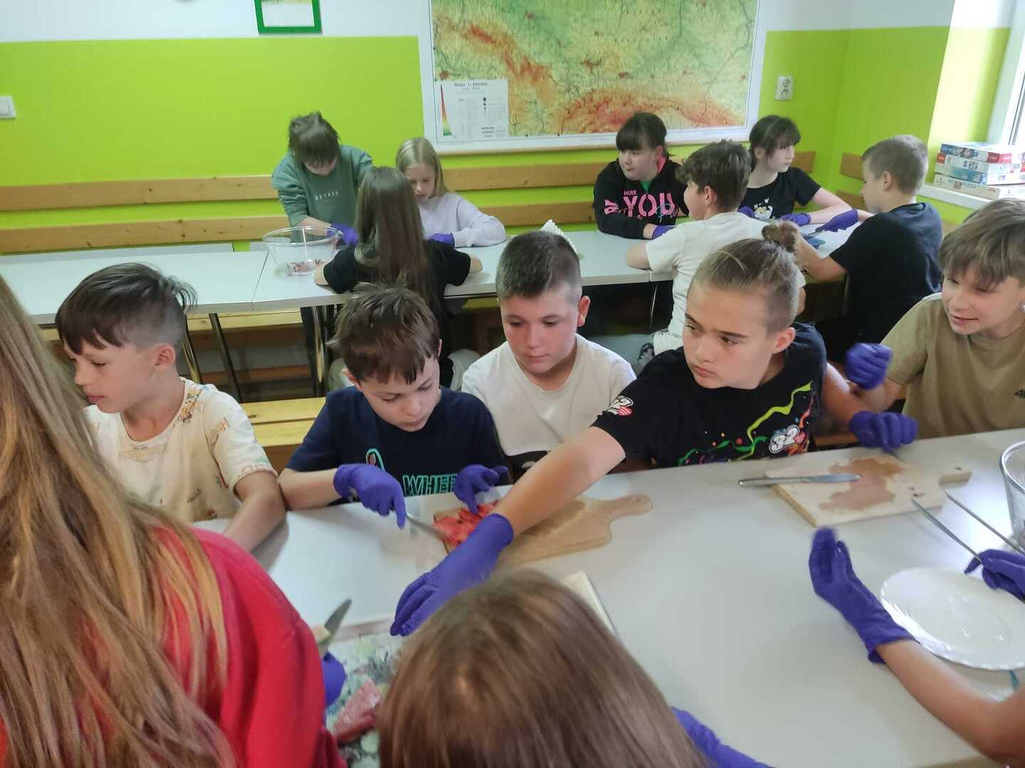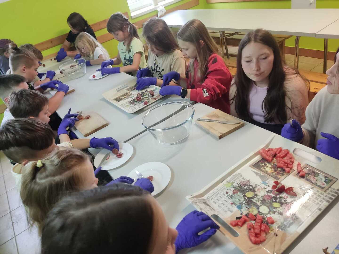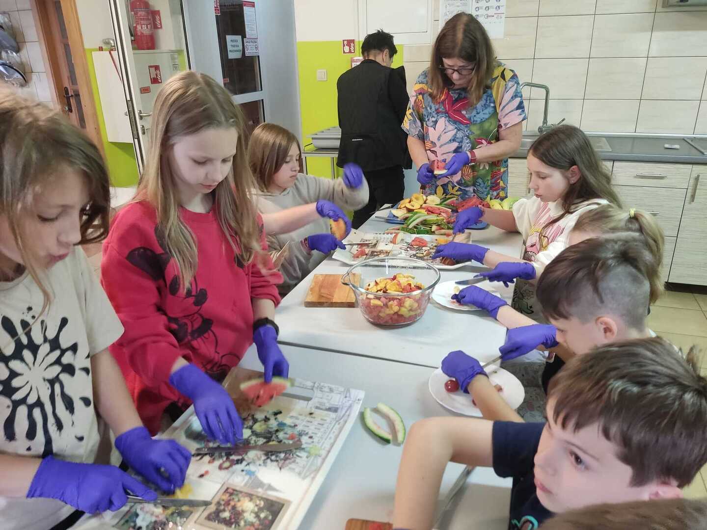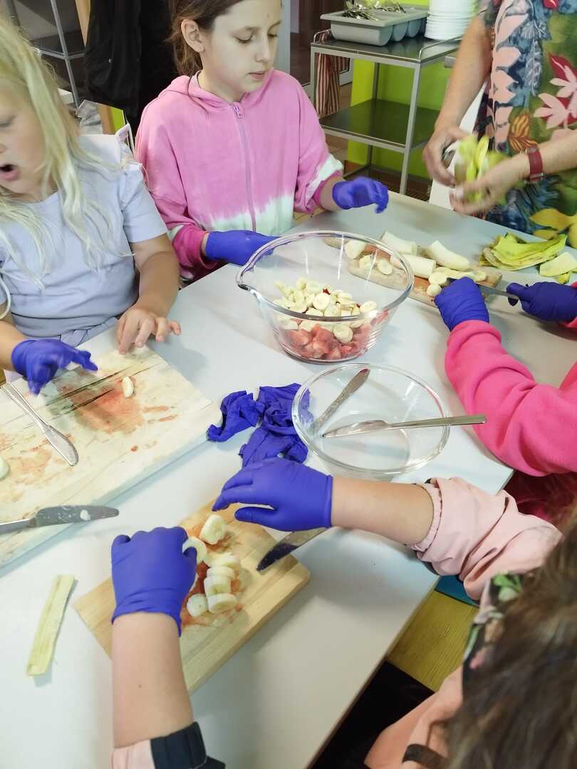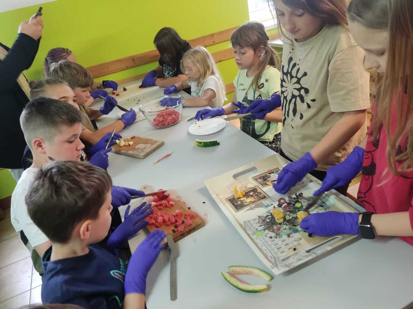 Po obiedzie był czas na kolejne zabawy integrujące o "owocowej" tematyce. Najpierw uczniowie brali udział w zabawie ruchowej "sałatka owocowa", następnie rozwiązywali zagadki o owocach, a na koniec wspólnymi siłami przygotowali sałatkę owocową na podwieczorek. Była to kolejna możliwość do integracji zespołu poprzez wspólne działanie, okazja do promowania zdrowego stylu życia i wprowadzania do diety większej ilości świeżych owoców.