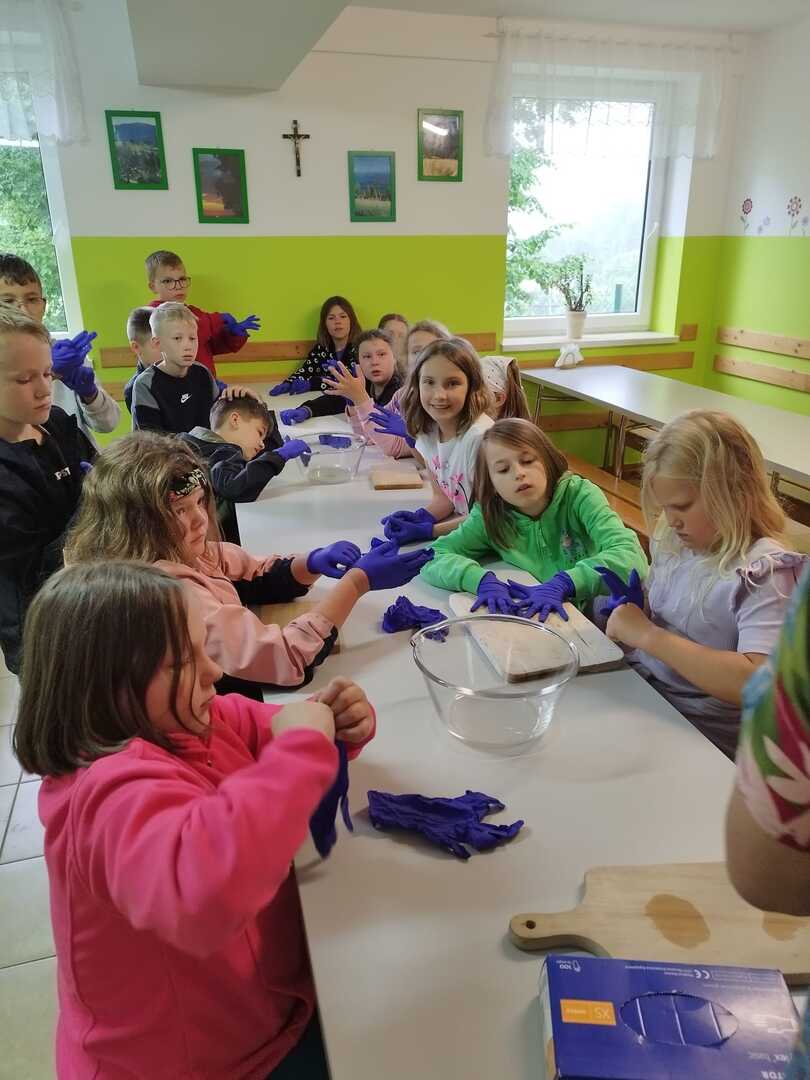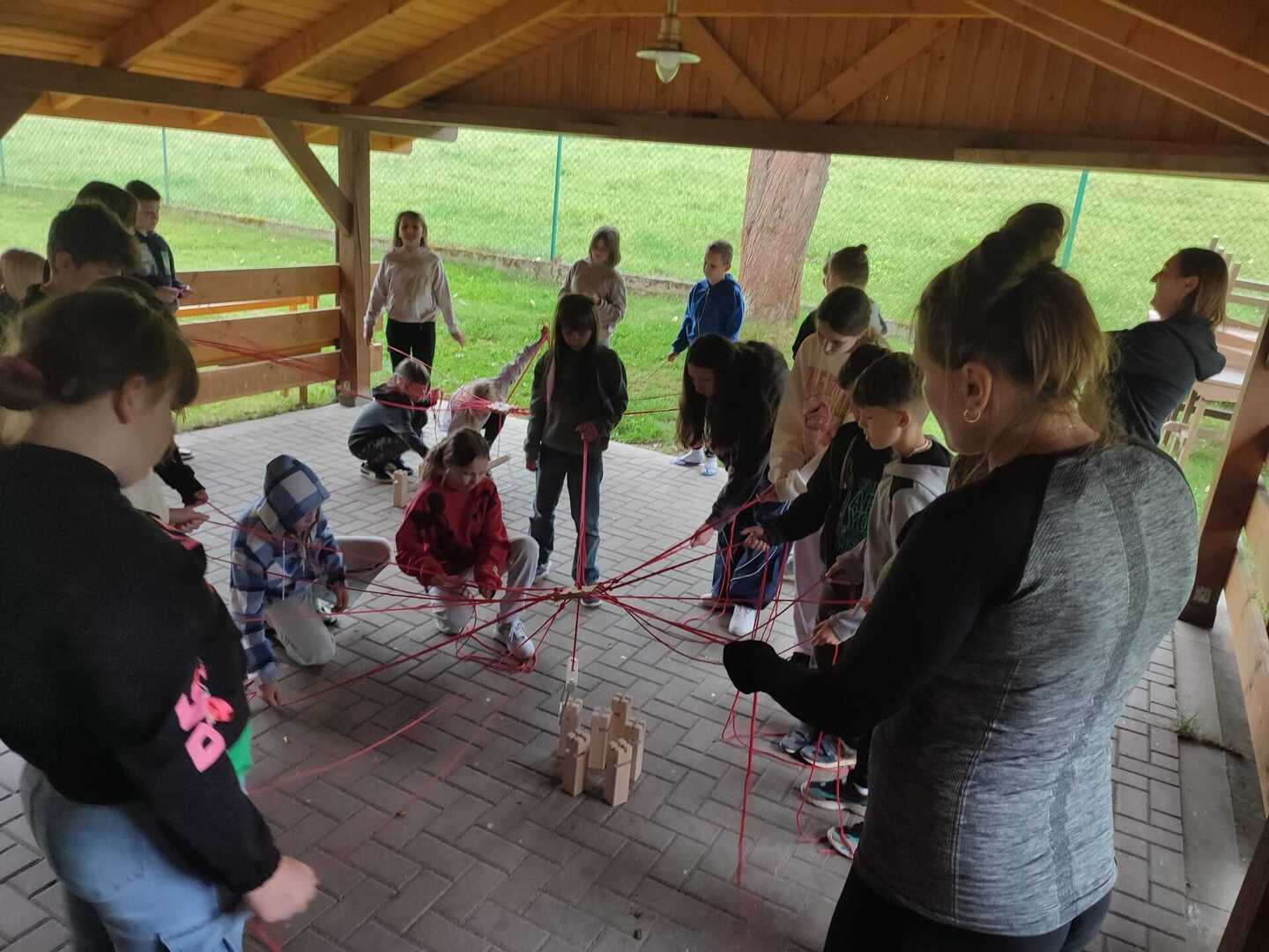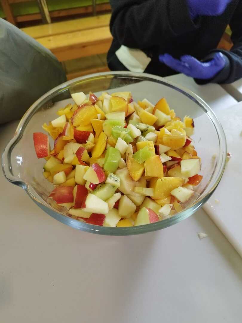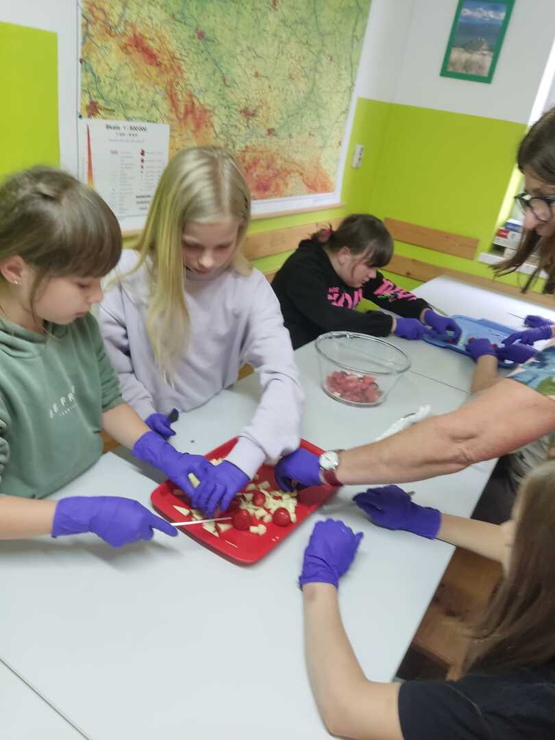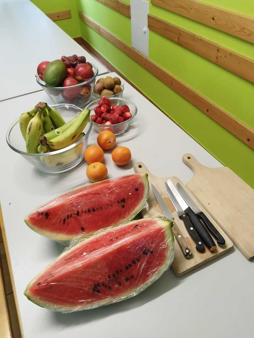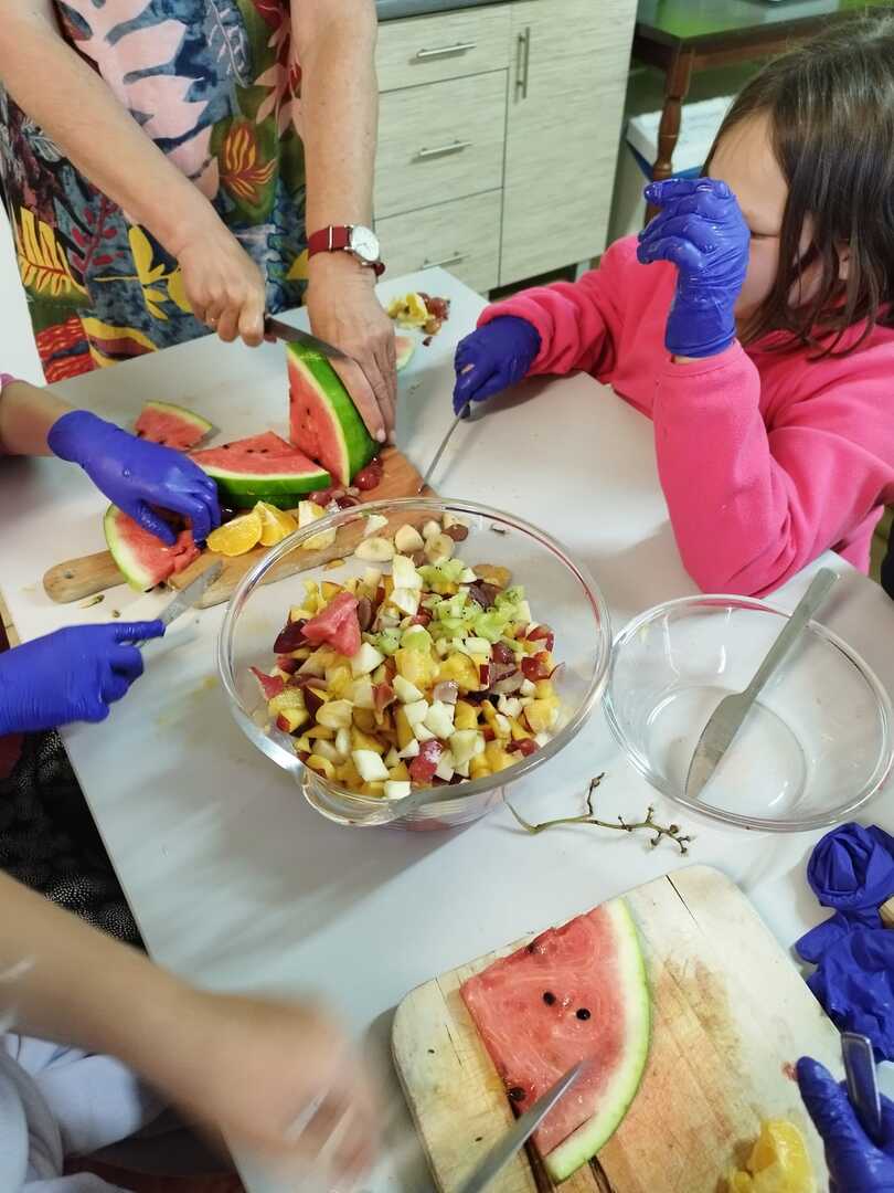 Po obiedzie był czas na kolejne zabawy integrujące o "owocowej" tematyce. Najpierw uczniowie brali udział w zabawie ruchowej "sałatka owocowa", następnie rozwiązywali zagadki o owocach, a na koniec wspólnymi siłami przygotowali sałatkę owocową na podwieczorek. Była to kolejna możliwość do integracji zespołu poprzez wspólne działanie, okazja do promowania zdrowego stylu życia i wprowadzania do diety większej ilości świeżych owoców.