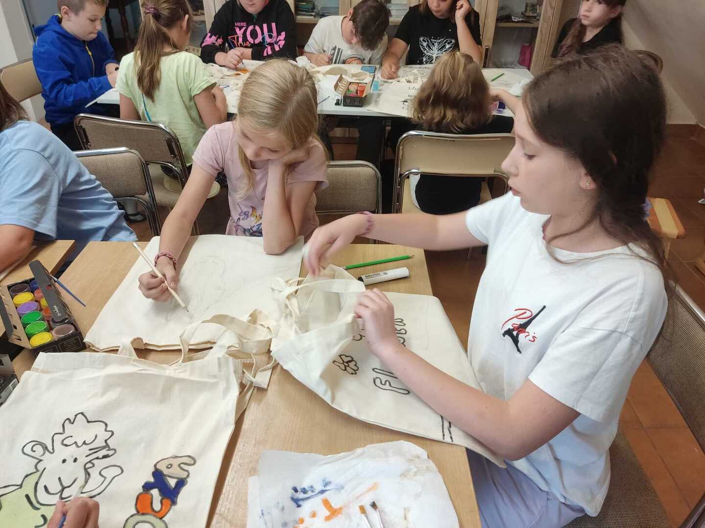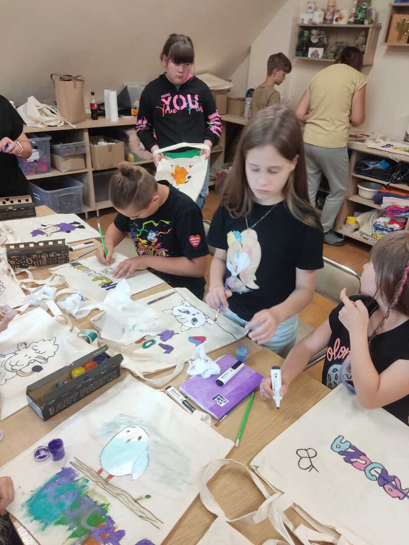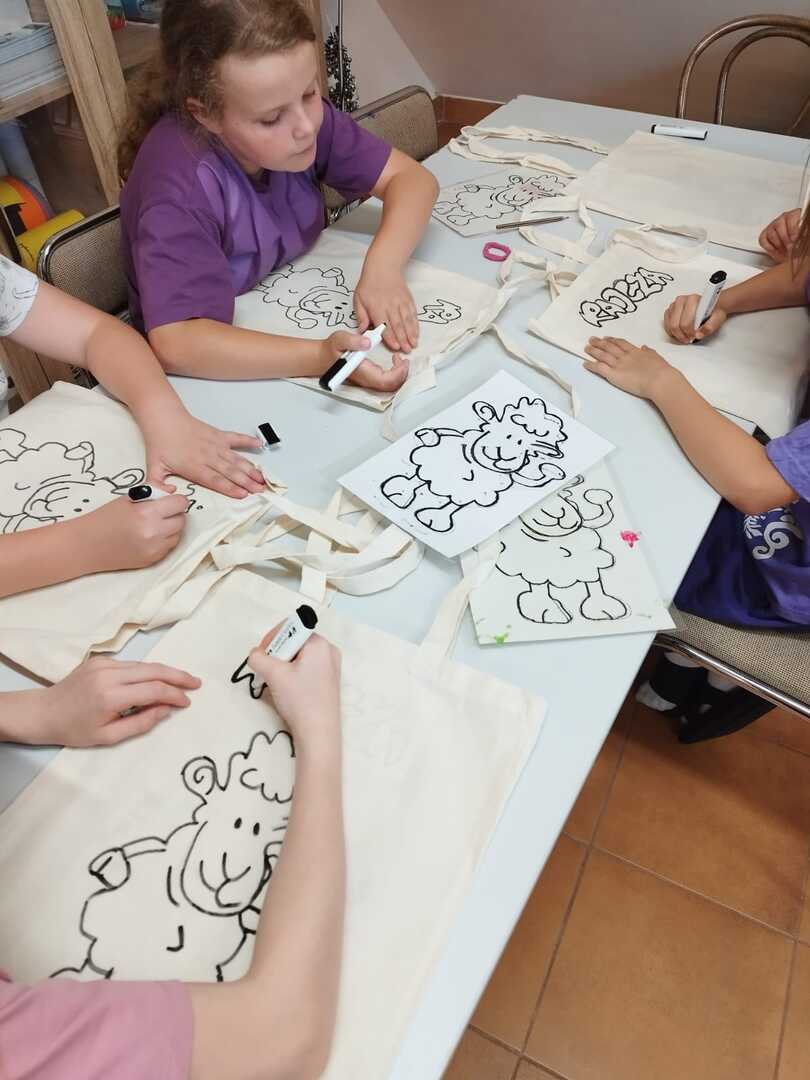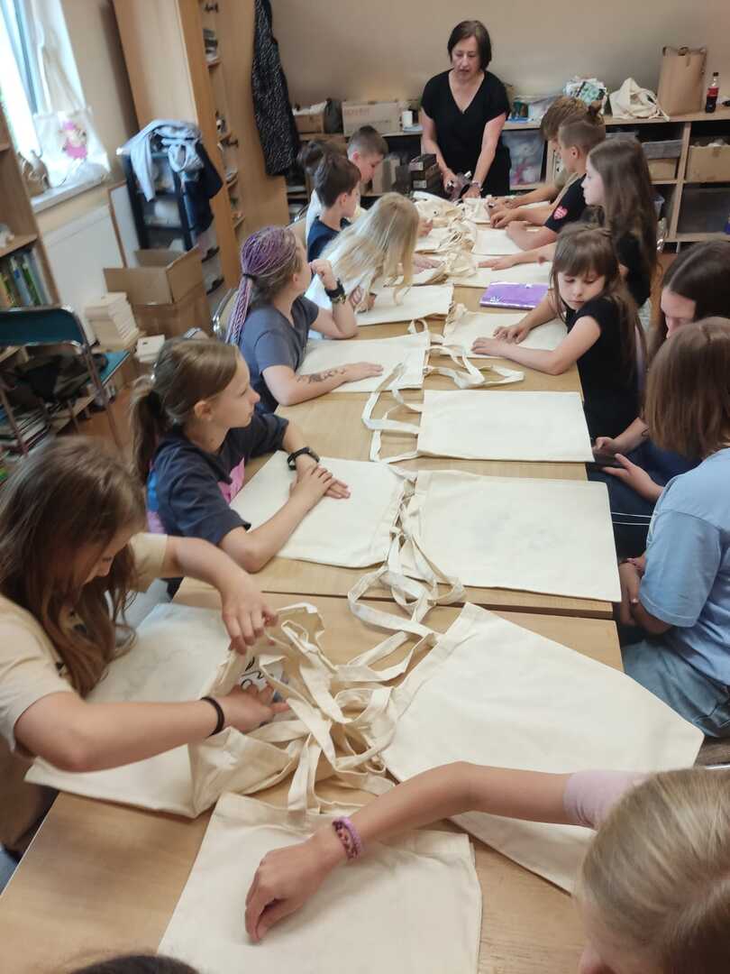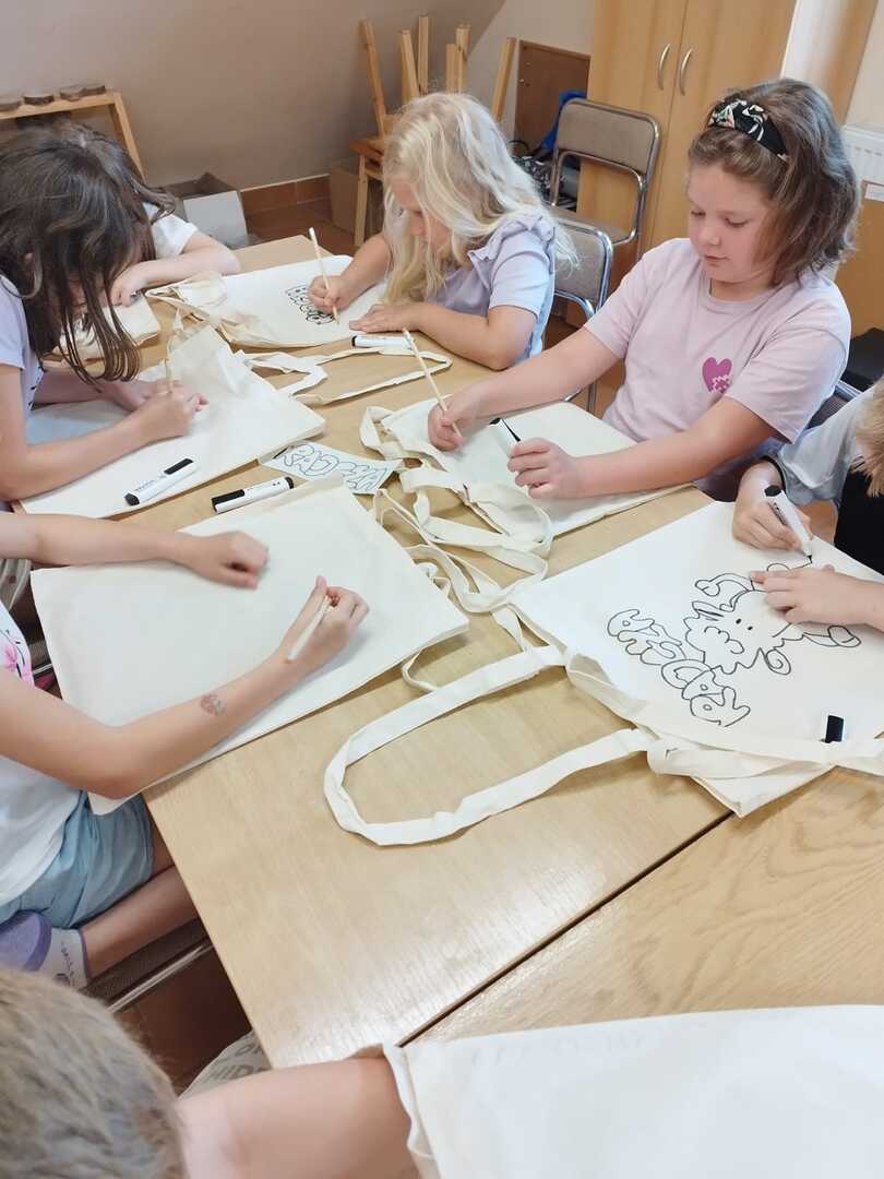 Drugim punktem programu były warsztaty malowania bawełnianych toreb na zakupy. To świetna okazja do rozwijania kreatywności i jednoczesnego promowania ekologicznych rozwiązań. Każdy uczestnik otrzymał bawełnianą torbę oraz zestaw farb, markery i szablony, z których można skorzystać. Podczas warsztatów uczniowie mogą wyrazić swoją indywidualność, tworząc oryginalne i praktyczne dzieła sztuki. Malowanie toreb to także świetna forma relaksu i odstresowania, a gotowe torby będą praktyczną pamiątką z wyjazdu.
