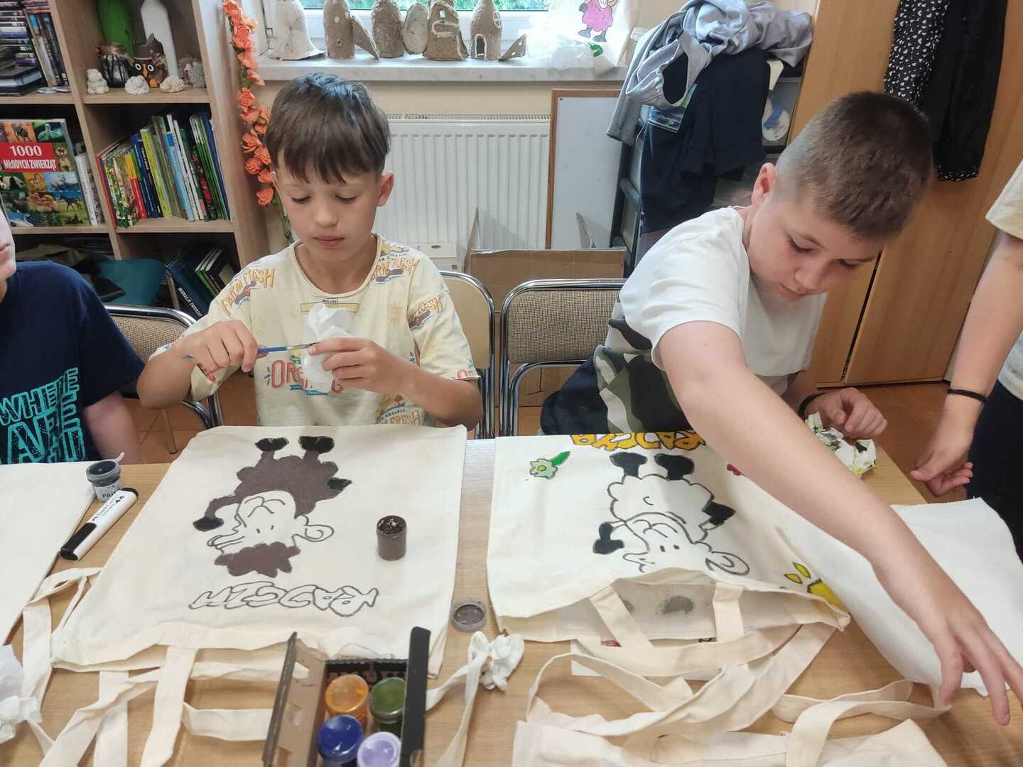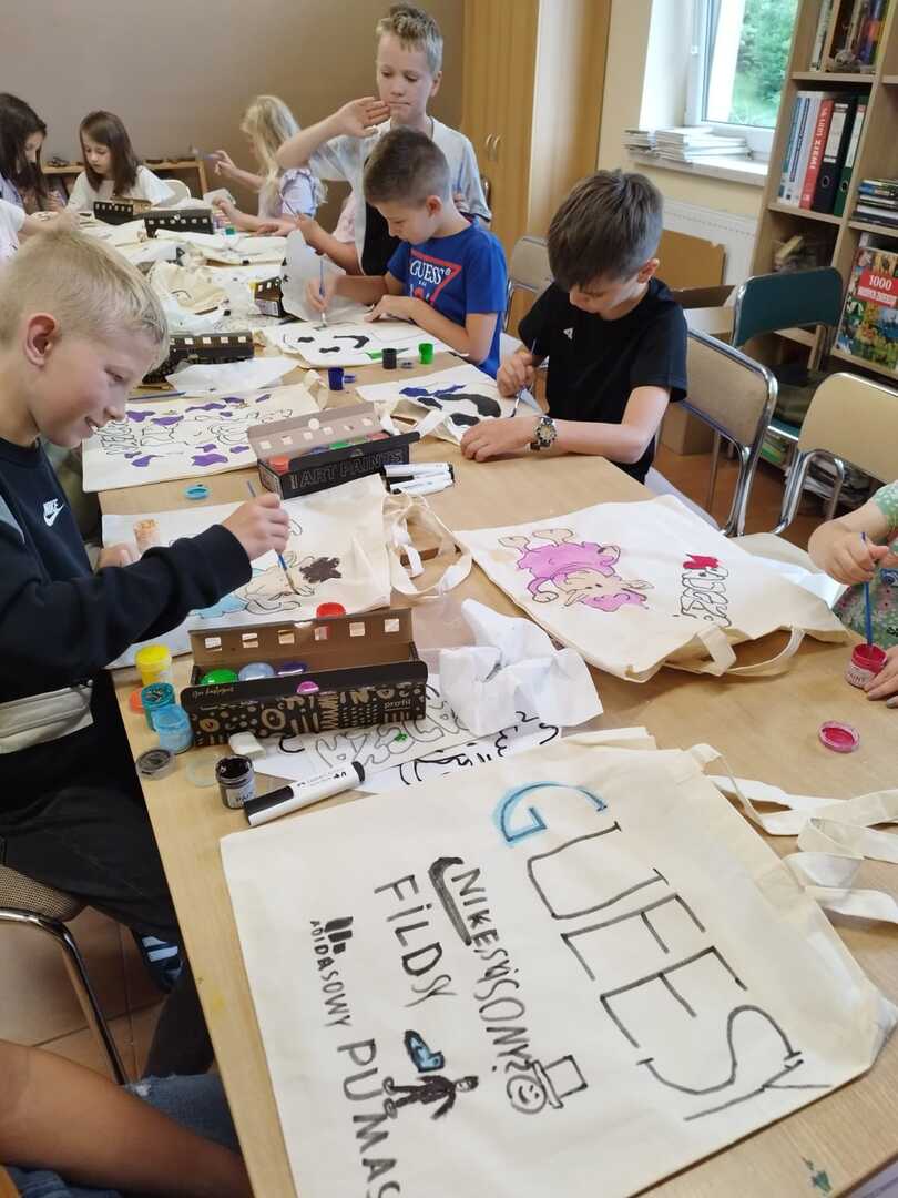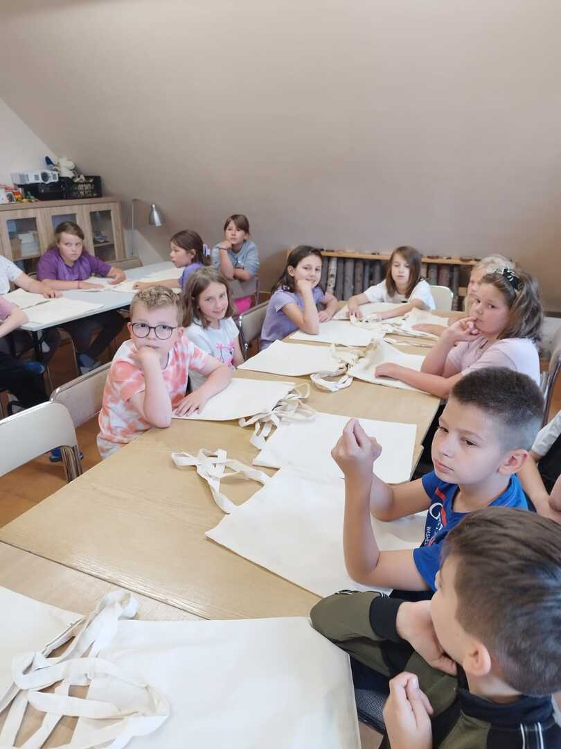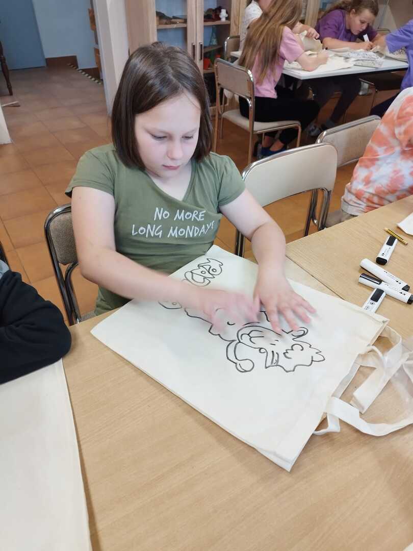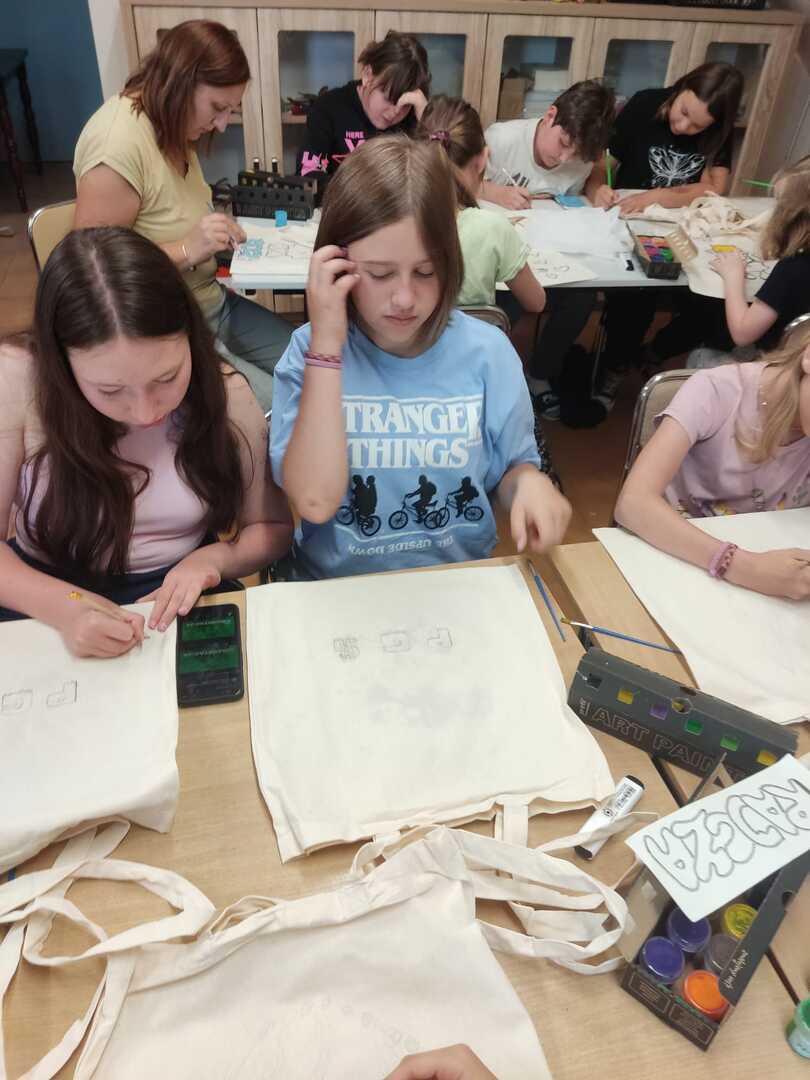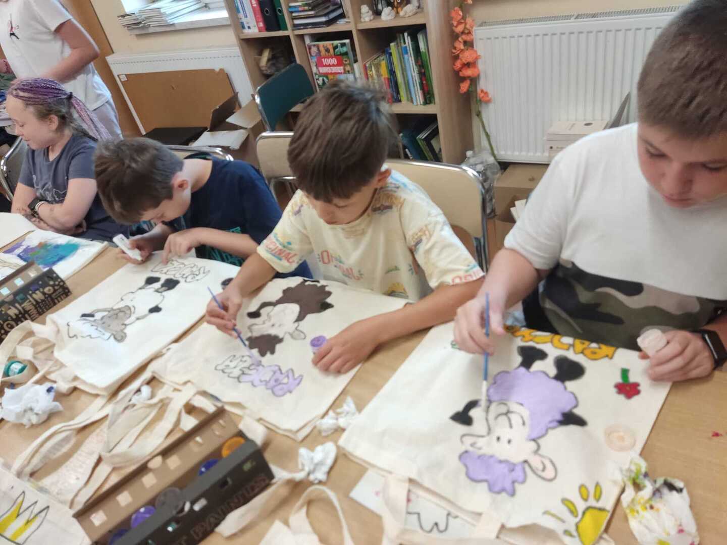 Drugim punktem programu były warsztaty malowania bawełnianych toreb na zakupy. To świetna okazja do rozwijania kreatywności i jednoczesnego promowania ekologicznych rozwiązań. Każdy uczestnik otrzymał bawełnianą torbę oraz zestaw farb, markery i szablony, z których można skorzystać. Podczas warsztatów uczniowie mogą wyrazić swoją indywidualność, tworząc oryginalne i praktyczne dzieła sztuki. Malowanie toreb to także świetna forma relaksu i odstresowania, a gotowe torby będą praktyczną pamiątką z wyjazdu.