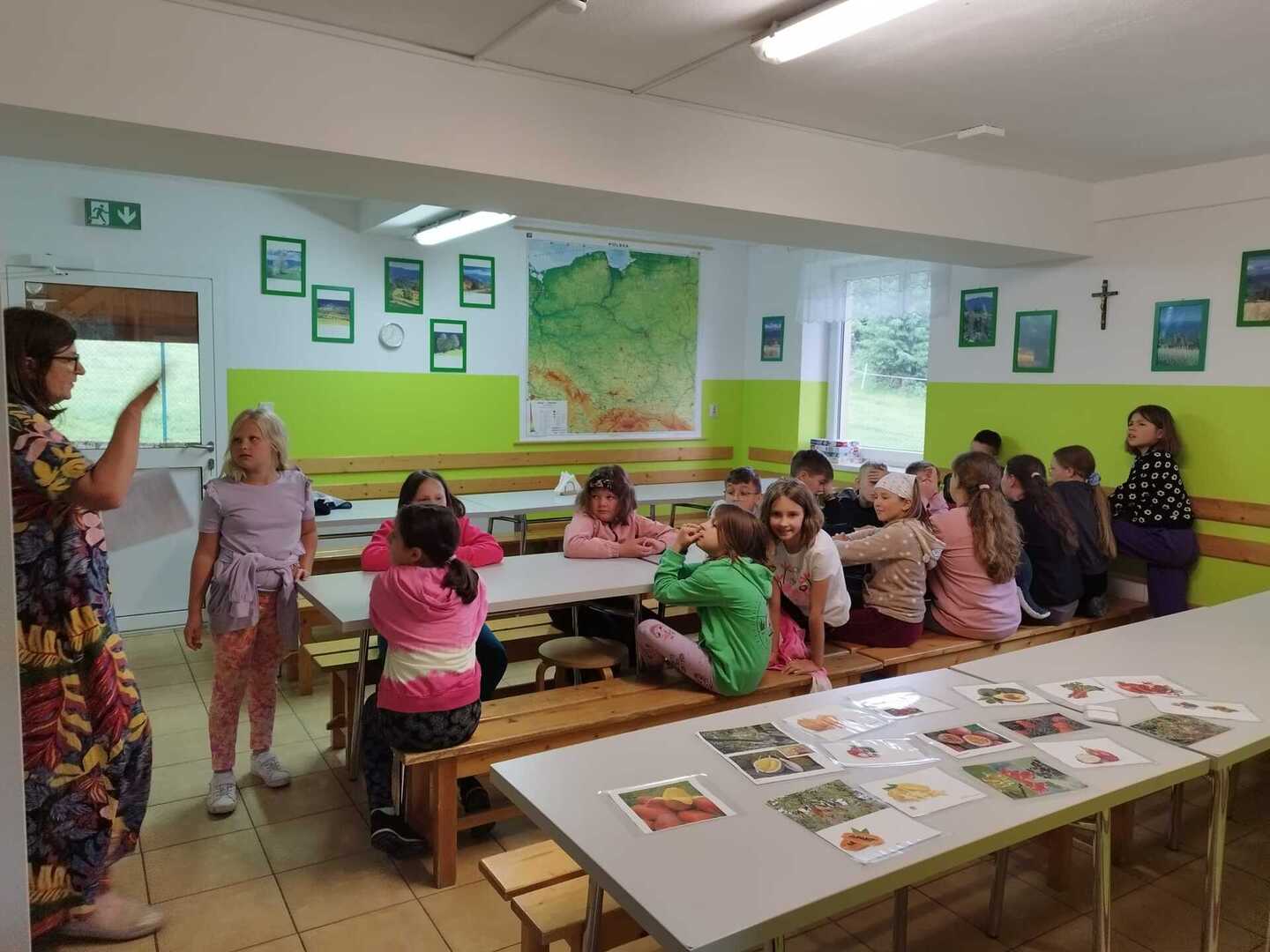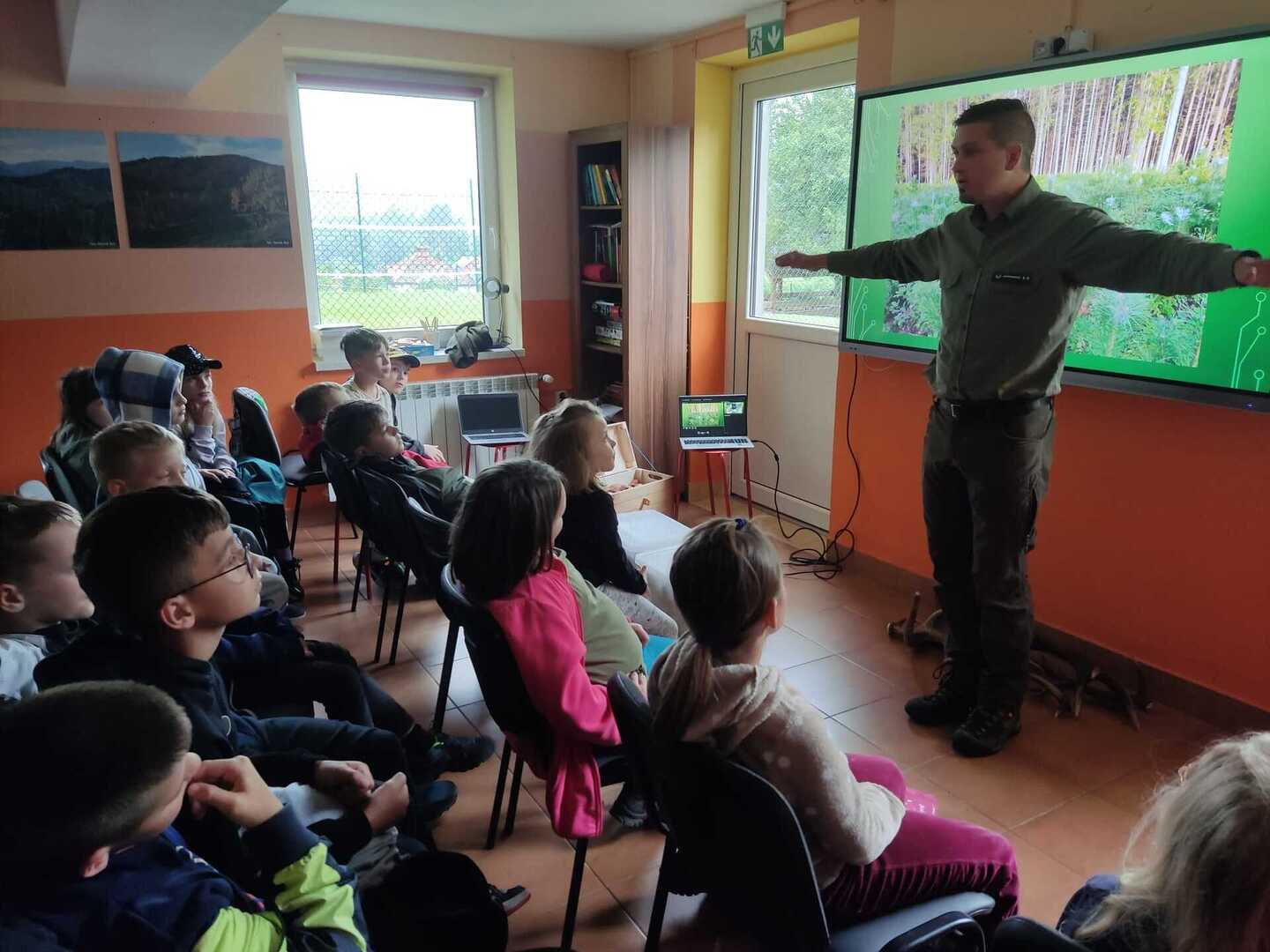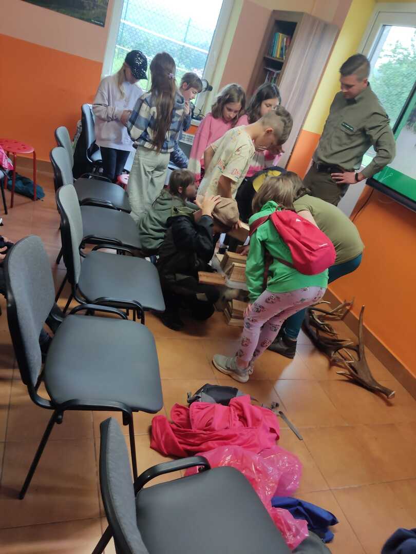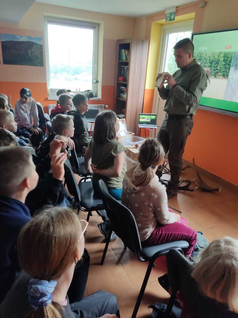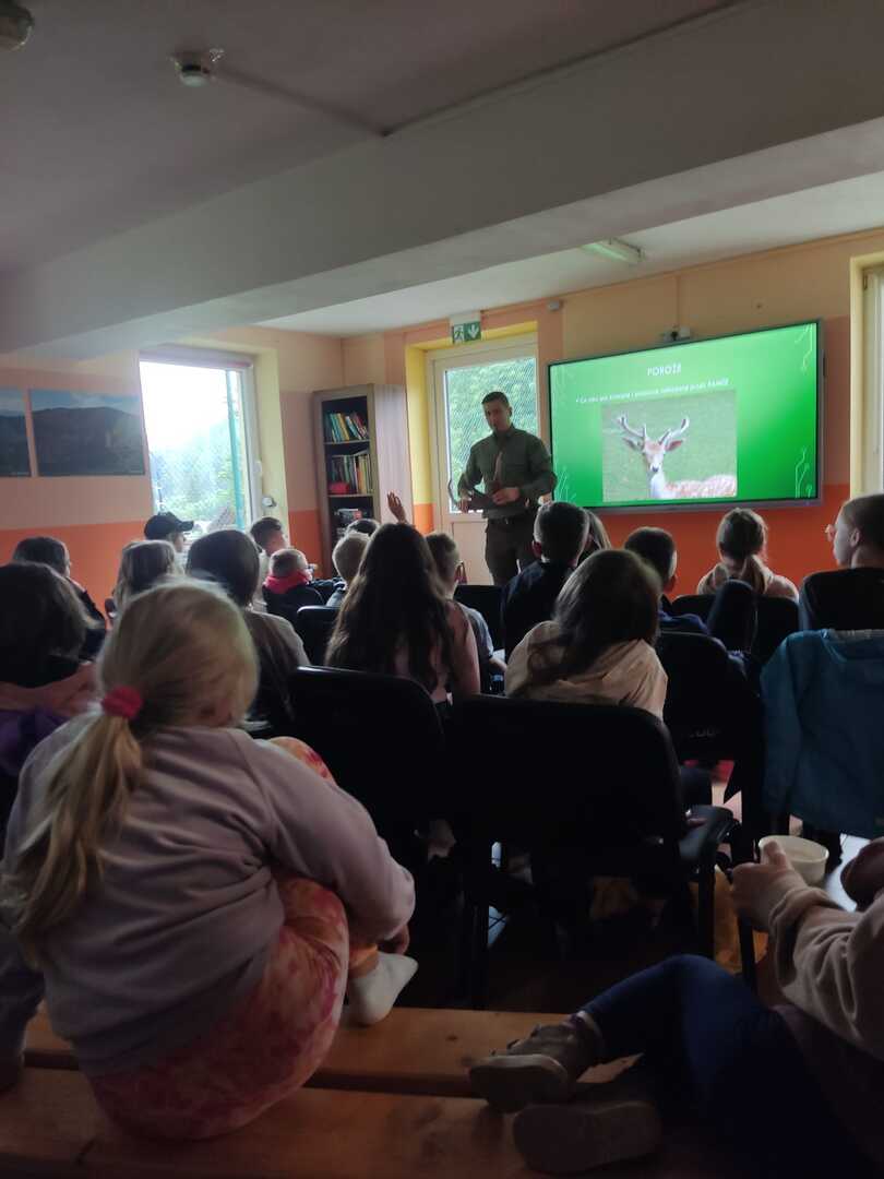 Po degustacji sałatki, ze względu na warunki pogodowe, uczniowie spotkali się z leśnikiem na terenie ośrodka, który jako jako ekspert w swojej dziedzinie, opowiedział o różnych gatunkach drzew, roślinach i zwierzętach zamieszkujących lasy.