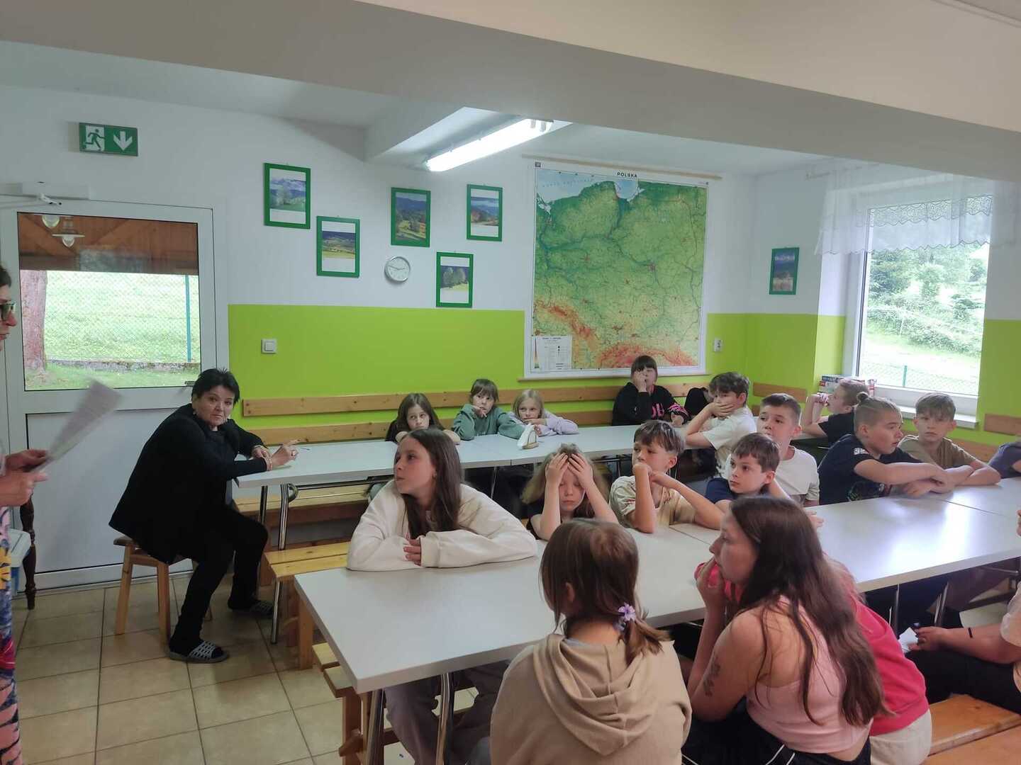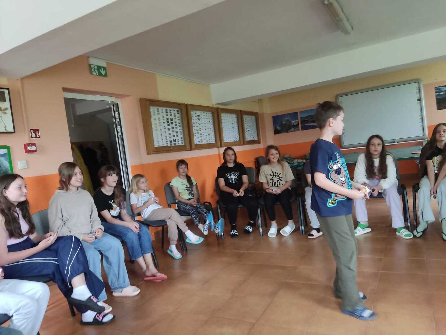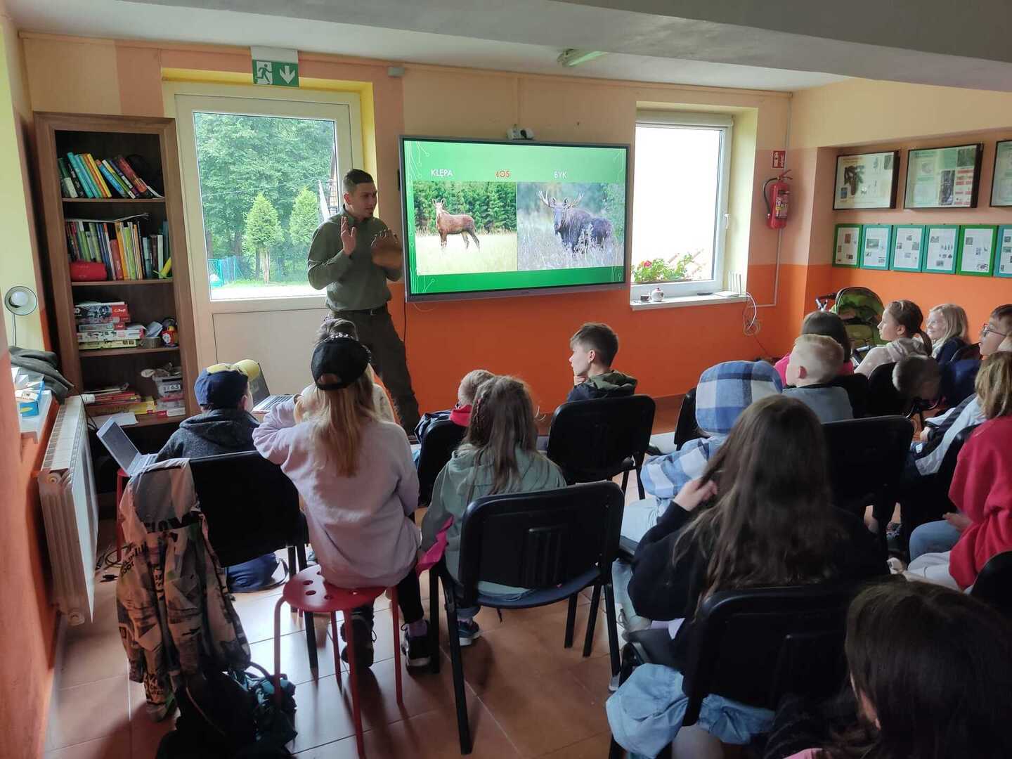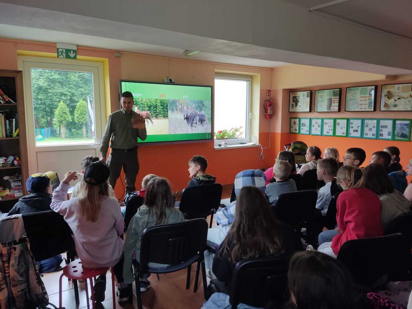 Po degustacji sałatki, ze względu na warunki pogodowe, uczniowie spotkali się z leśnikiem na terenie ośrodka, który jako jako ekspert w swojej dziedzinie, opowiedział o różnych gatunkach drzew, roślinach i zwierzętach zamieszkujących lasy.