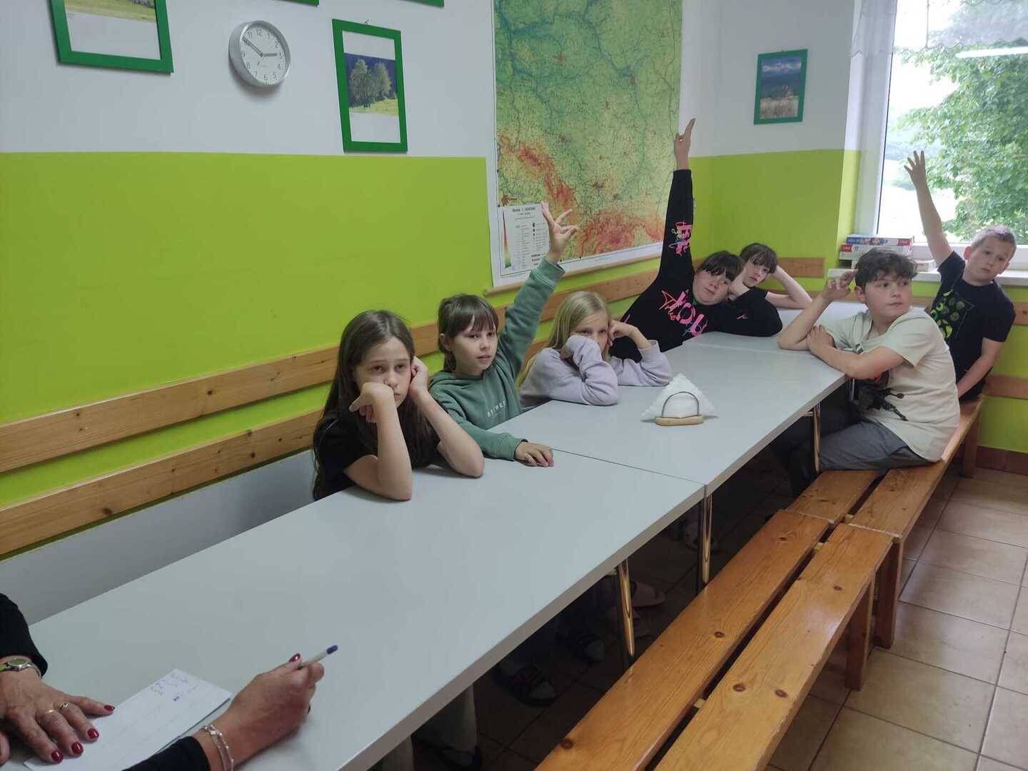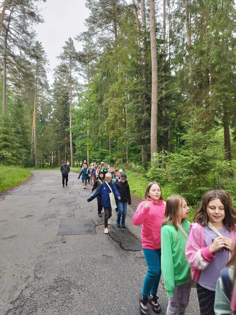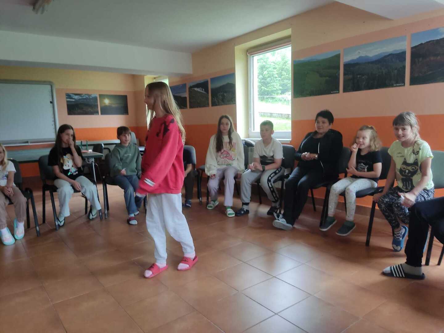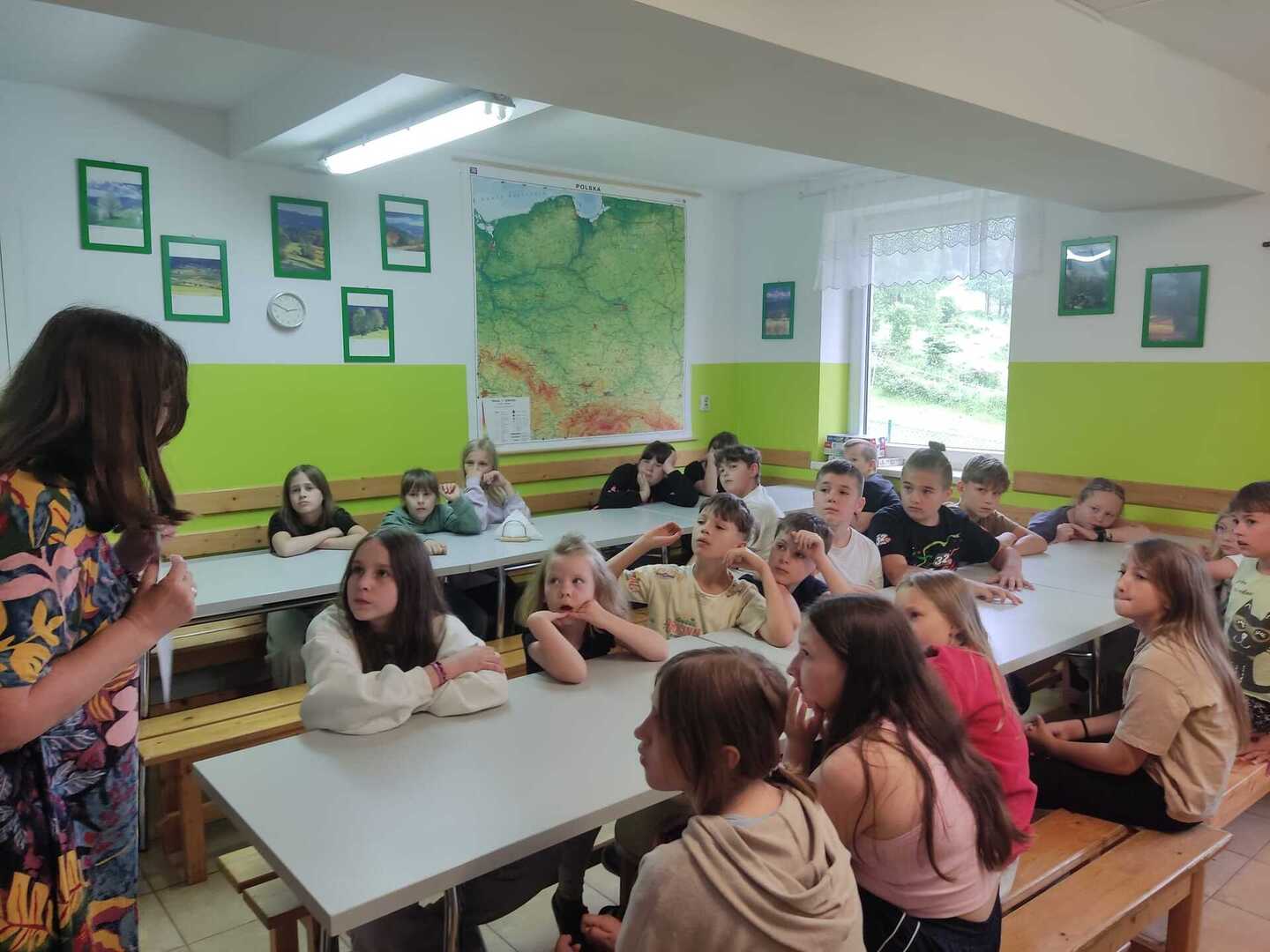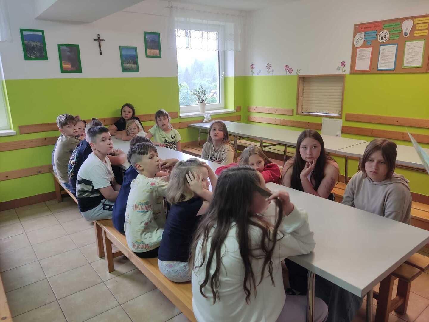 Po degustacji sałatki, ze względu na warunki pogodowe, uczniowie spotkali się z leśnikiem na terenie ośrodka, który jako jako ekspert w swojej dziedzinie, opowiedział o różnych gatunkach drzew, roślinach i zwierzętach zamieszkujących lasy.