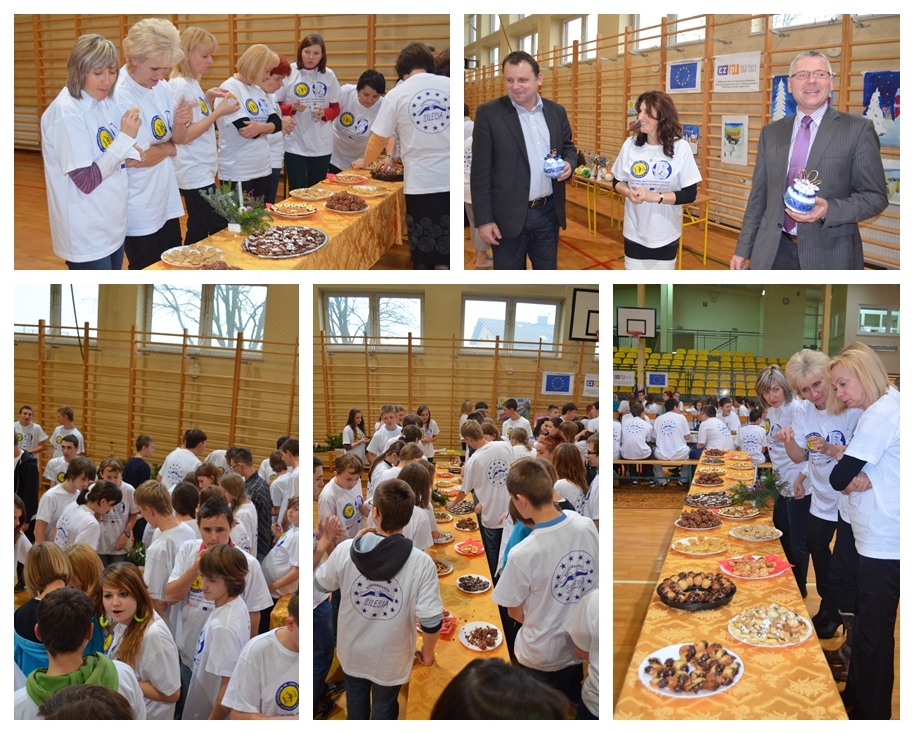 Wszystko rozpoczęło się od oficjalnego powitania uczestników projektu i zaproszonych gości na sali gimnastycznej, po czym uczniowie rozeszli się do klas, gdzie zgodnie z wcześniejszymi ustaleniami w 10- 12 osobowych zespołach pod opieką nauczycieli i chętnych rodziców rozpoczęli część warsztatową. Pięć ekip, głównie w salach na parterze, zaangażowało się w świąteczne wypieki. Uczniowie własnoręcznie przygotowywali i piekli różnorodne pierniki, jeden zespół gotował moczkę. Na piętrze zaś odbywały się warsztaty artystyczne. Uczniowie wykonywali różną techniką świąteczne bombki, anioły, i kartki oraz malowali farbami zimowe pejzaże. Warsztaty trwały z krótką przerwą na słodki poczęstunek w postaci gorącej herbaty makowca, cukierków i mandarynek od 9.30 do 13.30. Wszystko zakończyło się na sali gimnastycznej ok. 14. 00 wspólnym uroczystym obiadem, po którym każdy mógł podziwiać na wystawce wykonane przez uczniów prace i spróbować przygotowanych przysmaków: świątecznych pierników i moczki. Na pamiątkę każdy z uczestników projektu otrzymał długopis i koszulkę z logo projektu.
