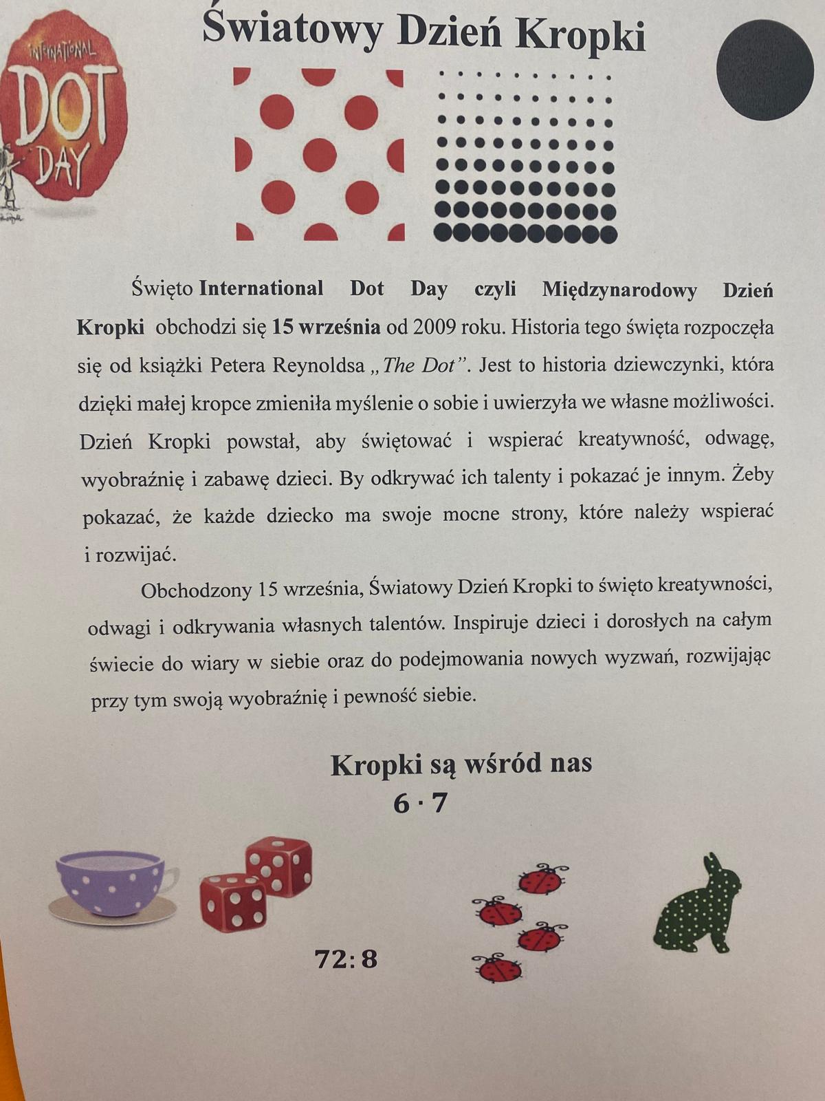 Inspiracją do obchodów była książka Petera H. Reynoldsa „Kropka”, która przypomina, że każdy z nas ma w sobie ukryty potencjał – wystarczy tylko odrobina odwagi, by go odkryć i rozwijać.