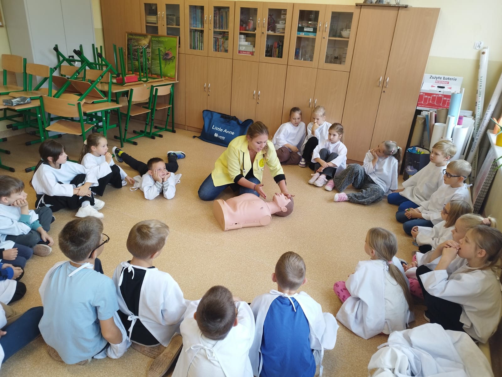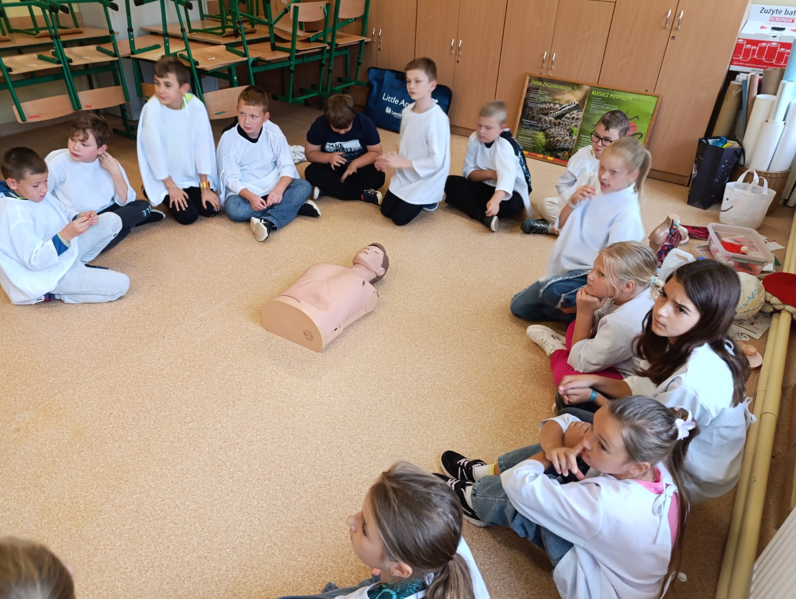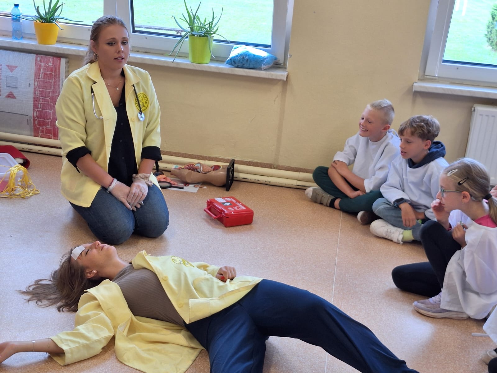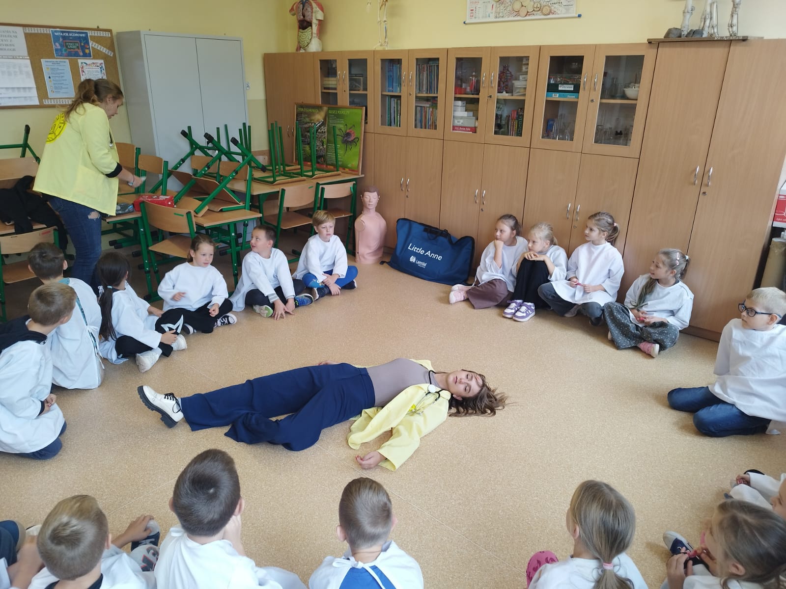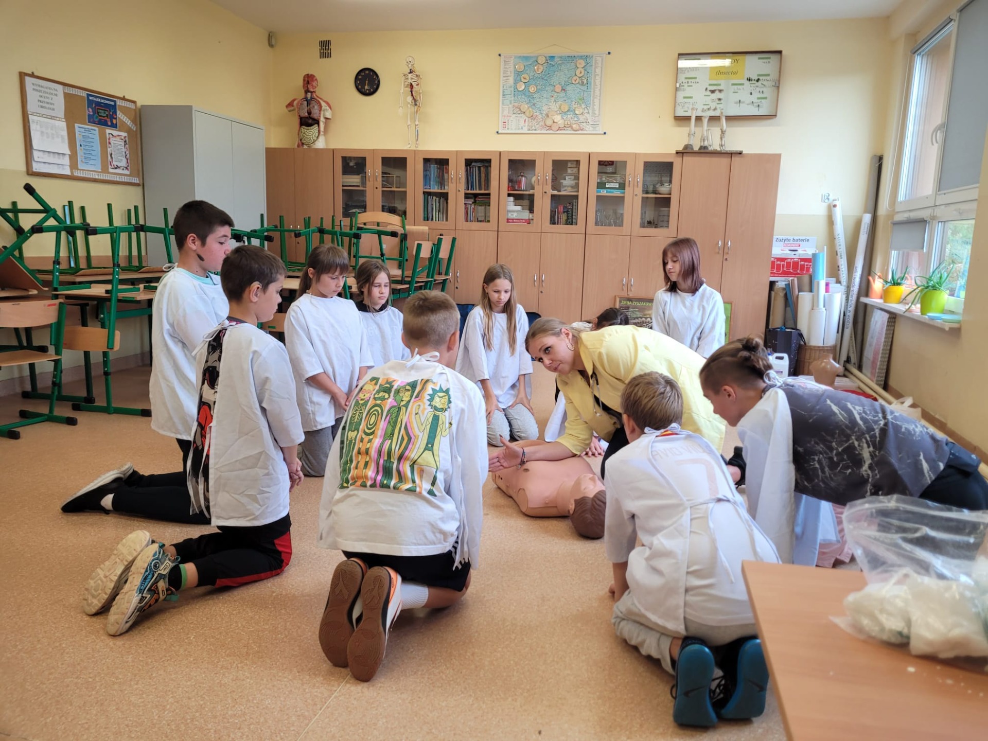 Każde dziecko brało czynny udział w zajęciach – nie było tu miejsca na nudę! Uczniowie uczyli się podstaw udzielania pierwszej pomocy, wykonywali resuscytację krążeniowo-oddechową (RKO) oraz poznali wiele ciekawych informacji dotyczących budowy i funkcjonowania ciała człowieka.