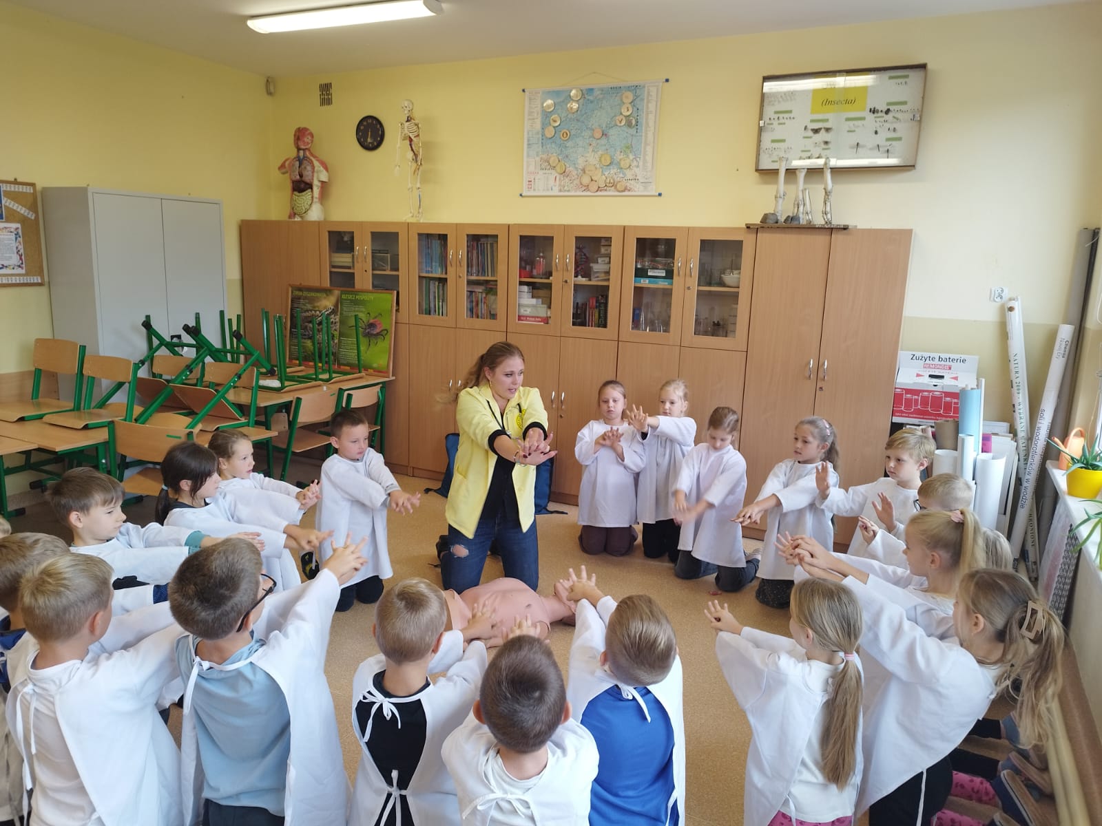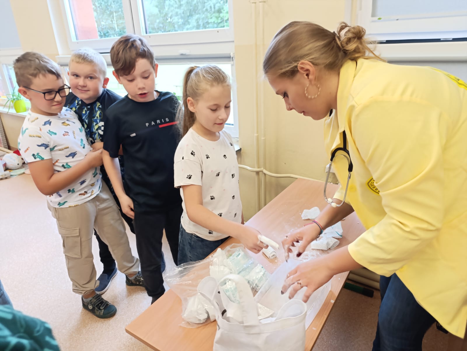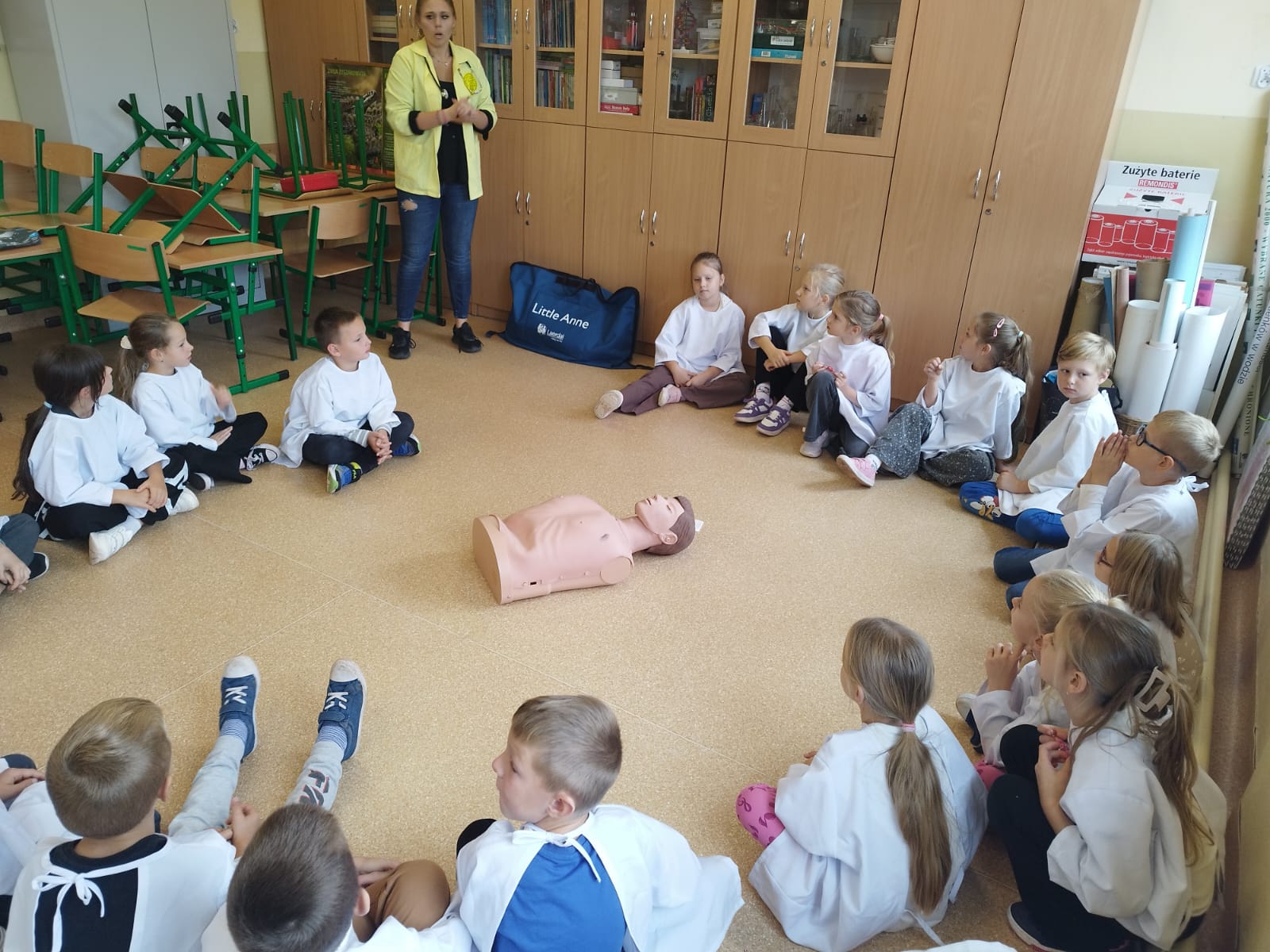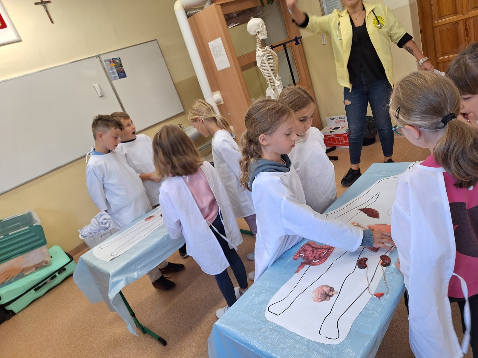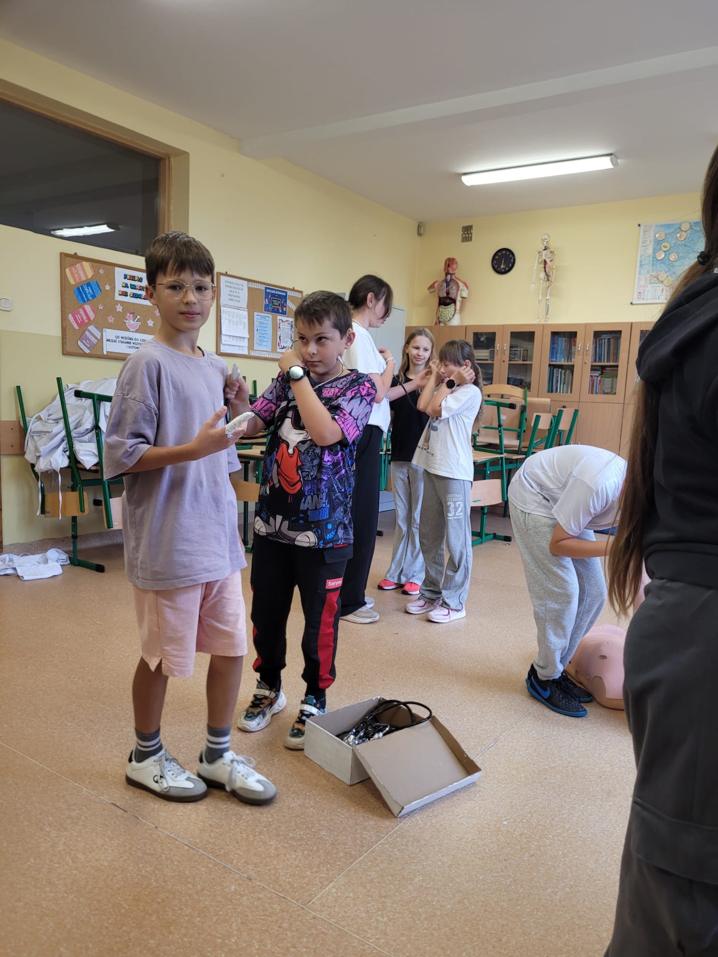 Każde dziecko brało czynny udział w zajęciach – nie było tu miejsca na nudę! Uczniowie uczyli się podstaw udzielania pierwszej pomocy, wykonywali resuscytację krążeniowo-oddechową (RKO) oraz poznali wiele ciekawych informacji dotyczących budowy i funkcjonowania ciała człowieka.