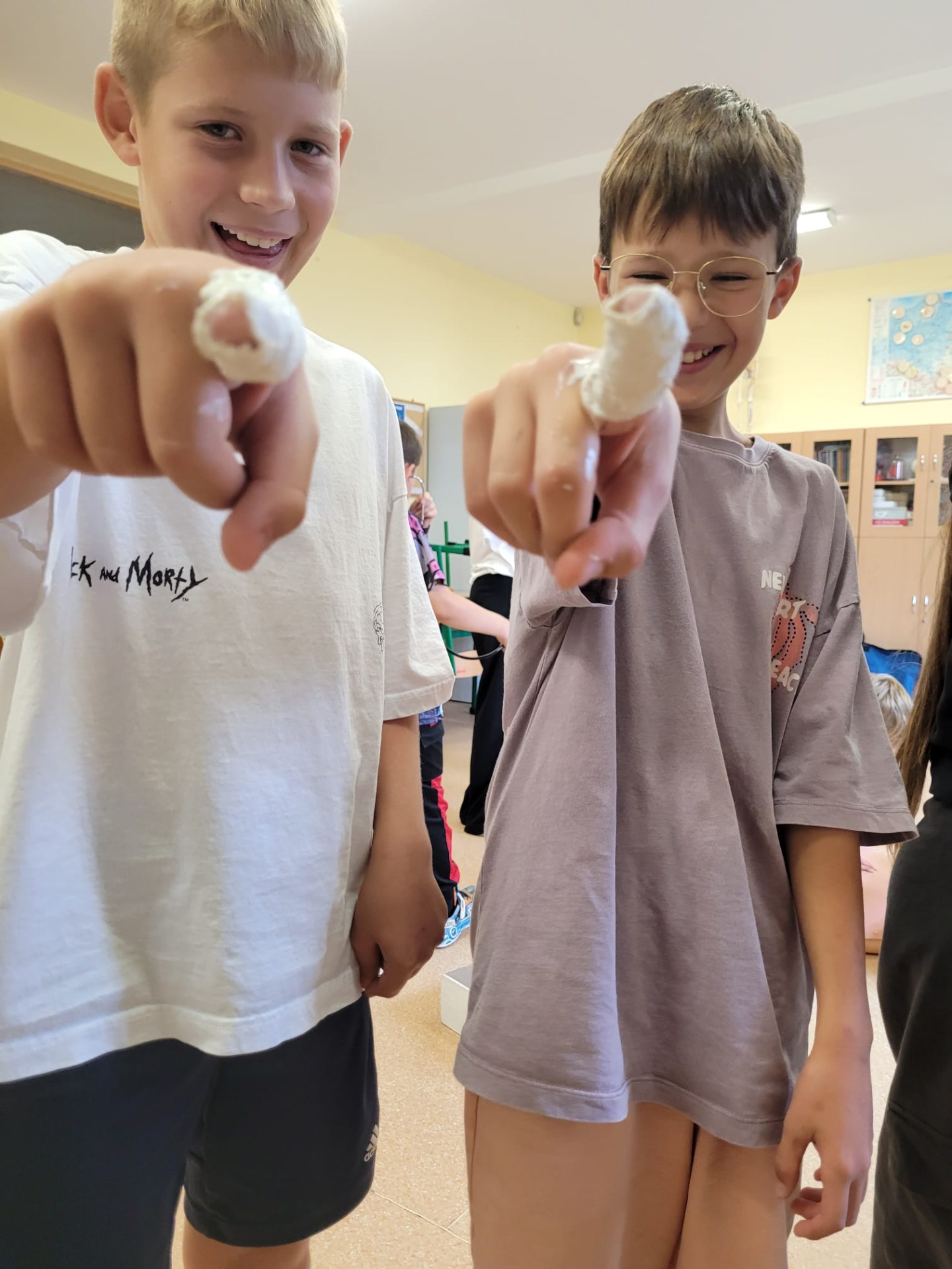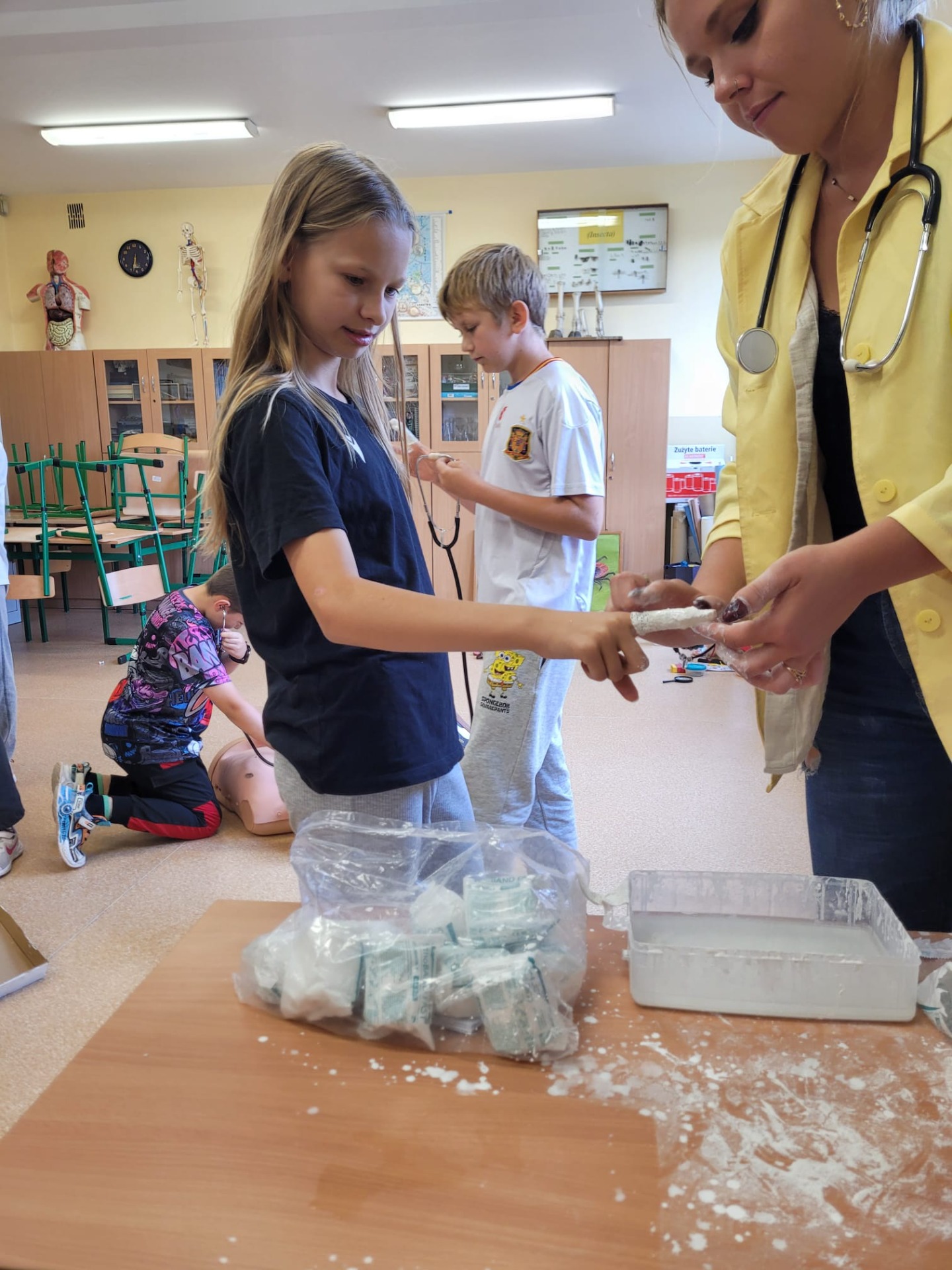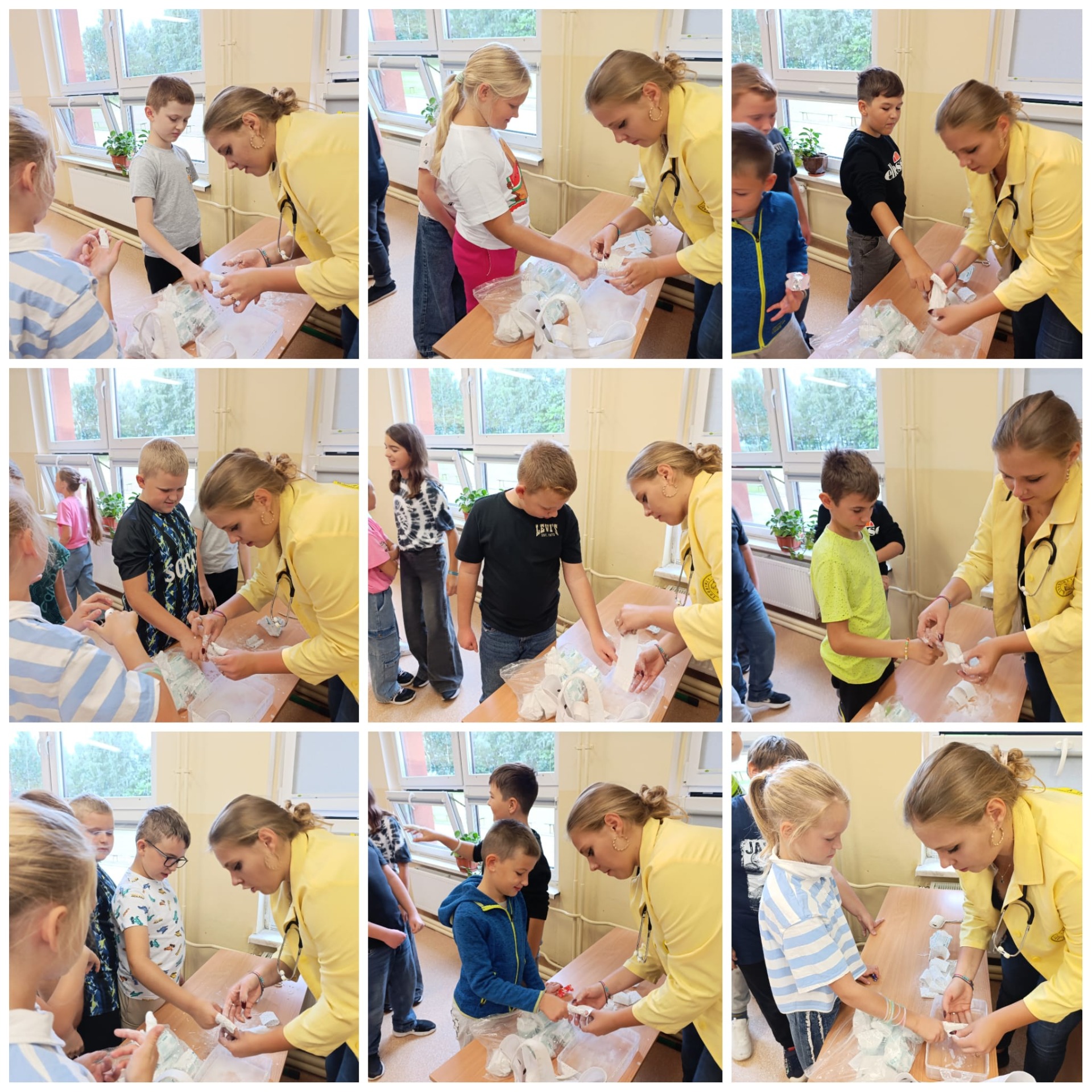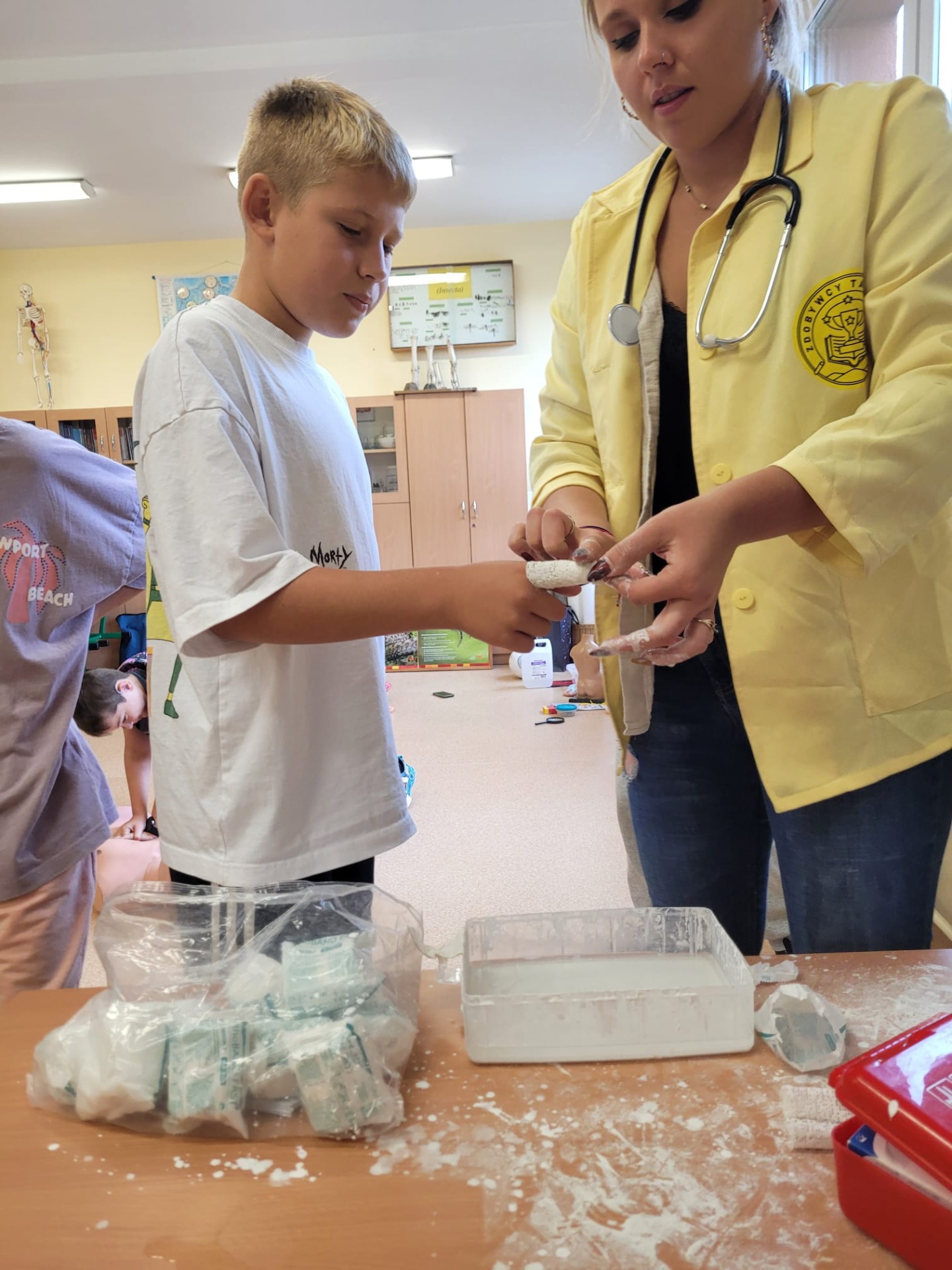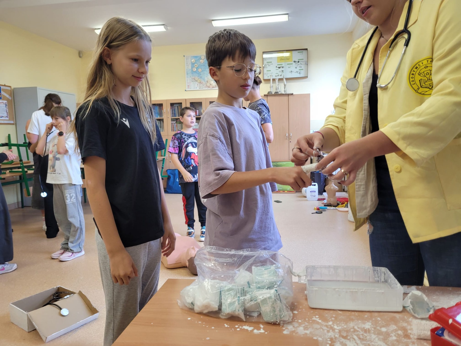 Największą atrakcją okazało się zakładanie gipsu na palec – chętni uczniowie mogli zobaczyć i poczuć, jak wygląda taki zabieg w praktyce.