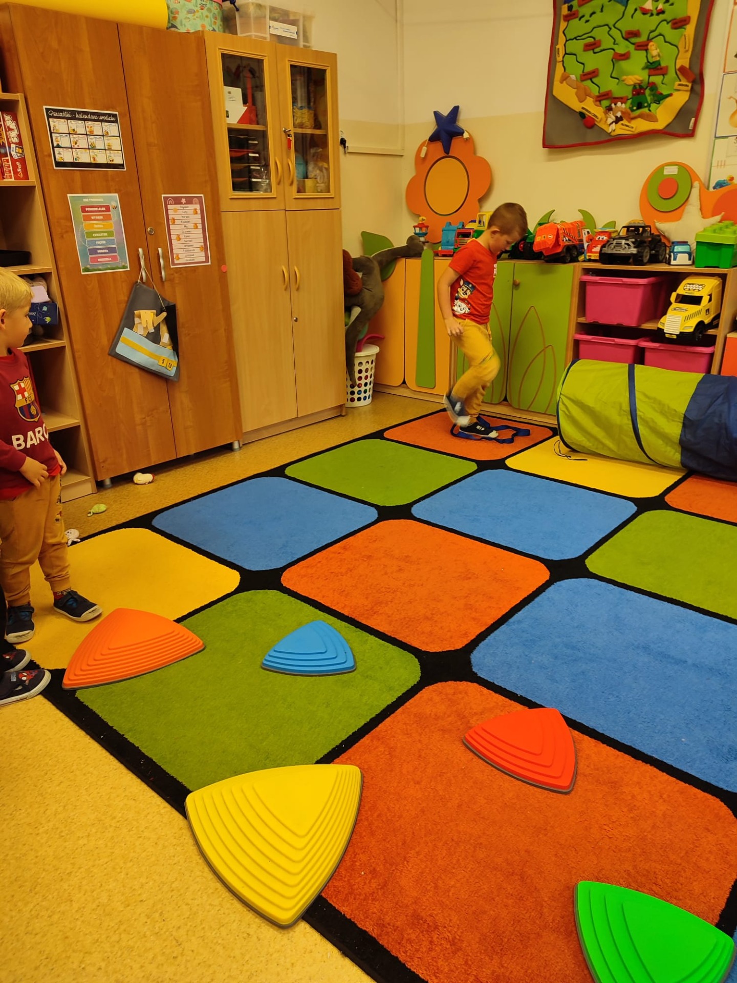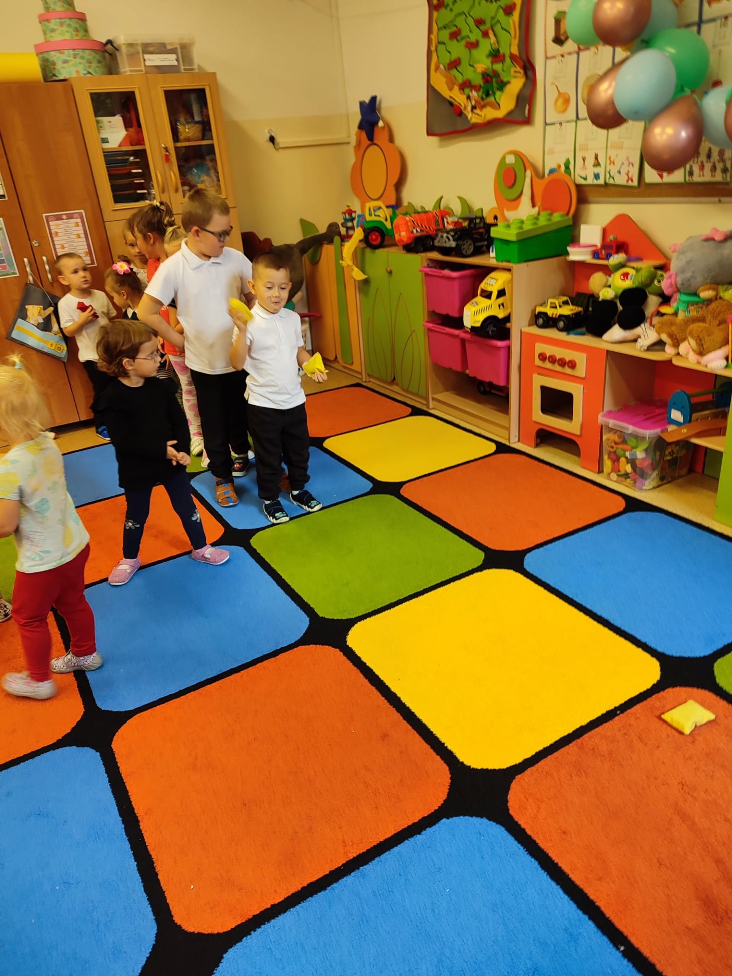 W przedszkolnej sali czekały na dzieci ciekawe konkurencje – wspólna gimnastyka, tor przeszkód oraz rzucanie woreczkami do celu. Każda z aktywności była okazją do rozwijania sprawności ruchowej, koordynacji oraz współpracy w grupie.