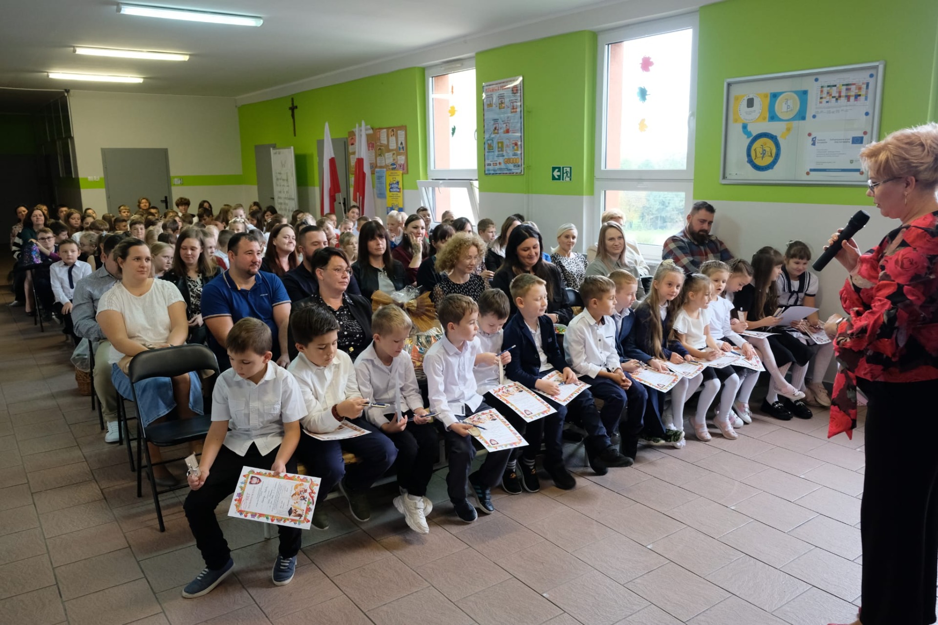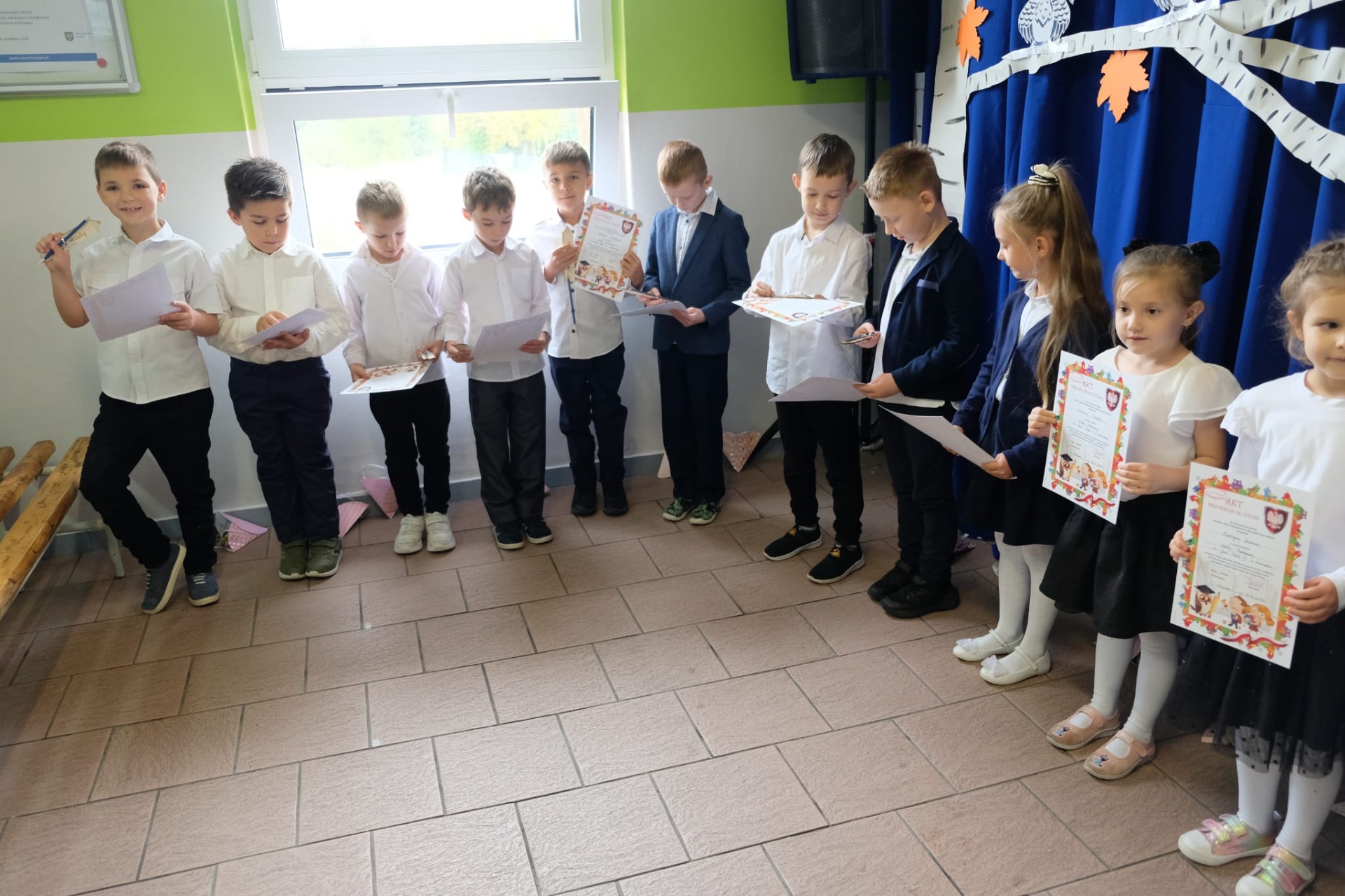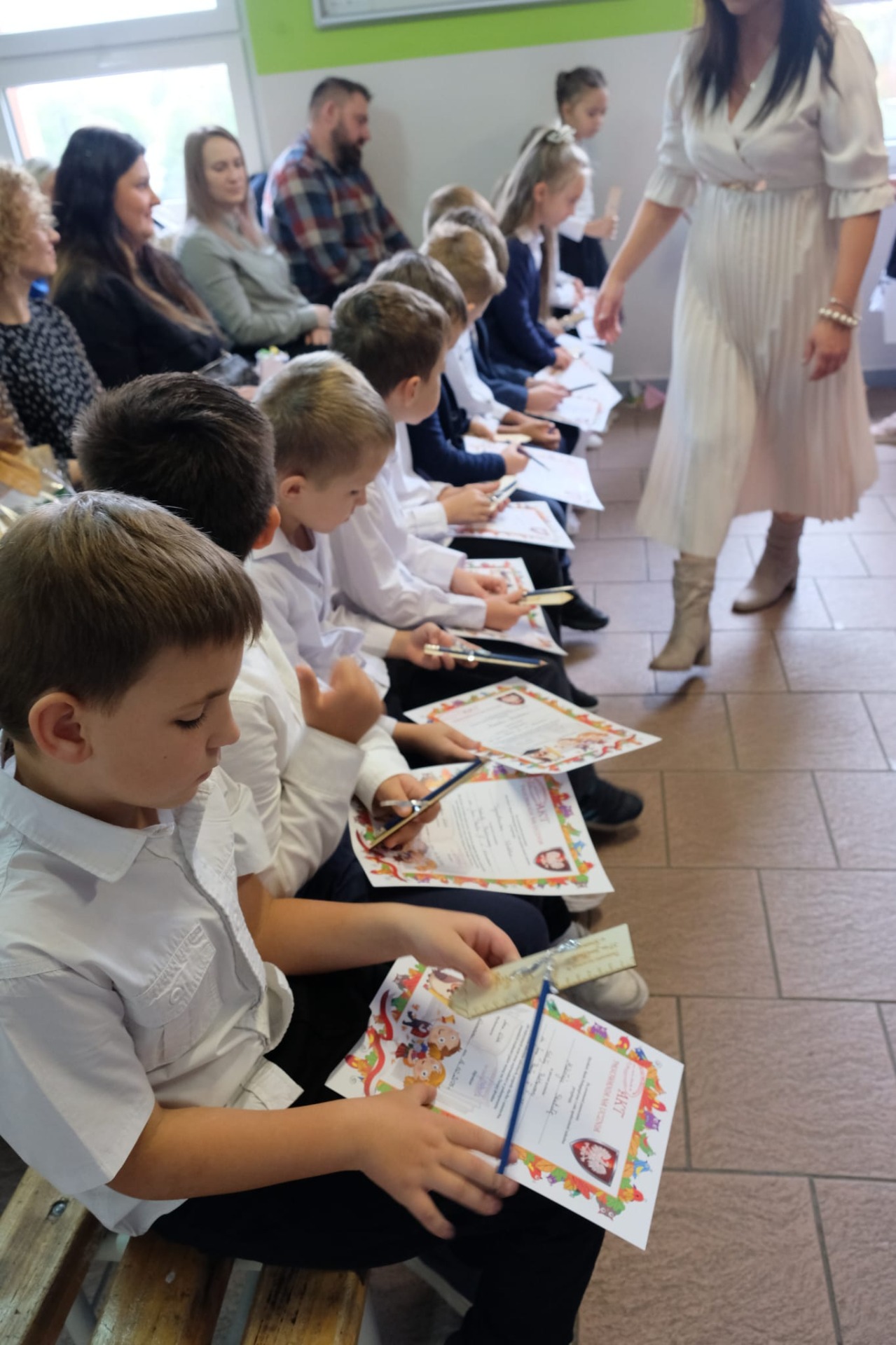 W tym roku do grona społeczności szkolnej dołączyło czternastu pierwszoklasistów. W obecności dyrekcji, nauczycieli, rodziców i starszych kolegów złożyli oni uroczyste ślubowanie, obiecując pilnie się uczyć, dbać o dobre imię szkoły oraz być dobrymi i życzliwymi kolegami. Następnie Pani Dyrektor symbolicznym ołówkiem dokonała aktu pasowania na ucznia, a nowo przyjęci pierwszoklasiści otrzymali pamiątkowe dyplomy i drobne upominki.