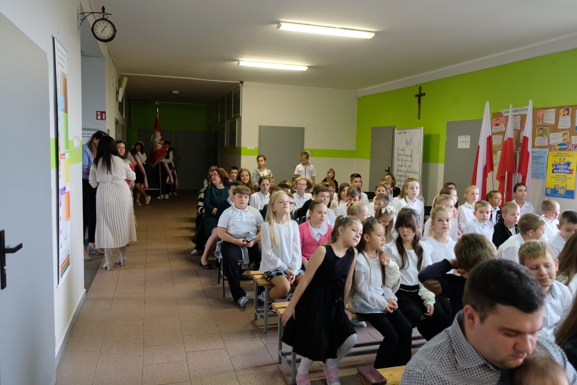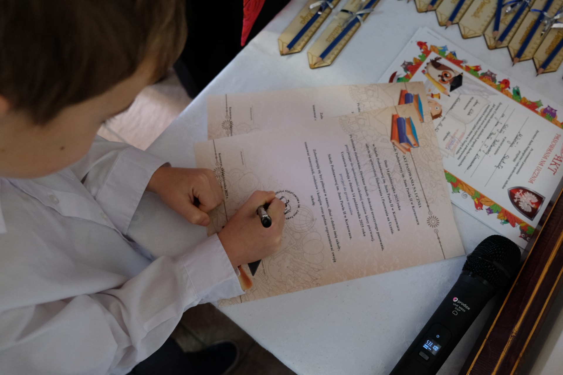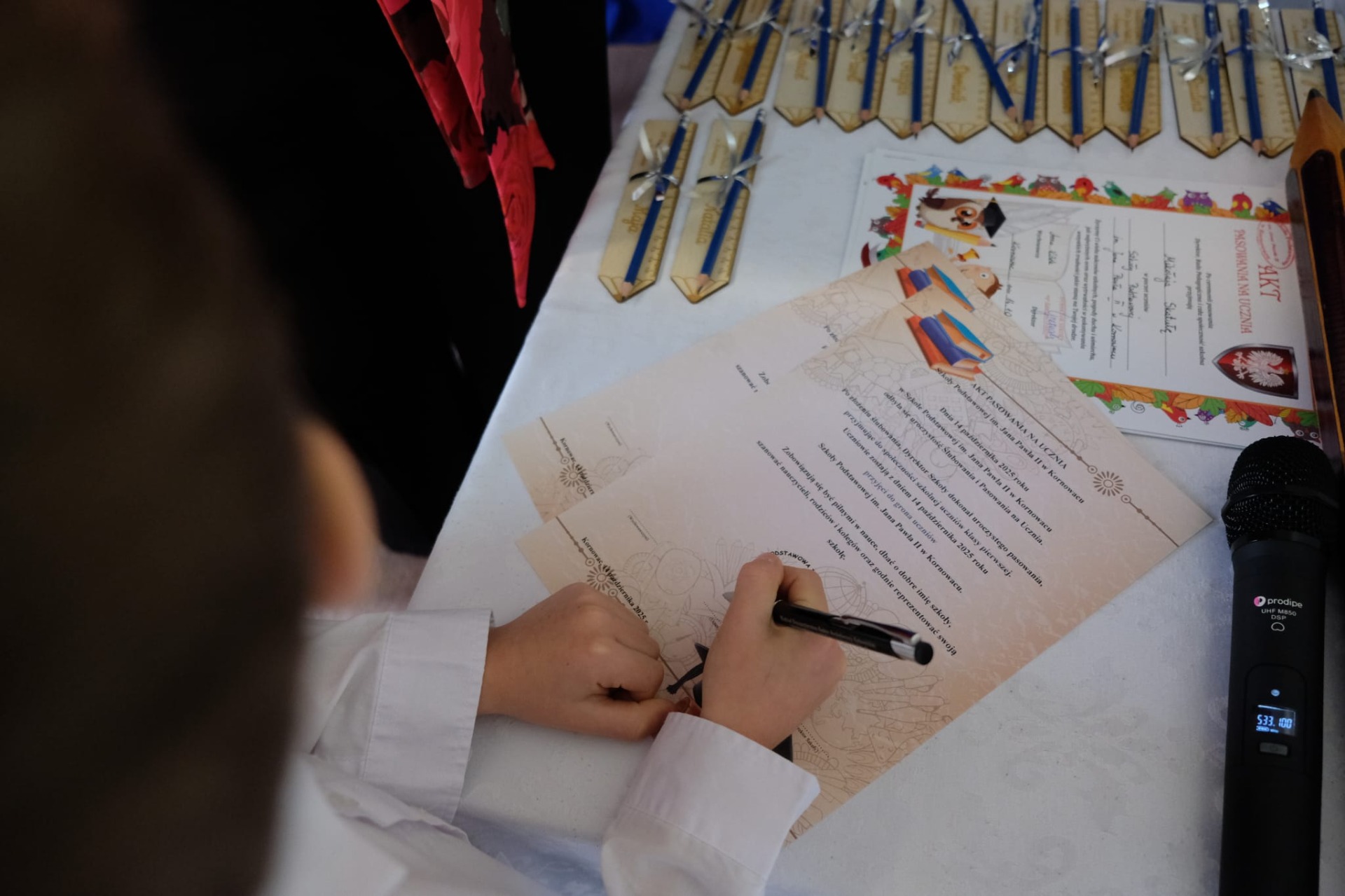 W tym roku do grona społeczności szkolnej dołączyło czternastu pierwszoklasistów. W obecności dyrekcji, nauczycieli, rodziców i starszych kolegów złożyli oni uroczyste ślubowanie, obiecując pilnie się uczyć, dbać o dobre imię szkoły oraz być dobrymi i życzliwymi kolegami. Następnie Pani Dyrektor symbolicznym ołówkiem dokonała aktu pasowania na ucznia, a nowo przyjęci pierwszoklasiści otrzymali pamiątkowe dyplomy i drobne upominki.