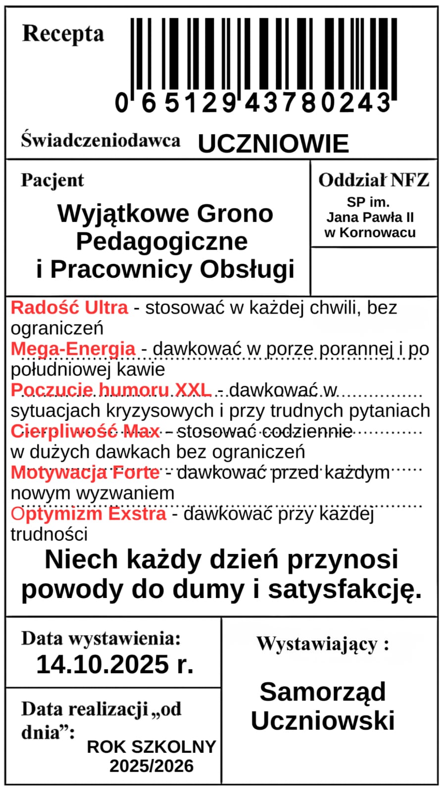 Z okazji Dnia Edukacji Narodowej wszystkim nauczycielom i pracownikom szkoły składamy serdeczne podziękowania za trud, zaangażowanie i serce wkładane w codzienną pracę z uczniami, a naszym pierwszoklasistom życzymy wielu sukcesów, radości z nauki i wspaniałych chwil w murach naszej szkoły.
