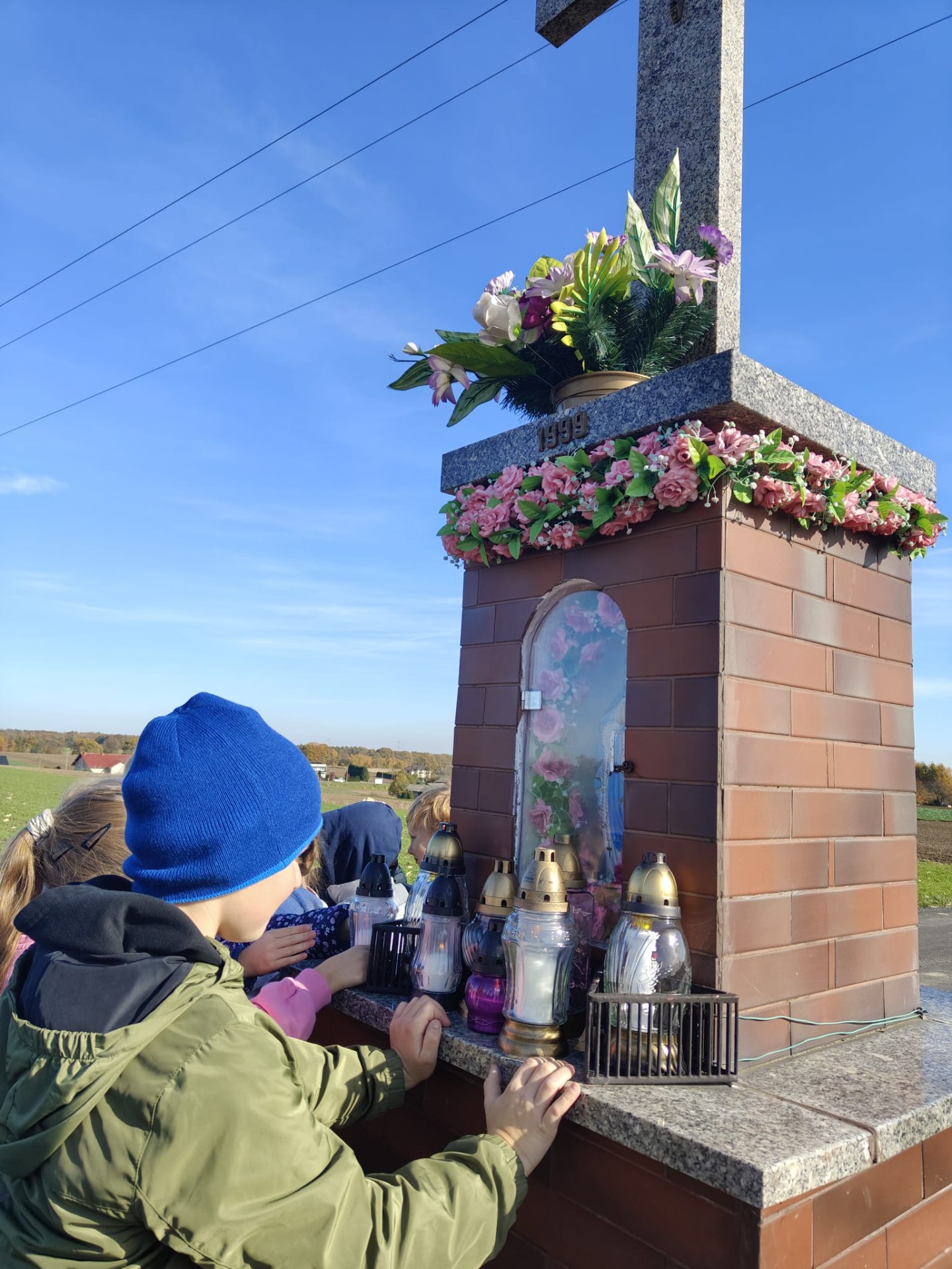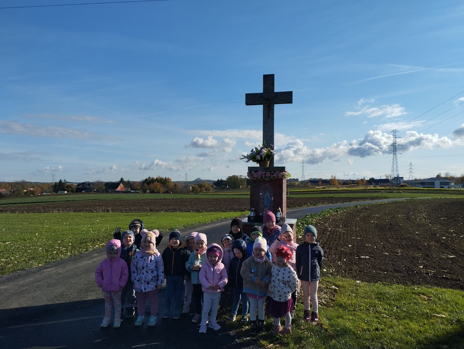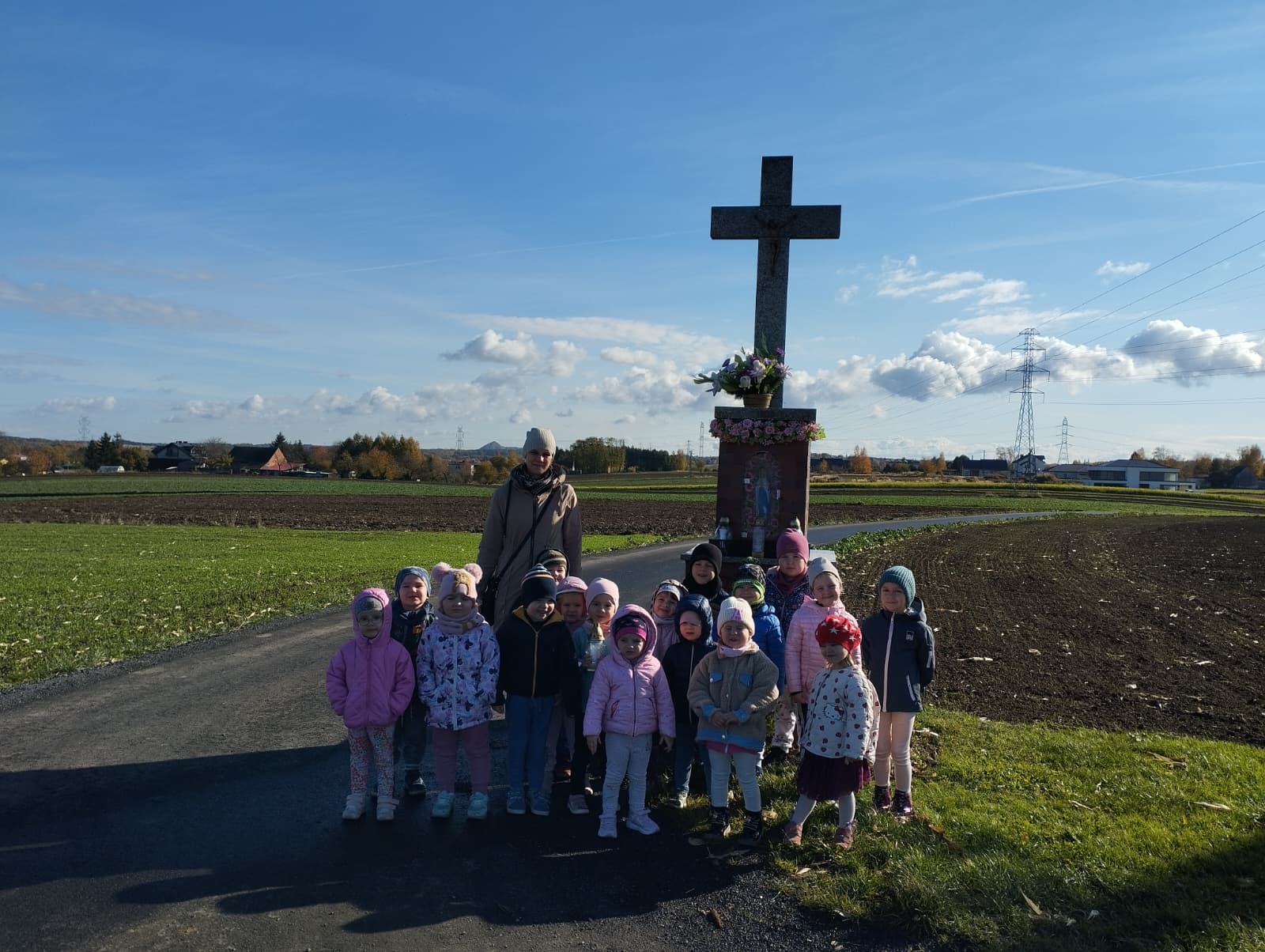 W tym tygodniu uczniowie klas 1–3 wraz z dziećmi z przedszkola udali się na krótką wycieczkę do pobliskiego przydrożnego krzyża oraz obelisku poświęconego Janowi Pawłowi II. Wspólne wyjście miało na celu kształtowanie pamięci o ważnych miejscach naszej lokalnej historii oraz rozwijanie postawy szacunku i refleksji.