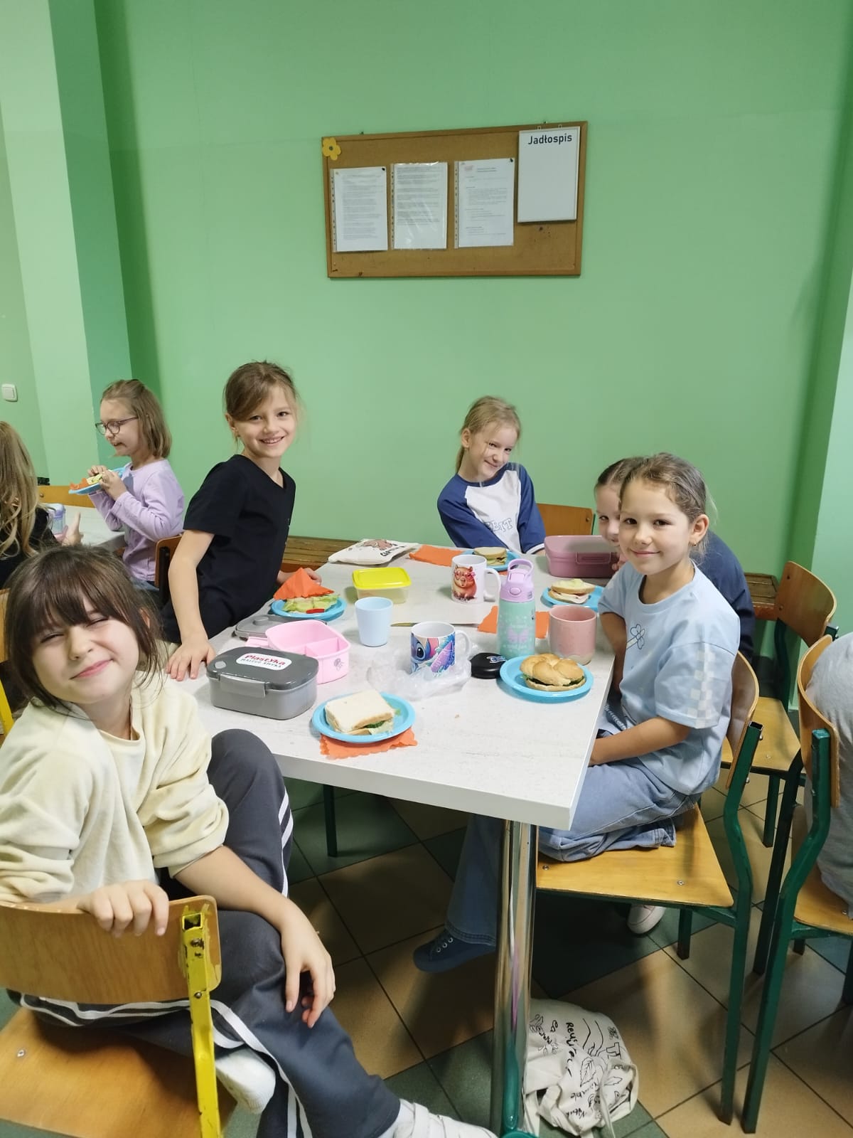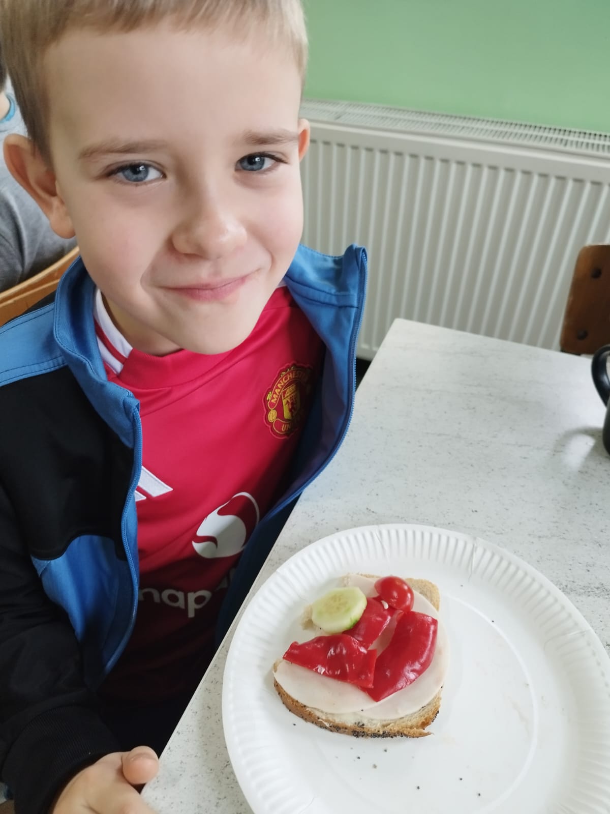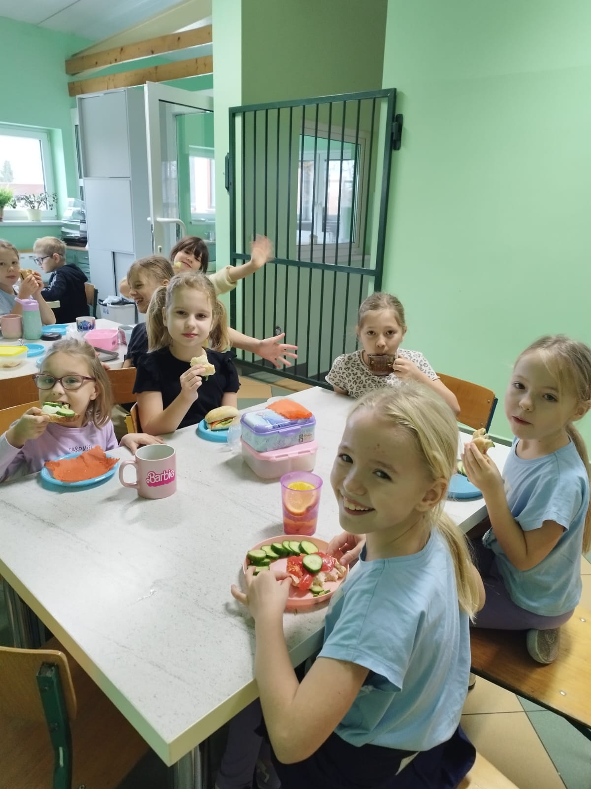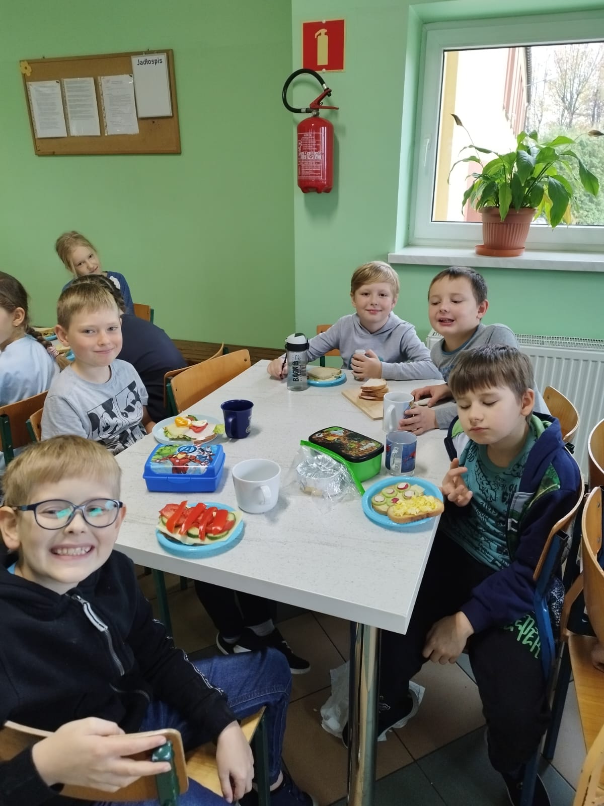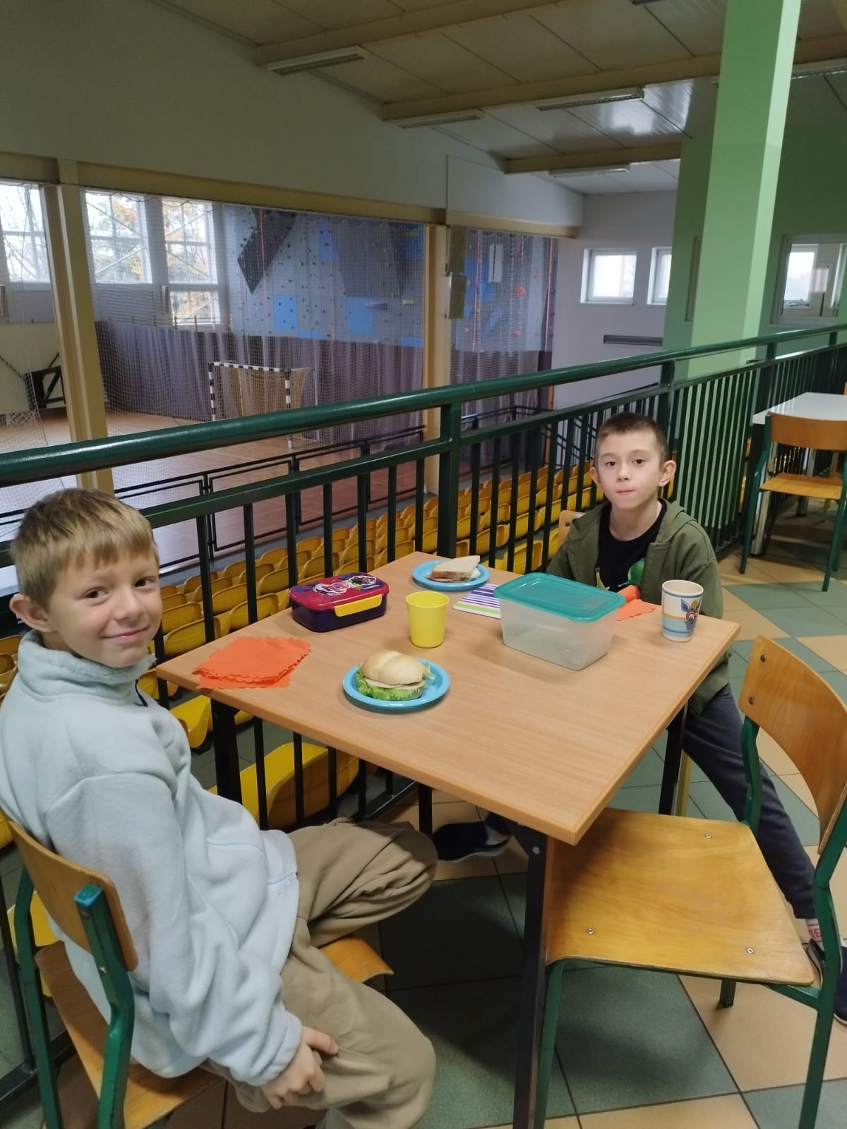 W poniedziałek, 3 listopada, uczniowie klasy drugiej świętowali Dzień Kanapki. Tego dnia na szkolnej stołówce unosiły się zapachy świeżego pieczywa, warzyw i aromatycznej, jesiennej herbaty. Dzieci z ogromnym zaangażowaniem przygotowywały swoje własne, zdrowe kanapki. Każdy mógł samodzielnie skomponować ulubione połączenie smaków, pamiętając o obowiązkowym składniku – warzywie. Na stołach pojawiły się kolorowe pomidory, ogórki, papryka, sałata, szczypiorek, a także ser, wędliny i pasty kanapkowe. Dzięki temu powstały prawdziwe kanapkowe arcydzieła, które nie tylko pięknie wyglądały, ale też znakomicie smakowały. Po wspólnym przygotowaniu kanapek uczniowie zasiedli do stołu, by wspólnie zjeść swoje dzieła i napić się rozgrzewającej jesiennej herbaty z miodem i cytryną. W trakcie posiłku nie zabrakło rozmów, śmiechu i dobrego humoru. To wyjątkowe wydarzenie stało się nie tylko okazją do przypomnienia zasad zdrowego odżywiania, ale również do zacieśniania klasowych więzi i budowania koleżeńskiej atmosfery. Dzieci uczyły się współpracy, dzielenia się i wzajemnej pomocy – bo nic tak nie łączy, jak wspólne gotowanie i wspólne jedzenie. Na koniec wszyscy zgodnie stwierdzili, że taka lekcja smaku i przyjaźni mogłaby odbywać się częściej!