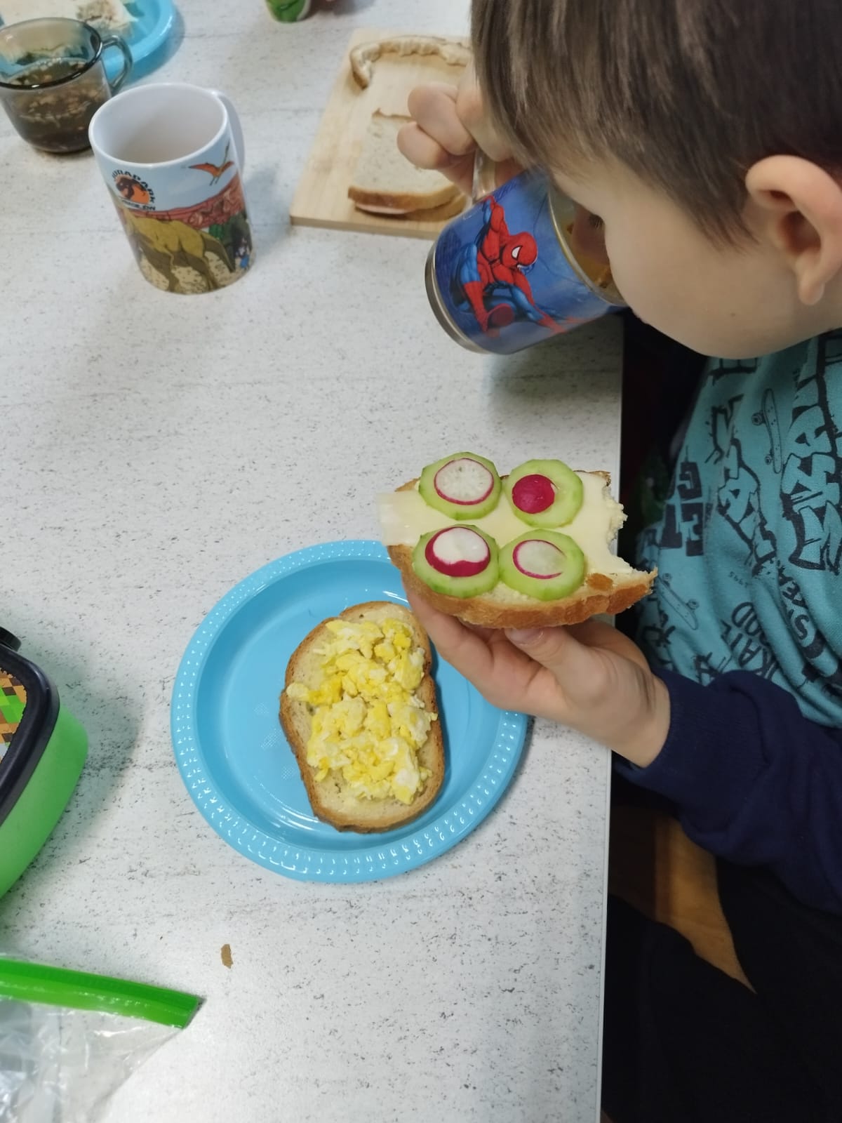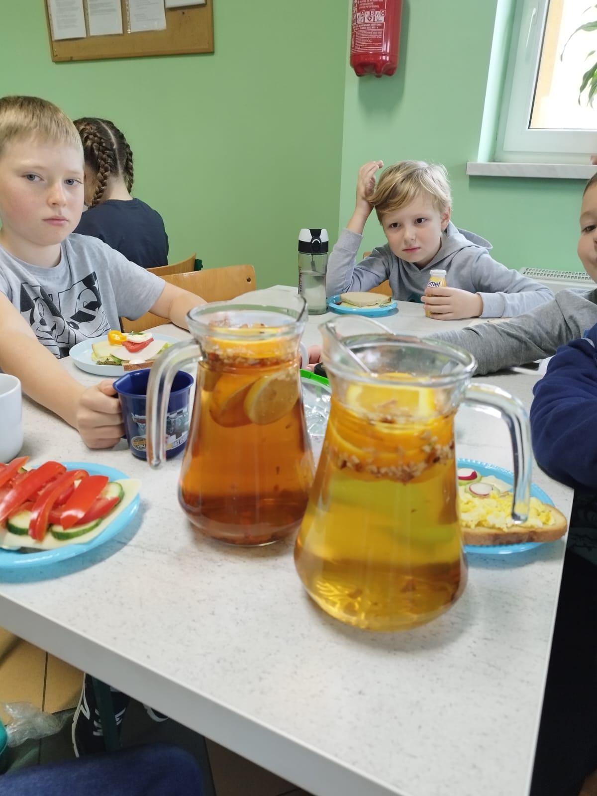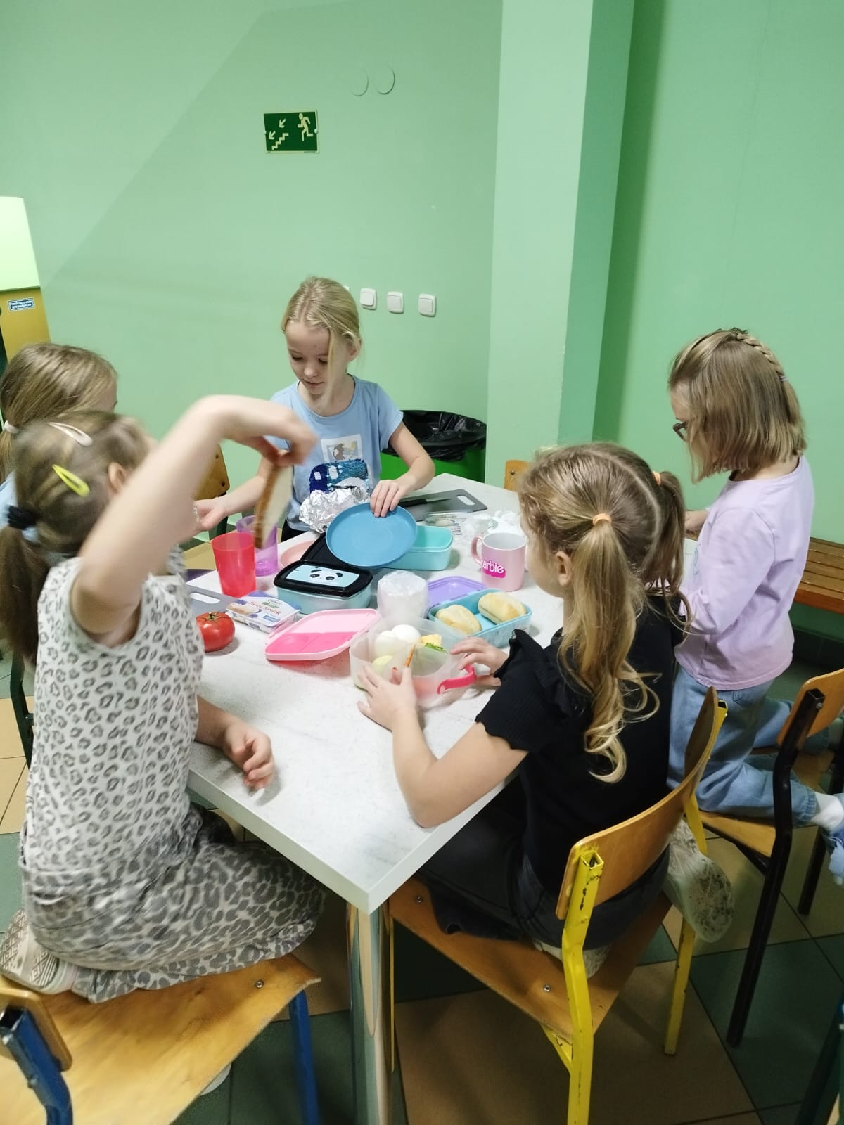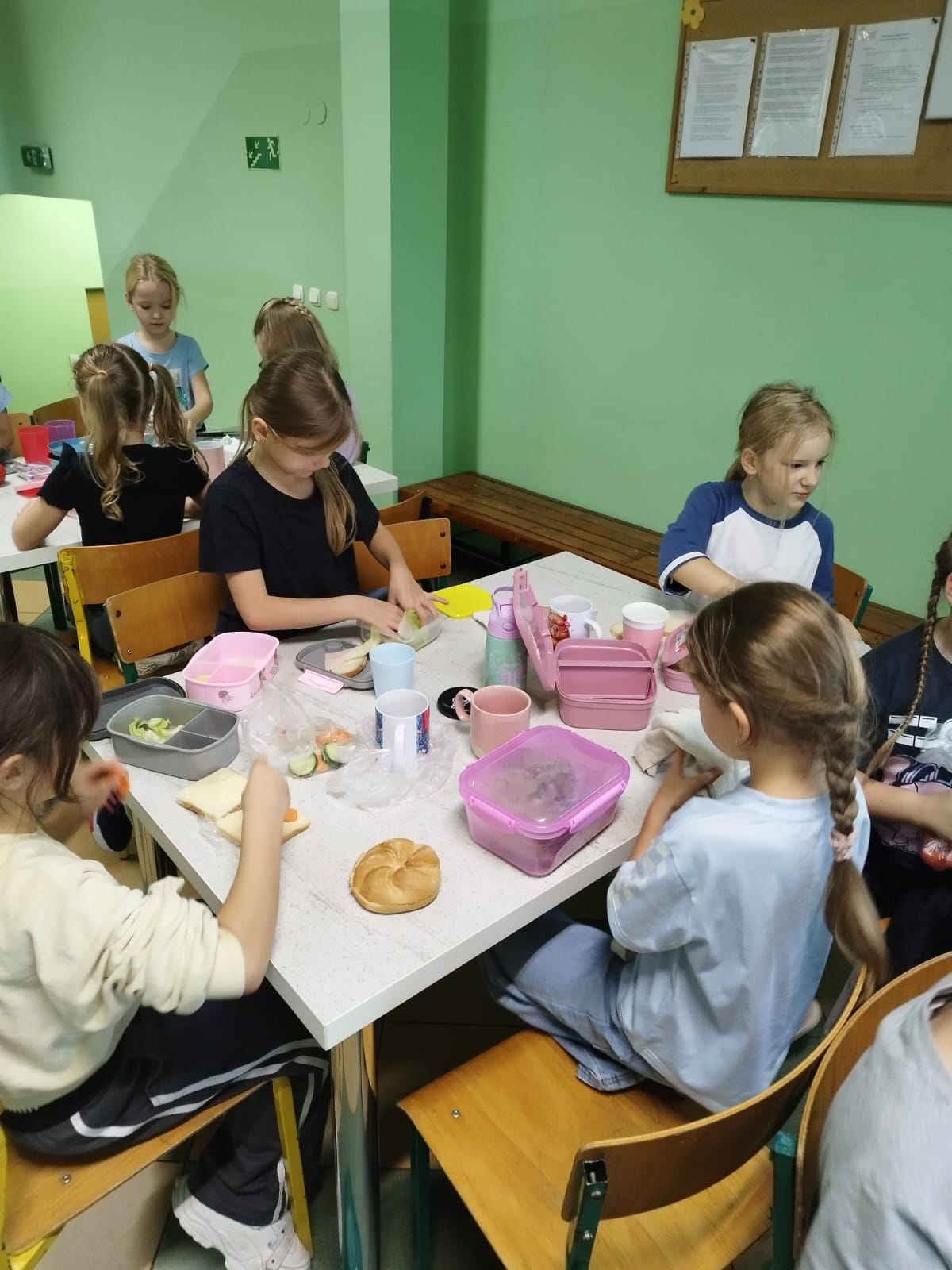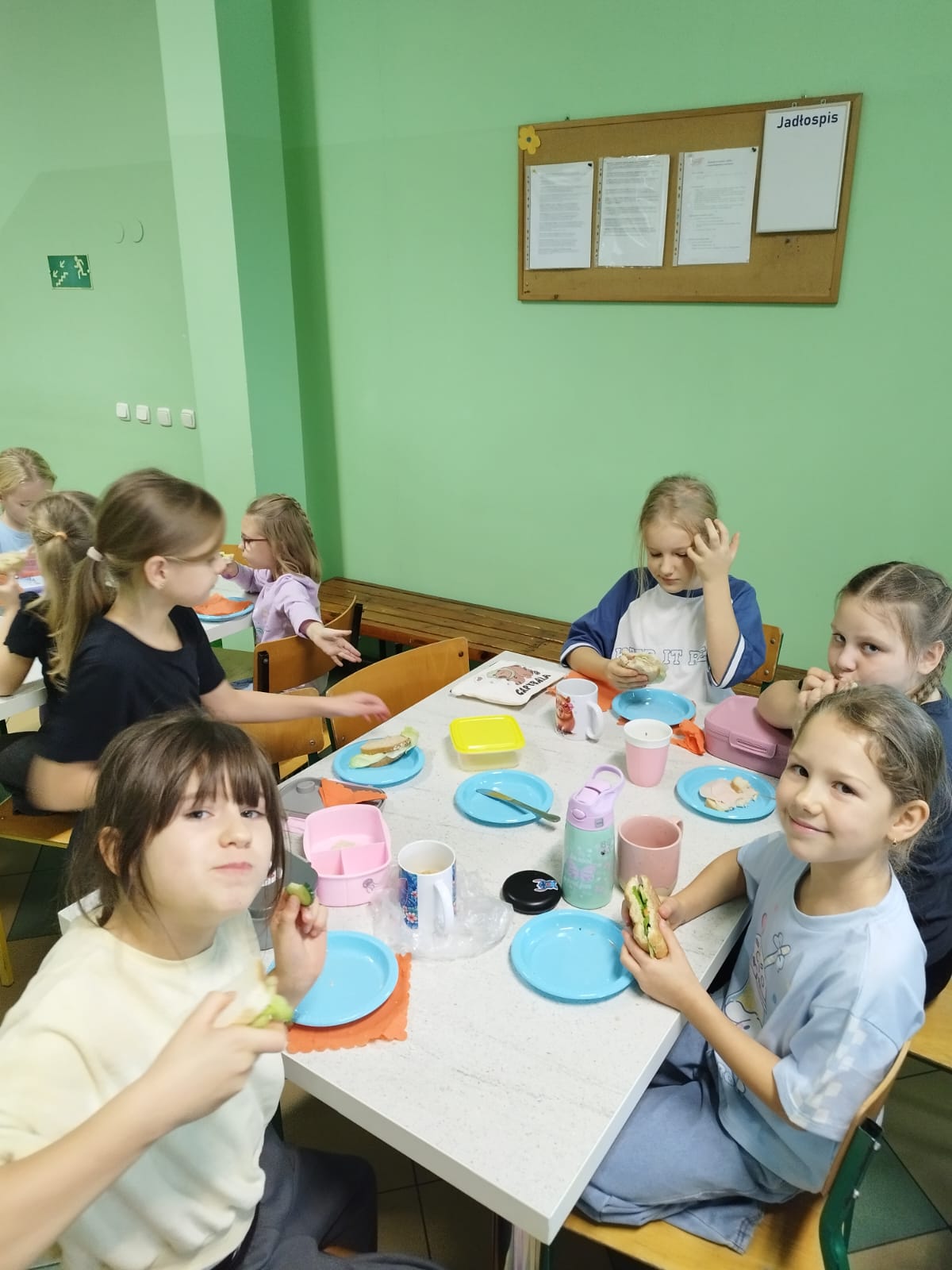 W poniedziałek, 3 listopada, uczniowie klasy drugiej świętowali Dzień Kanapki. Tego dnia na szkolnej stołówce unosiły się zapachy świeżego pieczywa, warzyw i aromatycznej, jesiennej herbaty. Dzieci z ogromnym zaangażowaniem przygotowywały swoje własne, zdrowe kanapki. Każdy mógł samodzielnie skomponować ulubione połączenie smaków, pamiętając o obowiązkowym składniku – warzywie. Na stołach pojawiły się kolorowe pomidory, ogórki, papryka, sałata, szczypiorek, a także ser, wędliny i pasty kanapkowe. Dzięki temu powstały prawdziwe kanapkowe arcydzieła, które nie tylko pięknie wyglądały, ale też znakomicie smakowały. Po wspólnym przygotowaniu kanapek uczniowie zasiedli do stołu, by wspólnie zjeść swoje dzieła i napić się rozgrzewającej jesiennej herbaty z miodem i cytryną. W trakcie posiłku nie zabrakło rozmów, śmiechu i dobrego humoru. To wyjątkowe wydarzenie stało się nie tylko okazją do przypomnienia zasad zdrowego odżywiania, ale również do zacieśniania klasowych więzi i budowania koleżeńskiej atmosfery. Dzieci uczyły się współpracy, dzielenia się i wzajemnej pomocy – bo nic tak nie łączy, jak wspólne gotowanie i wspólne jedzenie. Na koniec wszyscy zgodnie stwierdzili, że taka lekcja smaku i przyjaźni mogłaby odbywać się częściej!