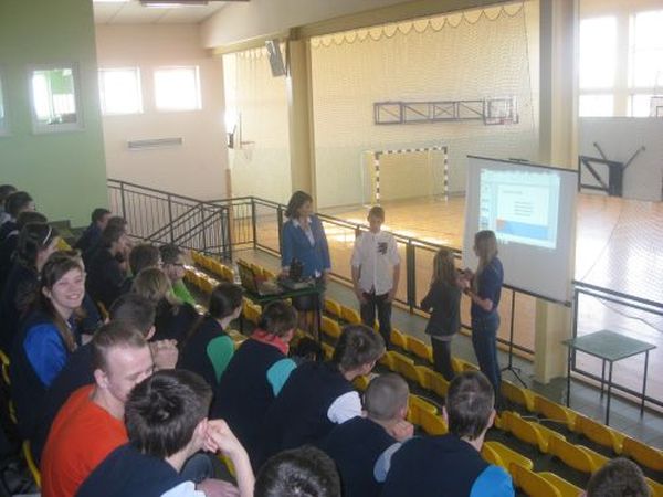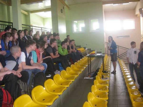 W ramach poradnictwa edukacyjno – zawodowego do naszego gimnazjum przyjechali przedstawiciele Szkoły Mistrzostwa Sportowego z Raciborza, nauczycielka j. angielskiego p. Katarzyna Ochwat – Tomaszewska wraz z trójką uczniów. Zaprezentowali oni krótki film oraz zapoznali trzecioklasistów z ofertą edukacyjną swojej szkoły.