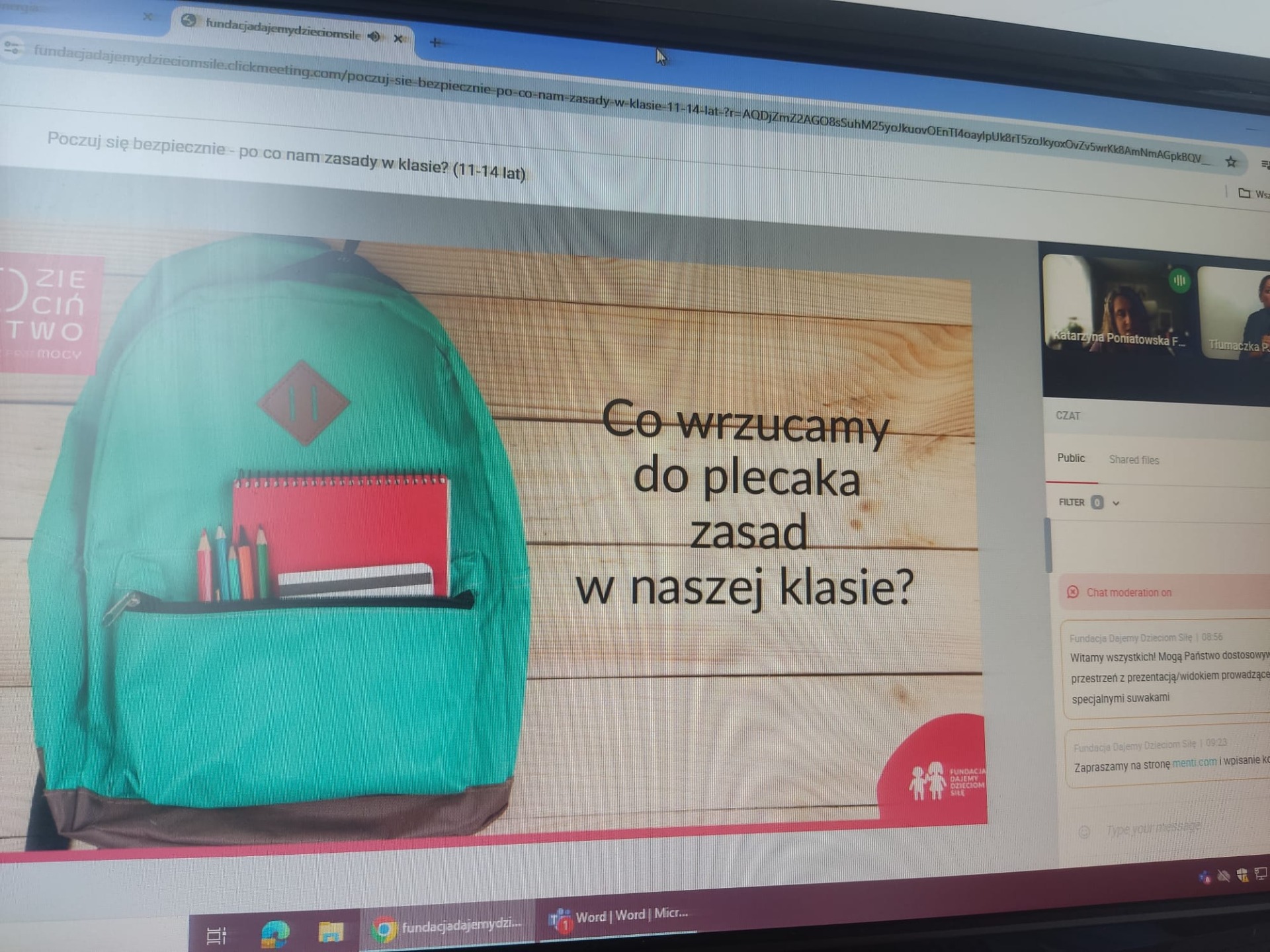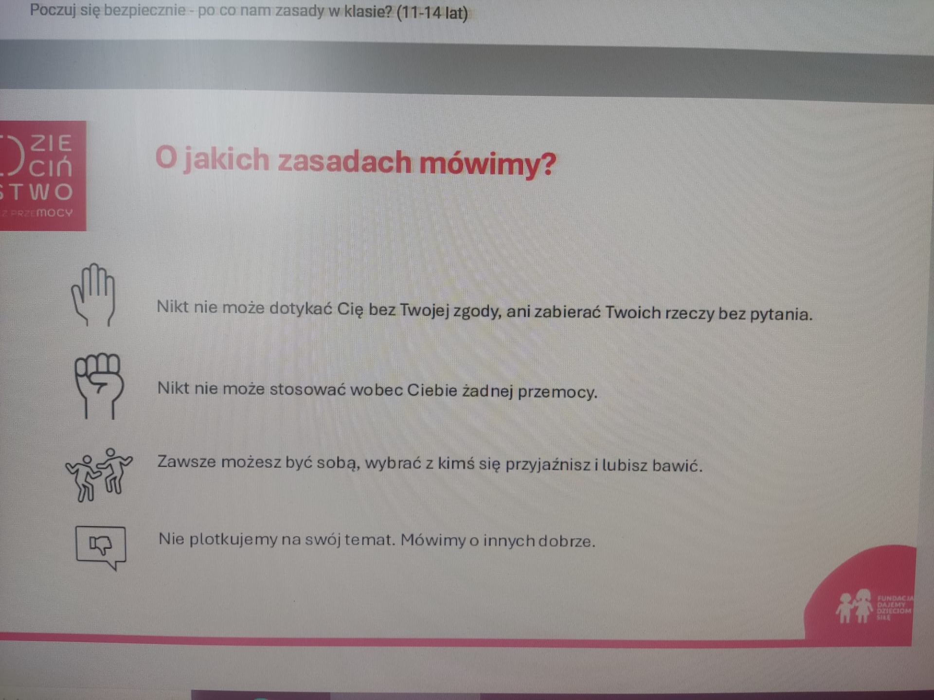 W czwartek, 13 listopada, uczniowie klasy 5 wzięli udział w kolejnej lekcji online w ramach kampanii „Dzieciństwo bez Przemocy” organizowanej przez Fundację Dajemy Dzieciom Siłę - „Poczuj się bezpiecznie - po co nam zasady w klasie?”.