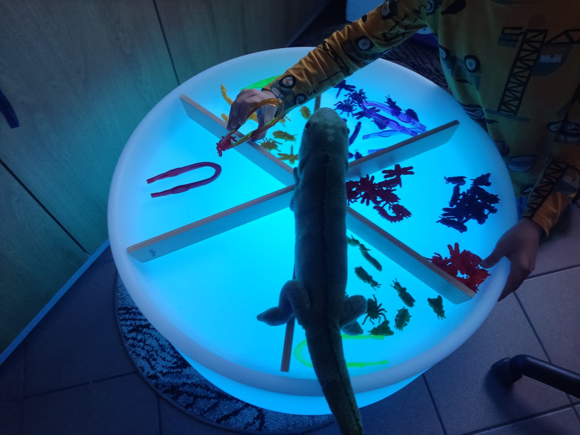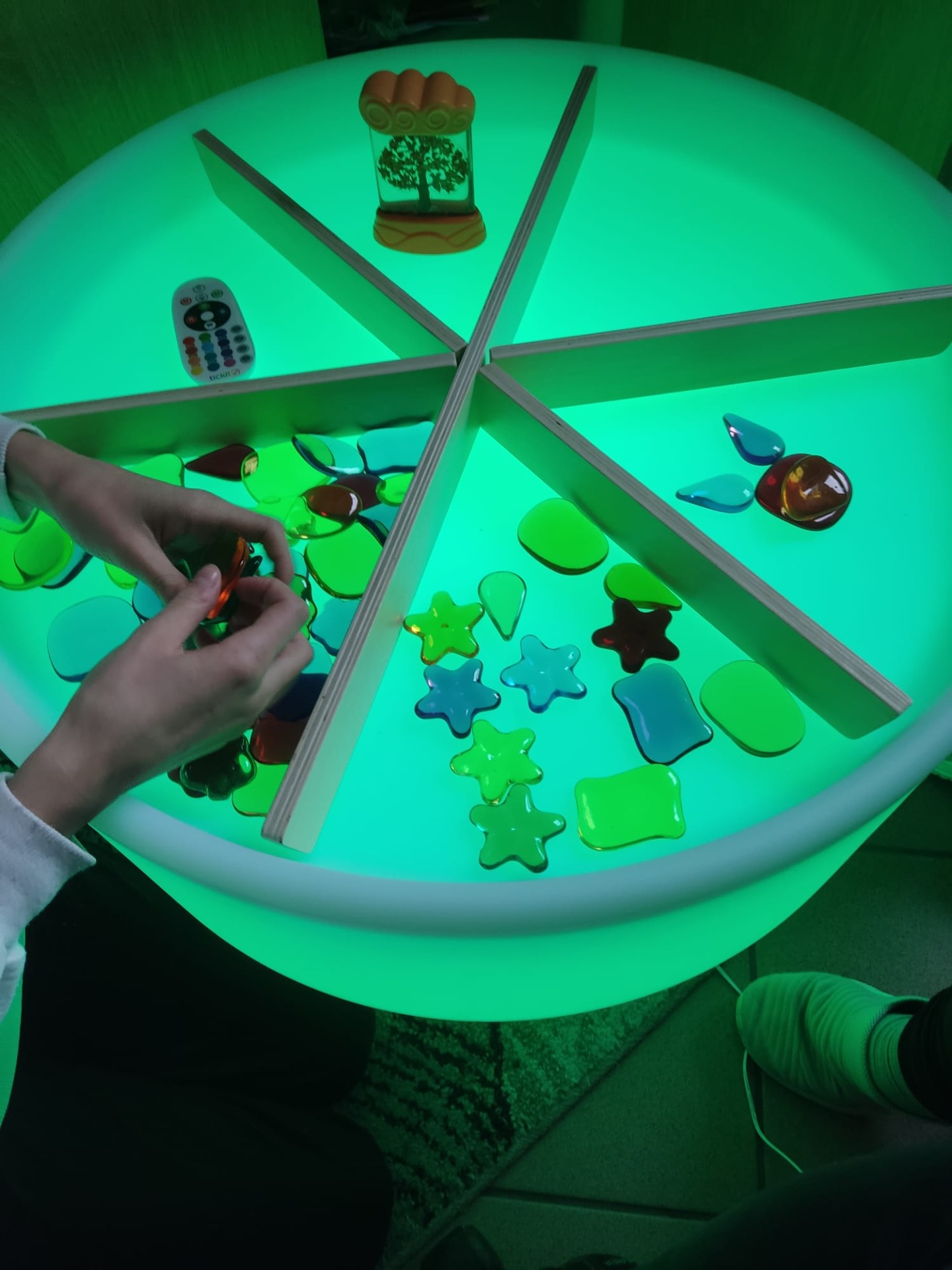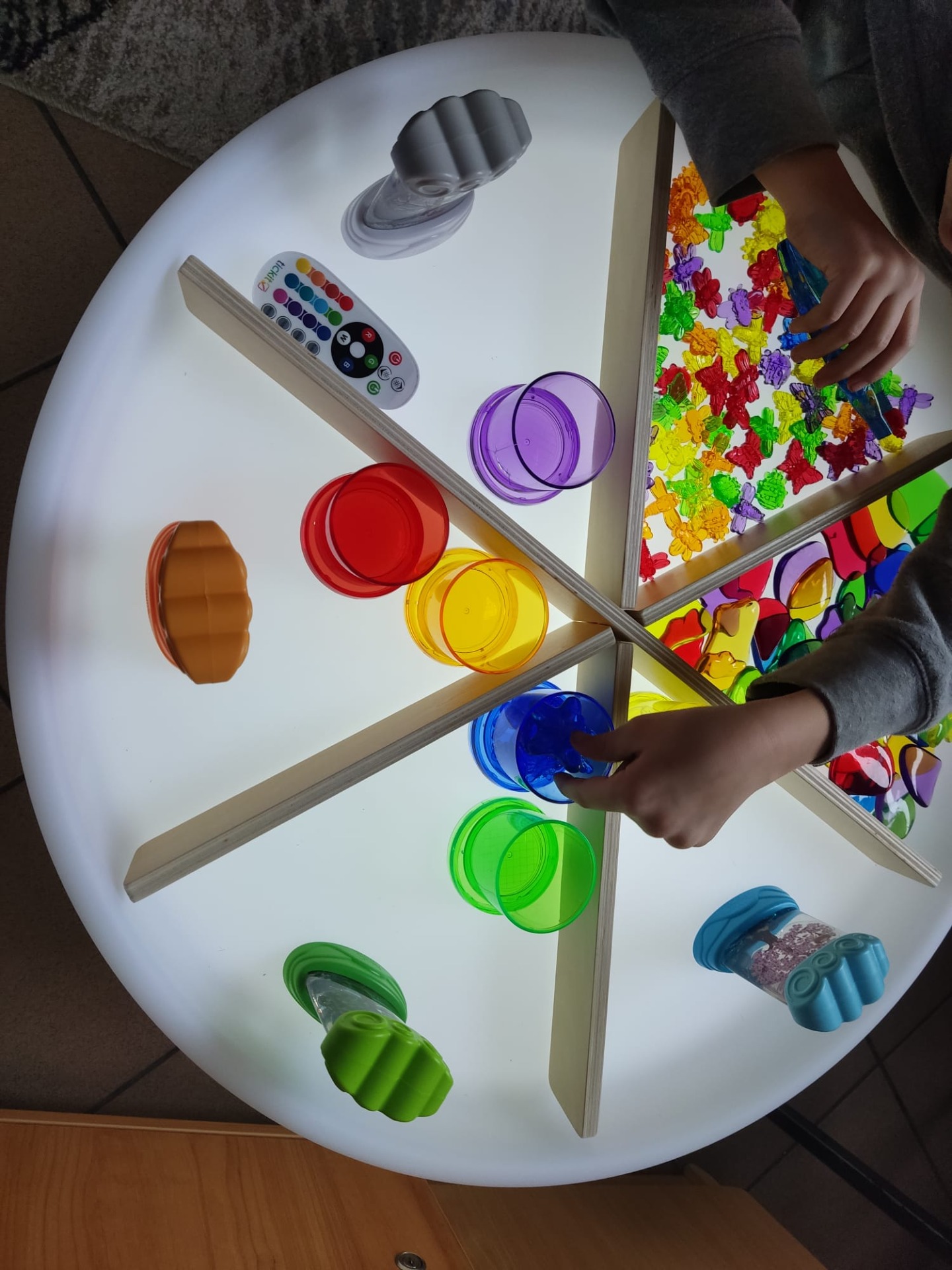 W ostatnim czasie wzbogaciliśmy gabinet o podświetlany stolik, który otwiera przed uczniami wiele nowych możliwości. To atrakcyjne i nowoczesne narzędzie pozwala dzieciom działać w sposób polisensoryczny. Światło, kolory i możliwość manipulowania różnorodnymi elementami sprawiają, że ćwiczenia stają się ciekawsze i bardziej motywujące.