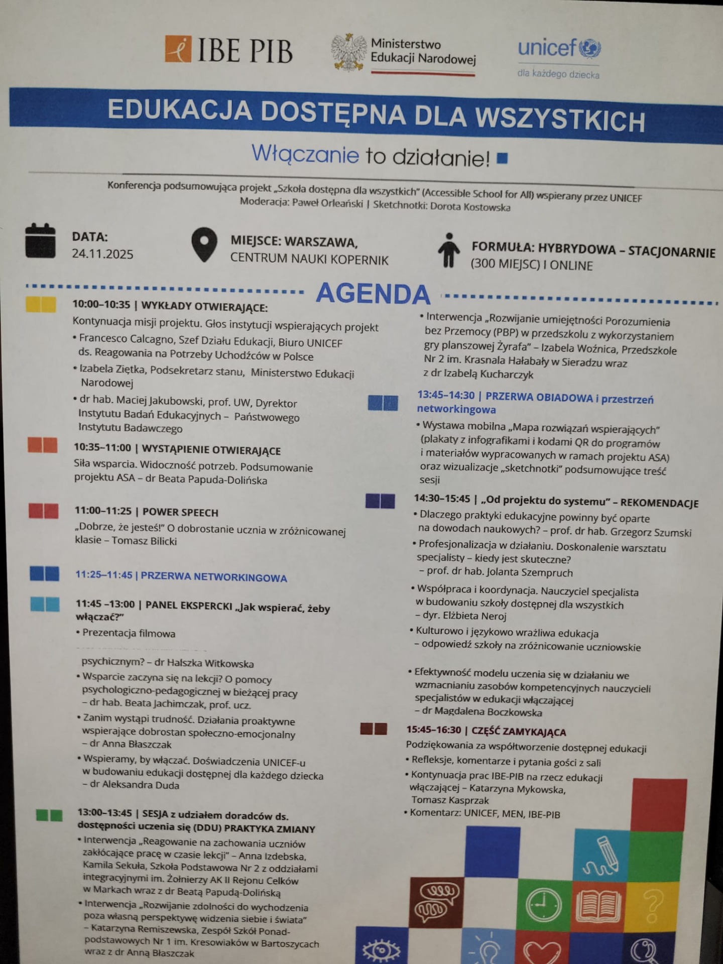 Dwa lata trwały liczne i różnorodne działania, których celem było poznawanie sposobów wdrażania zasad edukacji włączającej. Efektem jest zwiększona świadomość potrzeb dzieci ze specyficznymi trudnościami w uczeniu się czy funkcjonowaniu w grupie. 24 listopada w Warszawie odbyła się konferencja podsumowująca, w której uczestniczyły szkoły uczestniczące w programie. Nasza szkoła otrzymała certyfikat potwierdzający wykonanie wszystkich zadań, a koordynator projektu, p. Katarzyna Franica otrzymała mikropoświadczenie nadające uprawnienia DDU, czyli doradcy dostępności uczenia się. A wszystko po to, żeby każde dziecko czuło się w naszej szkole dobrze.