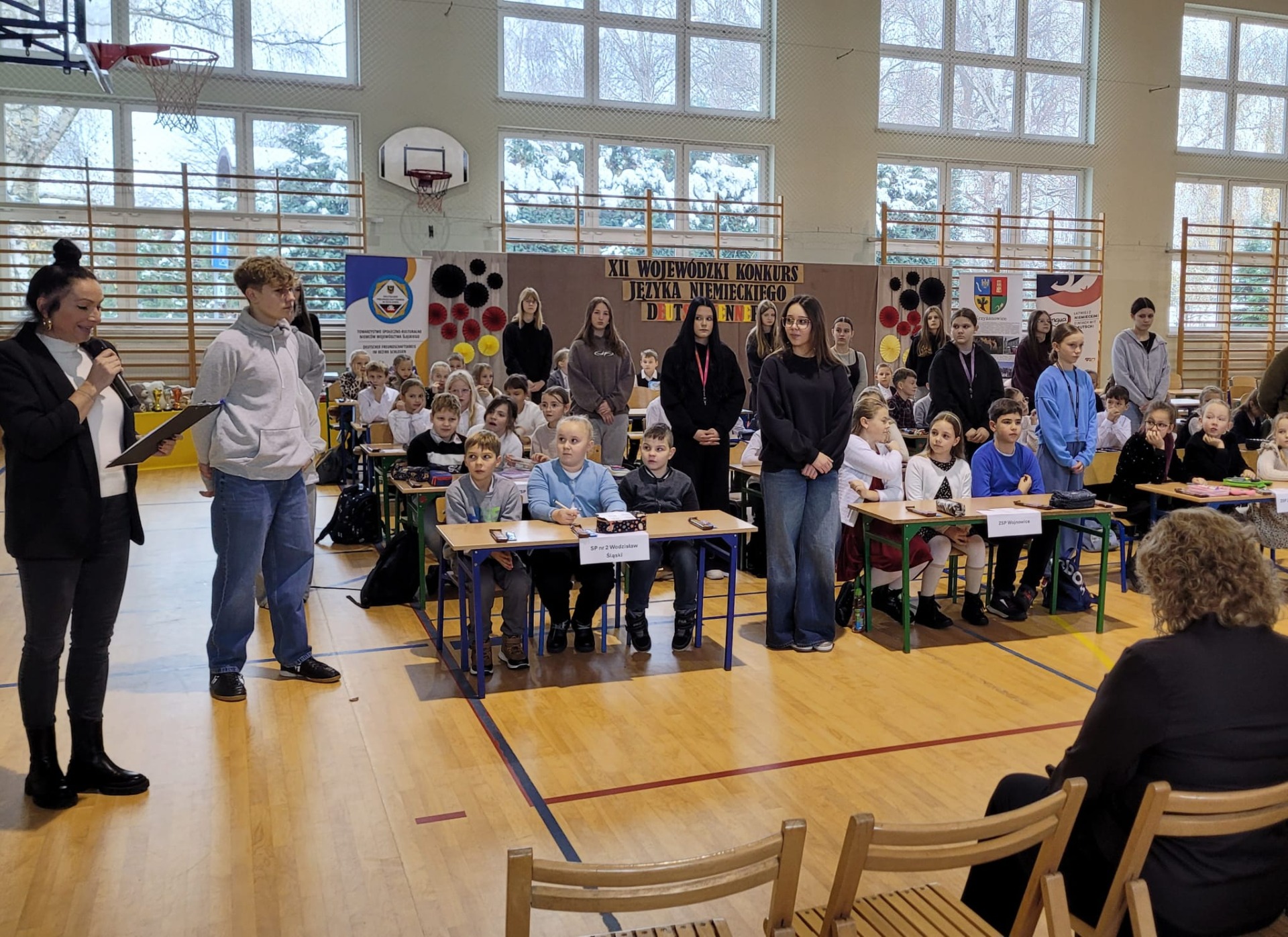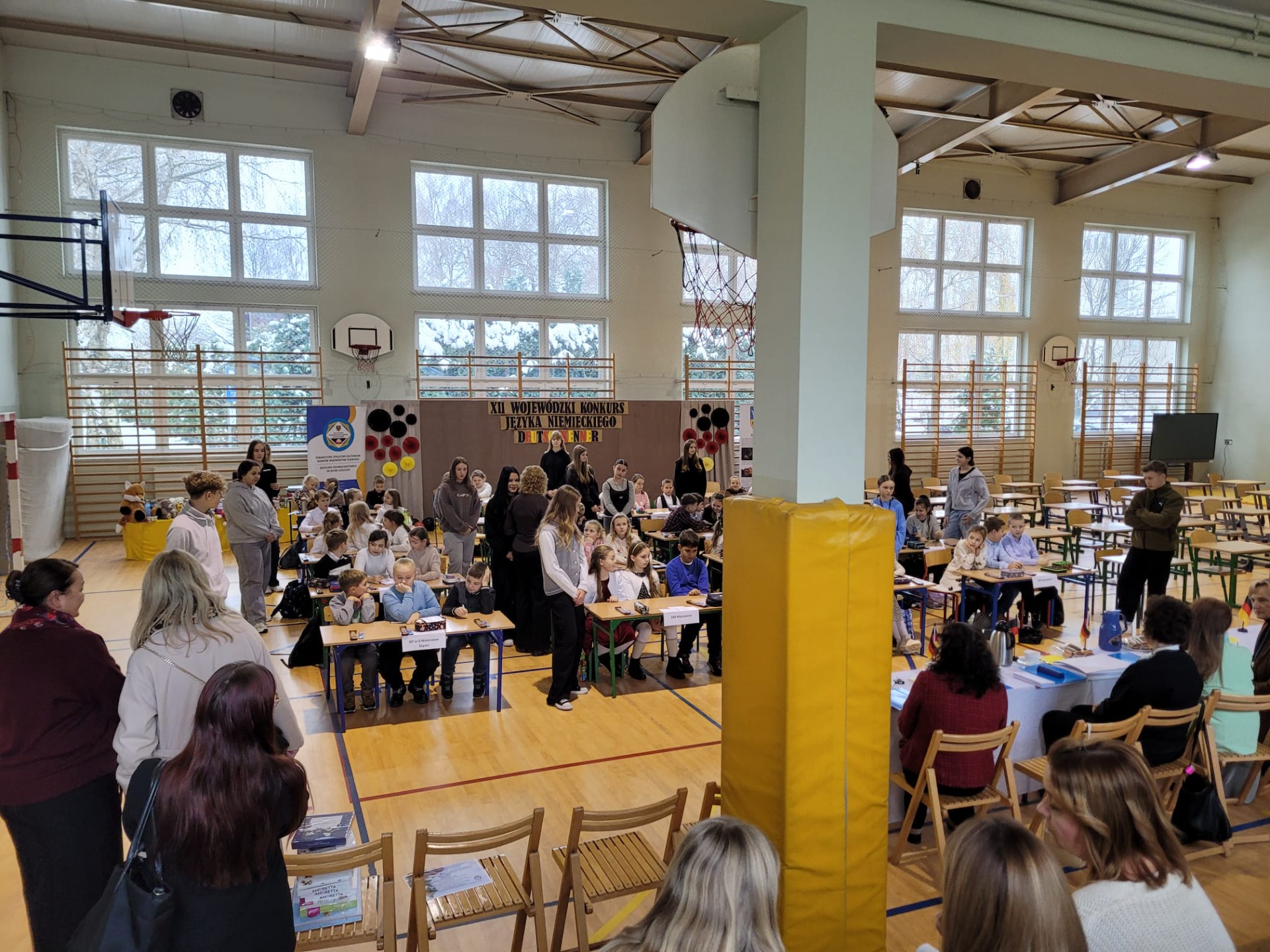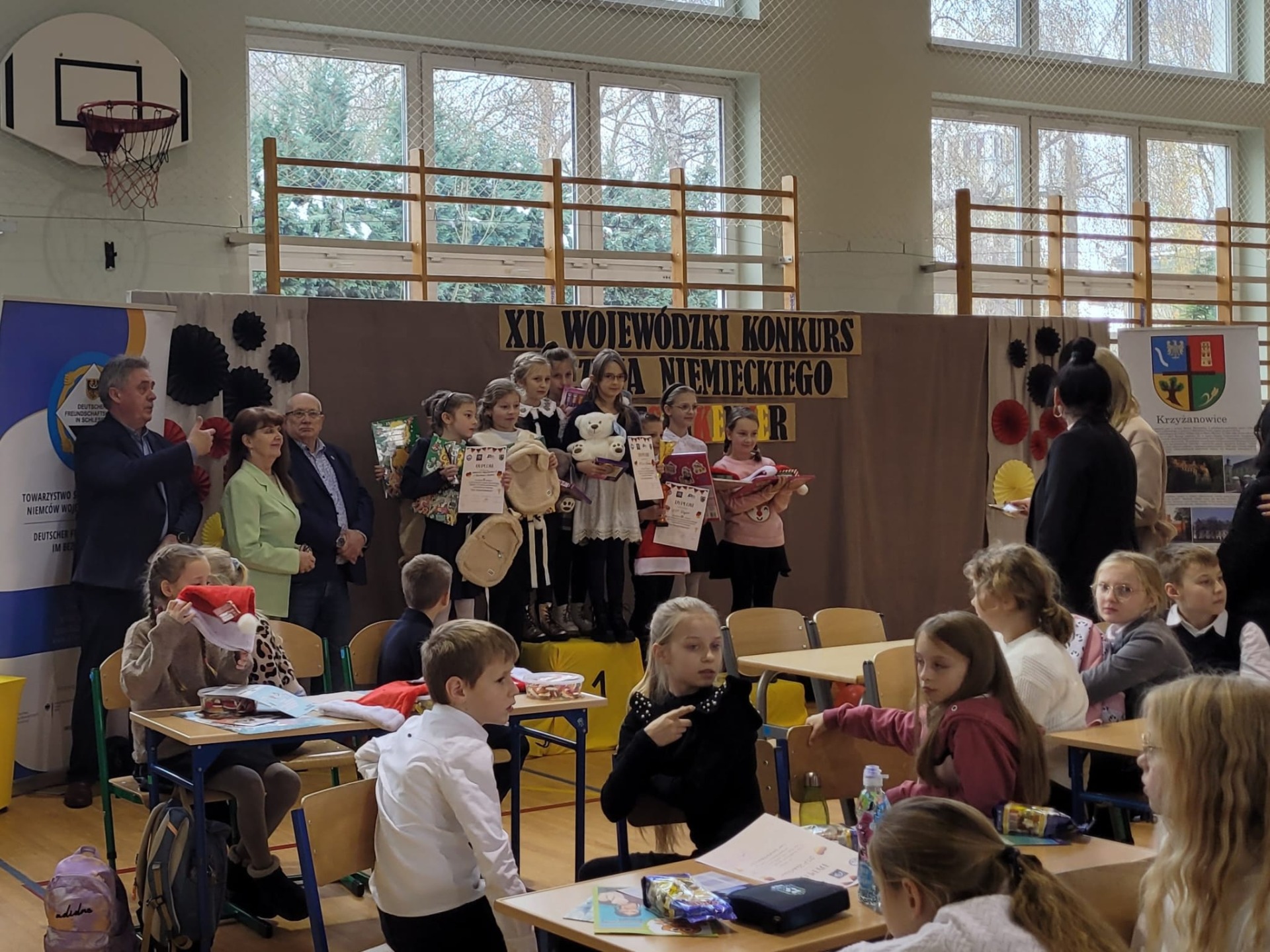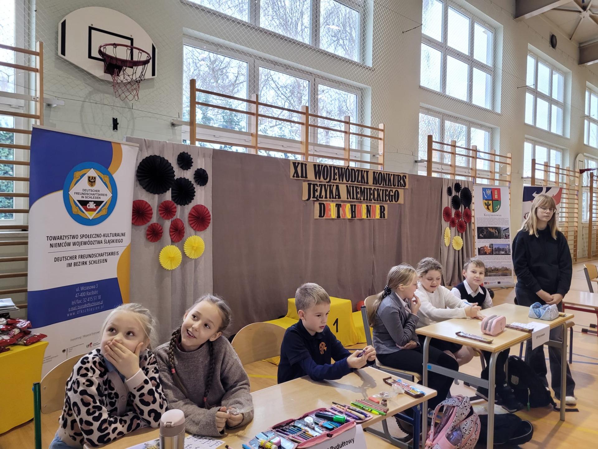 Wchodząc na salę gimnastyczną szkoły w Zabełkowie ze zdziwienia szeroko otworzyliśmy oczy. Nie spodziewaliśmy się, że w konkursie będzie uczestniczyło 60 osób z 20 drużyn. Postawiliśmy więc na zdobywanie doświadczenia i zabawę. Najpierw od 9.15 był godzinny test drużynowy, potem zadania indywidualne, czas na przekąskę i film. W tym czasie nasza Pani na warsztatach artystycznych wykonywała świąteczne upominki. W końcu o godz. 12.45 zaczęło się podsumowanie. I chociaż nasza drużyna nie stanęła na podium, to i tak wracamy bogatsi. Zobaczyliśmy, jak wiele dzieci uczy się języka niemieckiego i jak dobrze się nim posługuje. Wiemy też, że na sukces trzeba dużo pracować.