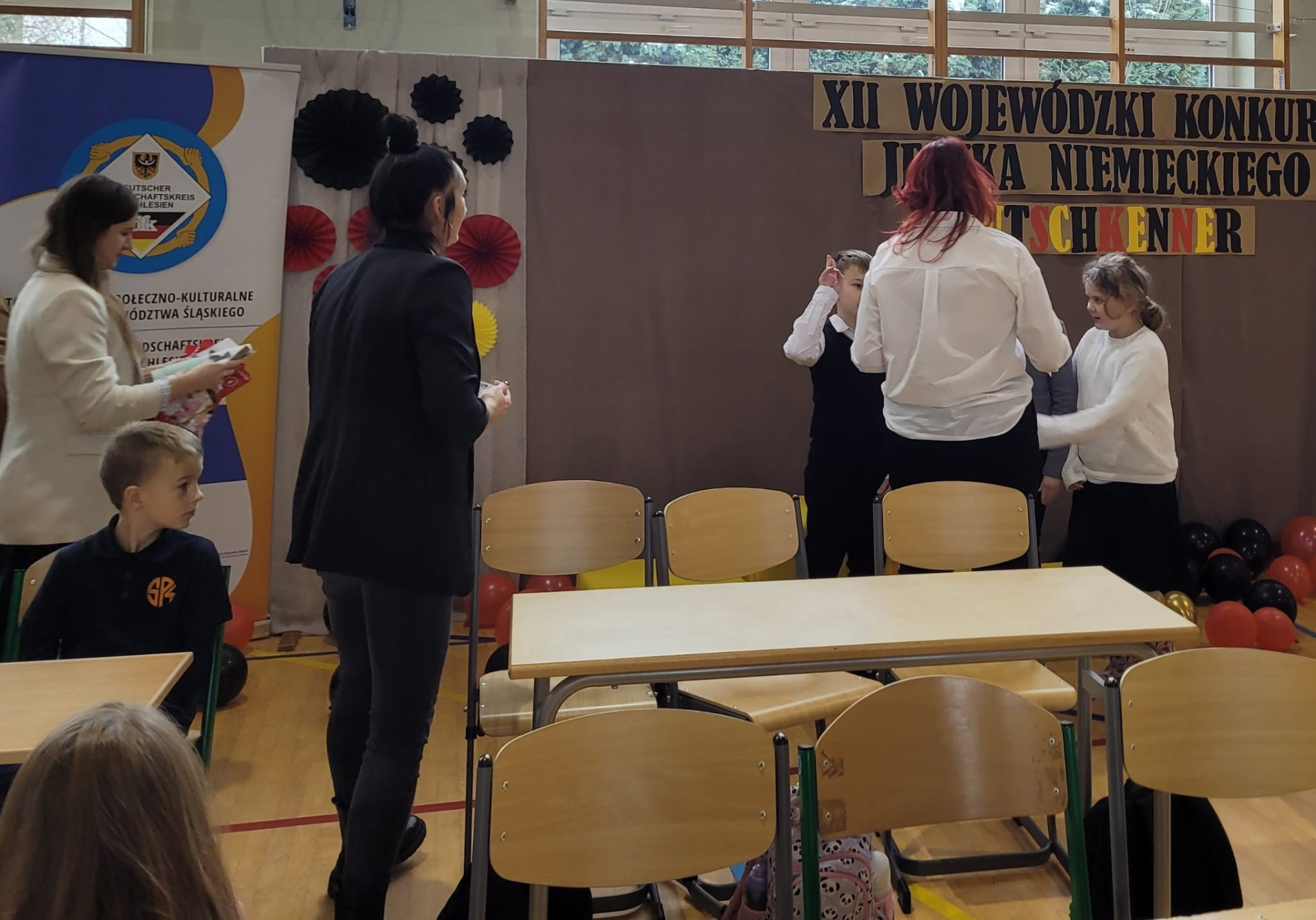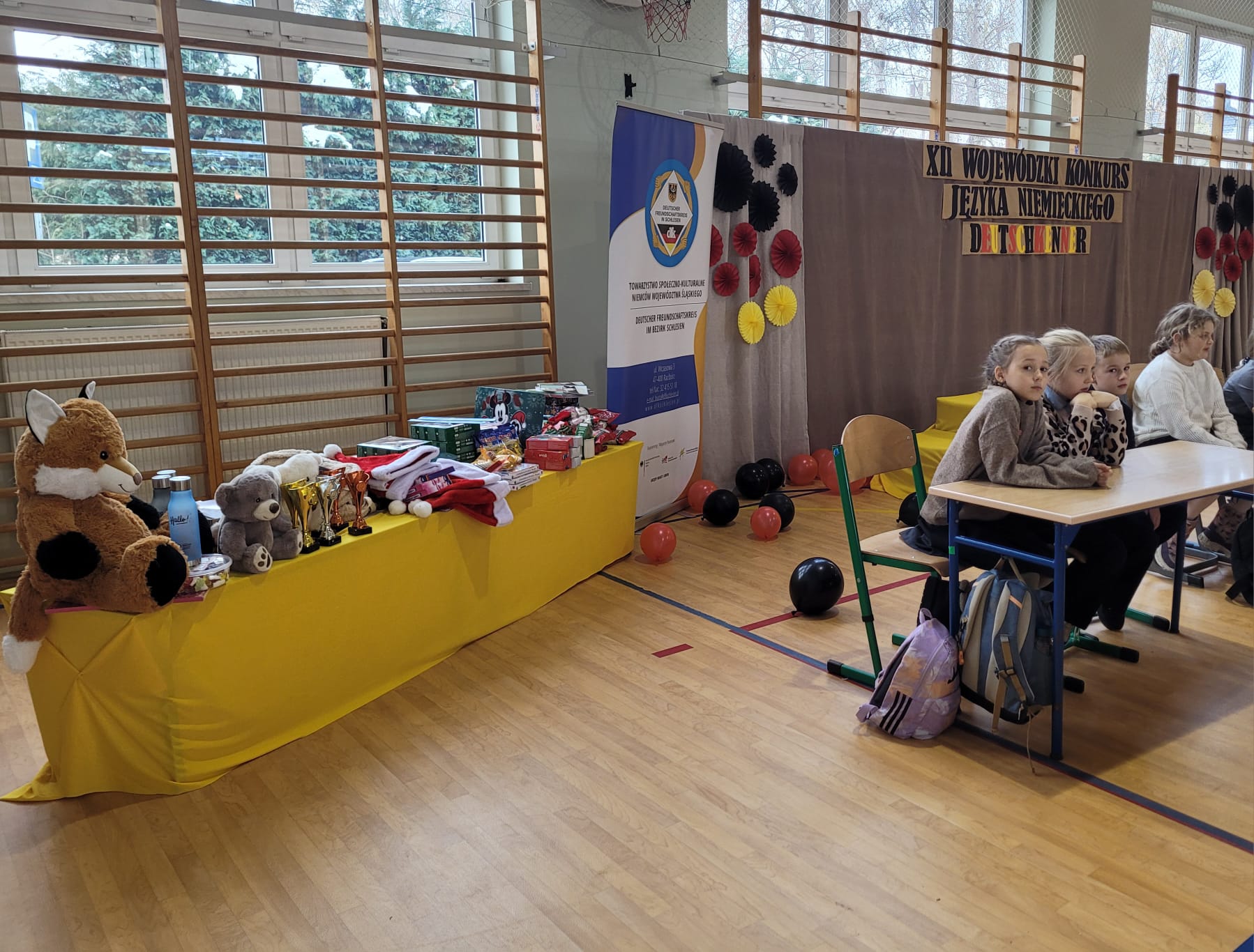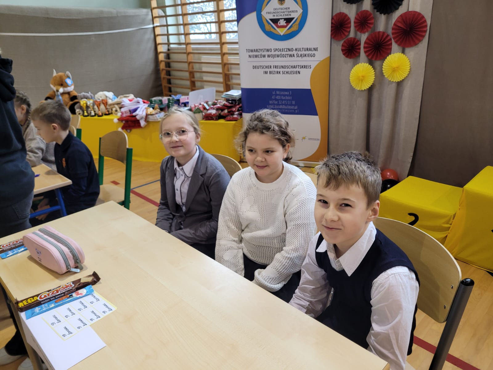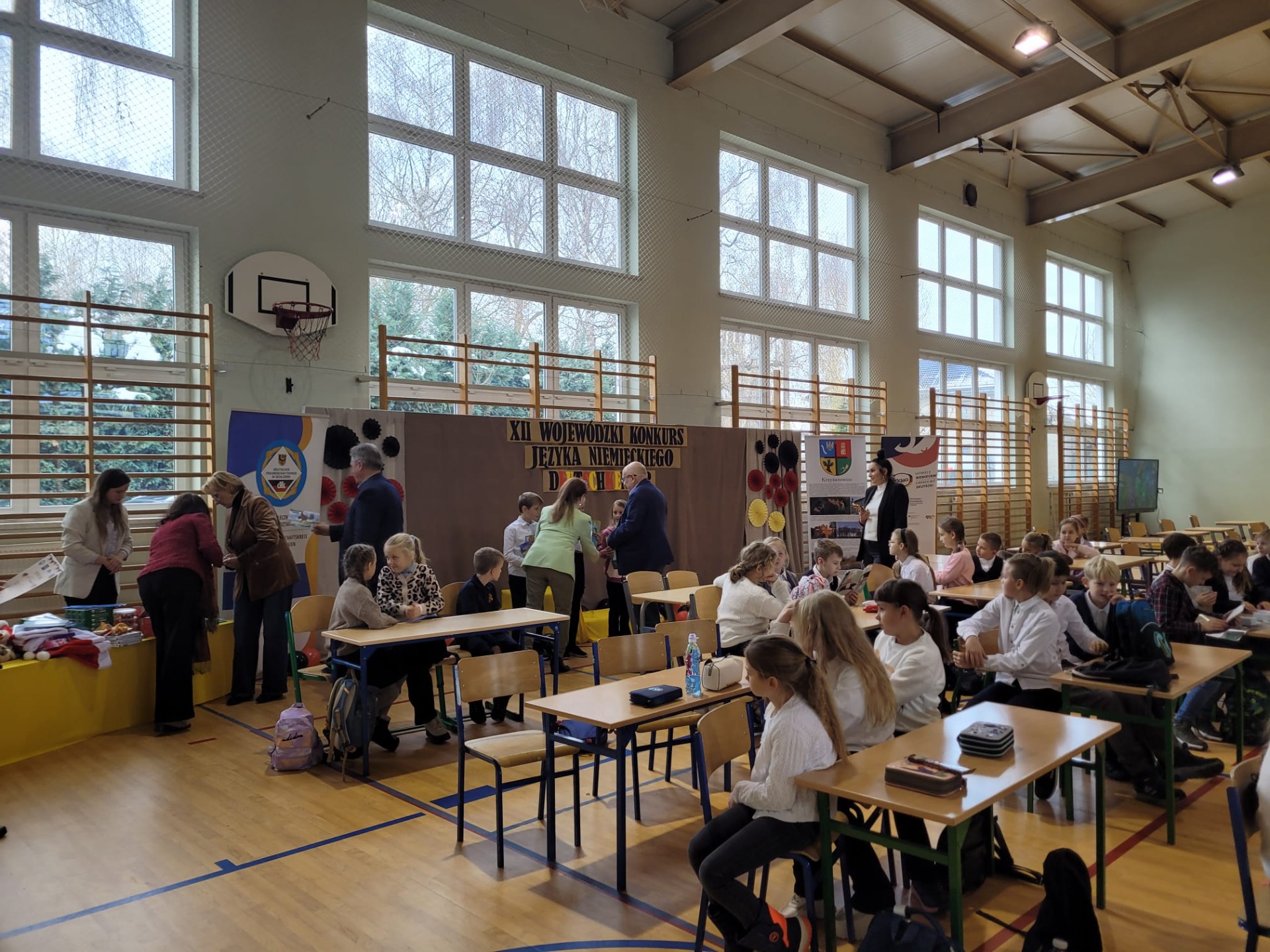 Wchodząc na salę gimnastyczną szkoły w Zabełkowie ze zdziwienia szeroko otworzyliśmy oczy. Nie spodziewaliśmy się, że w konkursie będzie uczestniczyło 60 osób z 20 drużyn. Postawiliśmy więc na zdobywanie doświadczenia i zabawę. Najpierw od 9.15 był godzinny test drużynowy, potem zadania indywidualne, czas na przekąskę i film. W tym czasie nasza Pani na warsztatach artystycznych wykonywała świąteczne upominki. W końcu o godz. 12.45 zaczęło się podsumowanie. I chociaż nasza drużyna nie stanęła na podium, to i tak wracamy bogatsi. Zobaczyliśmy, jak wiele dzieci uczy się języka niemieckiego i jak dobrze się nim posługuje. Wiemy też, że na sukces trzeba dużo pracować.