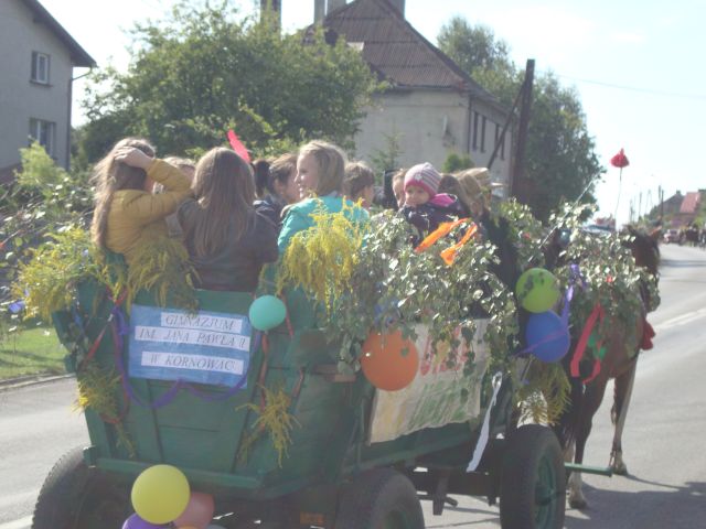 Nasi gimnazjaliści wraz z opiekunami wzięli udział w gminnych dożynkach w Kornowacu. W niedzielne przedpołudnie wszyscy zaangażowani uczniowie zebrali się w szkole, aby udekorować obejście szkoły, budynek oraz wóz dożynkowy, który udostępnił nam pan Dariusz Bugdol. W czasie przejazdu korowodu uczniowie śpiewali piosenki, wiwatowali, pozdrawiali mieszkańców Kornowaca oraz przybyłych gości. Korowód dożynkowy na boisku witał pan wójt Grzegorz Niestrój wraz z gośćmi i starostami dożynek.