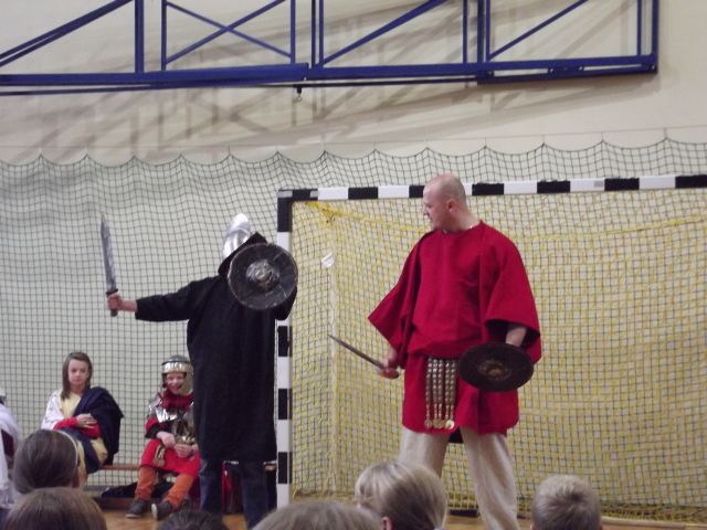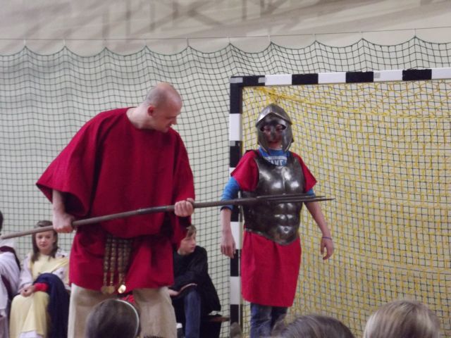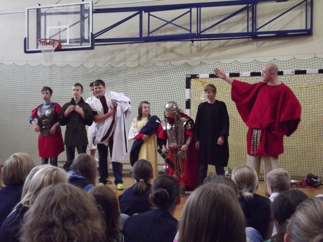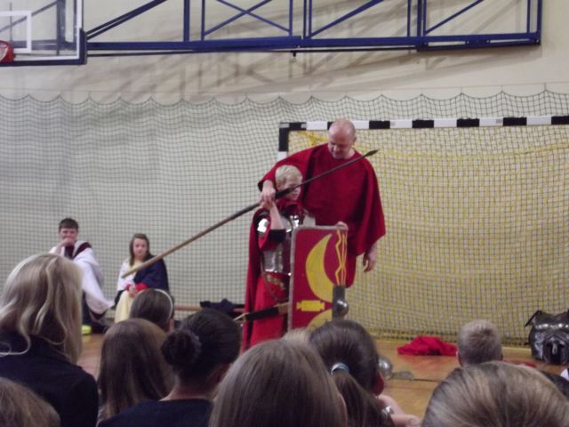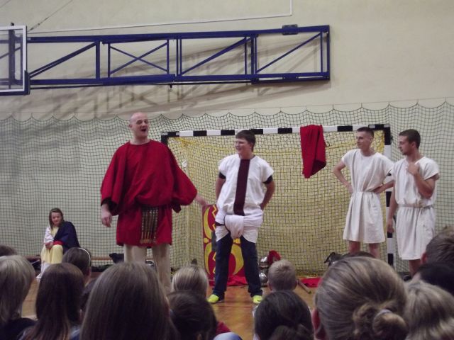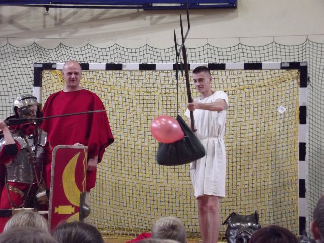 Żywe lekcje historii to już tradycja naszej szkoły. Co roku gościmy panów z Bractwa Rycerskiego w Gniewie, którzy pozwalają naszym gimnazjalistom w sposób ciekawy przyswoić wiedzę z historii. Tym razem spotkaliśmy się 24 września, a tematem naszego spotkania był starożytny Rzym. Mistrz gniewskiego bractwa szczegółowo przedstawił nam kulturę i politykę oraz życie codzienne starożytnych Rzymian. Kilku naszych kolegów i koleżanek mogło doświadczyć tego, jak żyli starożytni Rzymianie poprzez ubiór w zaprezentowane nam stroje.