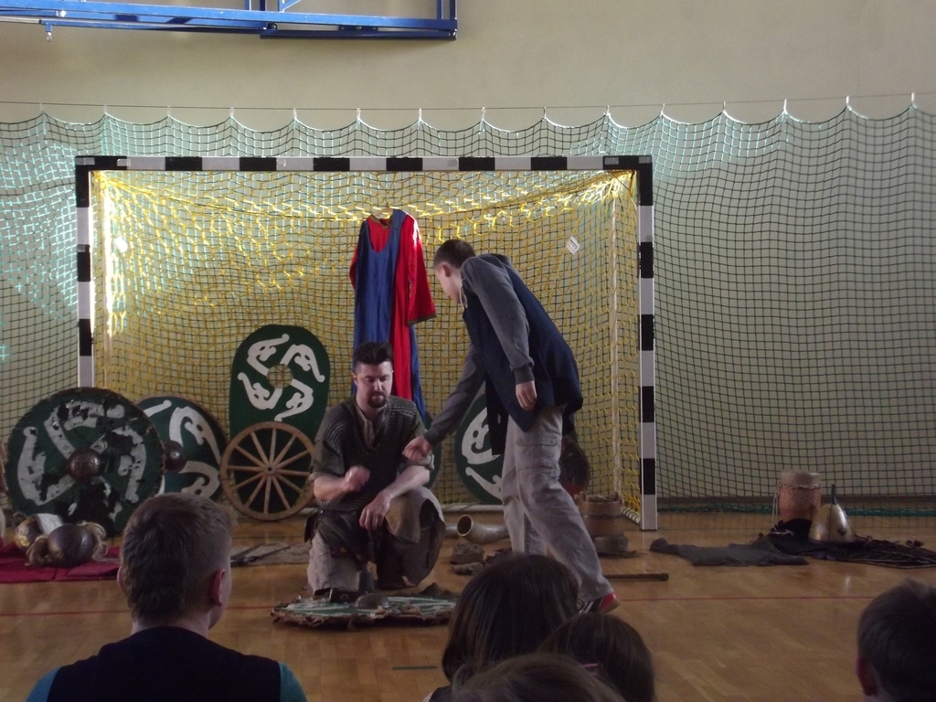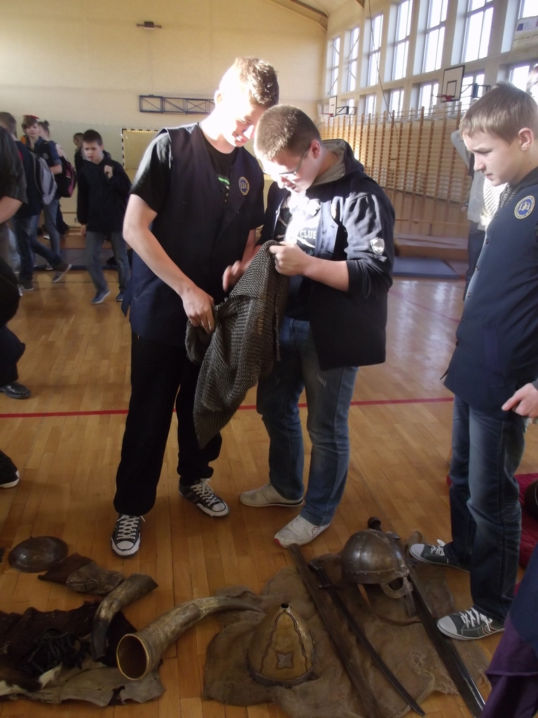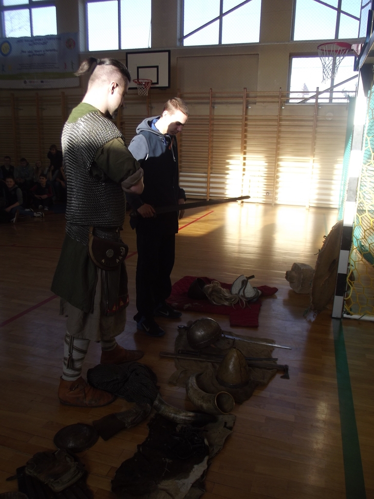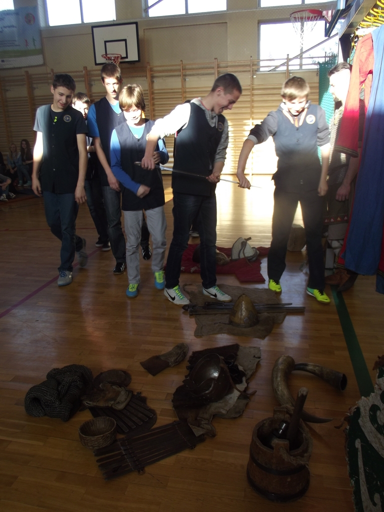 Były to interaktywne zajęcia stanowiące przygodę, w czasie której przekazana została uczniom w nietypowy sposób najdawniejsza historia Polski od X do XII w. Wiedza, którą zdobywali gimnazjaliści, docierała do nich w sposób nie tylko słowny, ale przede wszystkim obrazowy i praktyczny, gdyż ochotnicy brali czynny udział w pokazie walk wojów, wcielając się w role postaci historycznych. Dla najpilniejszych uczniów tej lekcji przewidziany był konkurs z nagrodami sprawdzający zdobytą wiedzę. Każdy jego uczestnik za poprawne odpowiedzi w nagrodę otrzymał wybitą specjalnie dla niego monetę- replikę denarów Bolesława Chrobrego. Na koniec zajęć był czas na obejrzenie z bliska przywiezionych rekwizytów: przedmiotów codziennego użytku (ceramiki, beczek, rogów do picia i grania, skór) strojów czy elementów zbroi.