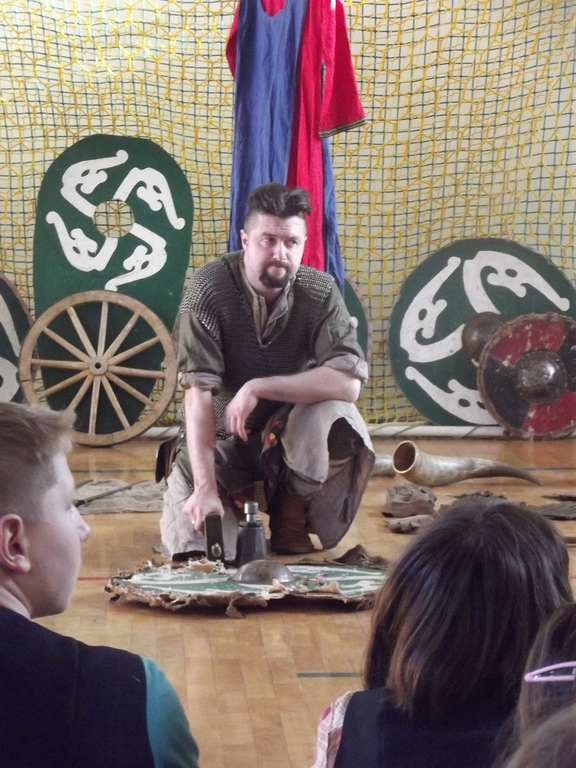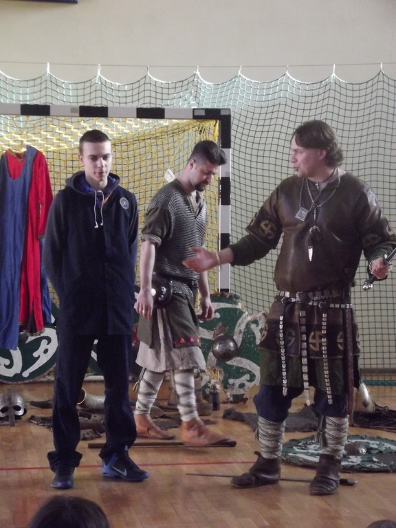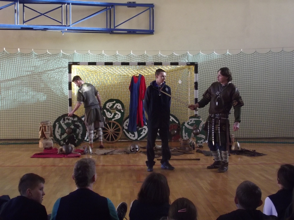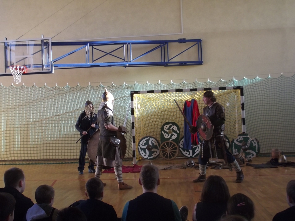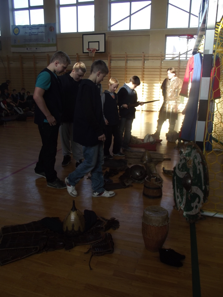 Były to interaktywne zajęcia stanowiące przygodę, w czasie której przekazana została uczniom w nietypowy sposób najdawniejsza historia Polski od X do XII w. Wiedza, którą zdobywali gimnazjaliści, docierała do nich w sposób nie tylko słowny, ale przede wszystkim obrazowy i praktyczny, gdyż ochotnicy brali czynny udział w pokazie walk wojów, wcielając się w role postaci historycznych. Dla najpilniejszych uczniów tej lekcji przewidziany był konkurs z nagrodami sprawdzający zdobytą wiedzę. Każdy jego uczestnik za poprawne odpowiedzi w nagrodę otrzymał wybitą specjalnie dla niego monetę- replikę denarów Bolesława Chrobrego. Na koniec zajęć był czas na obejrzenie z bliska przywiezionych rekwizytów: przedmiotów codziennego użytku (ceramiki, beczek, rogów do picia i grania, skór) strojów czy elementów zbroi.